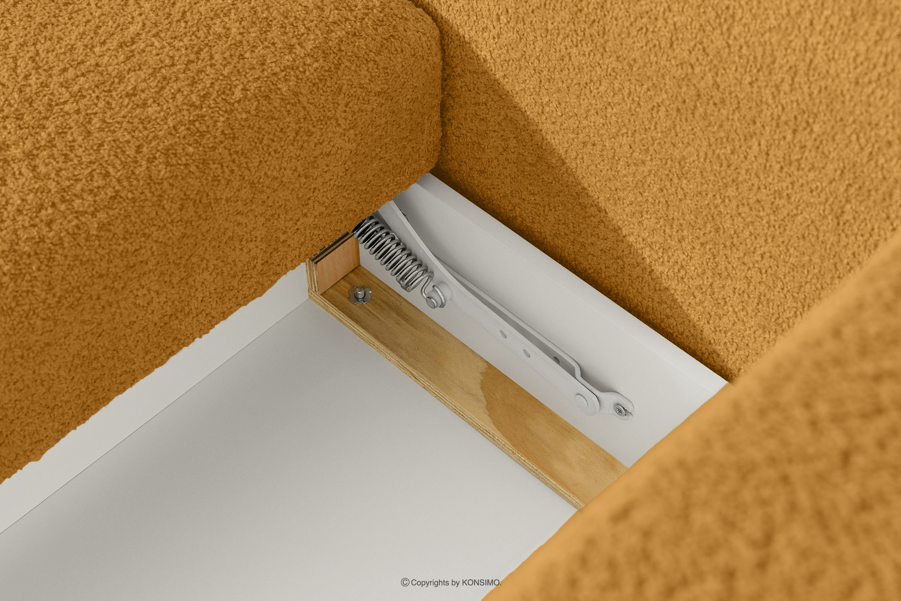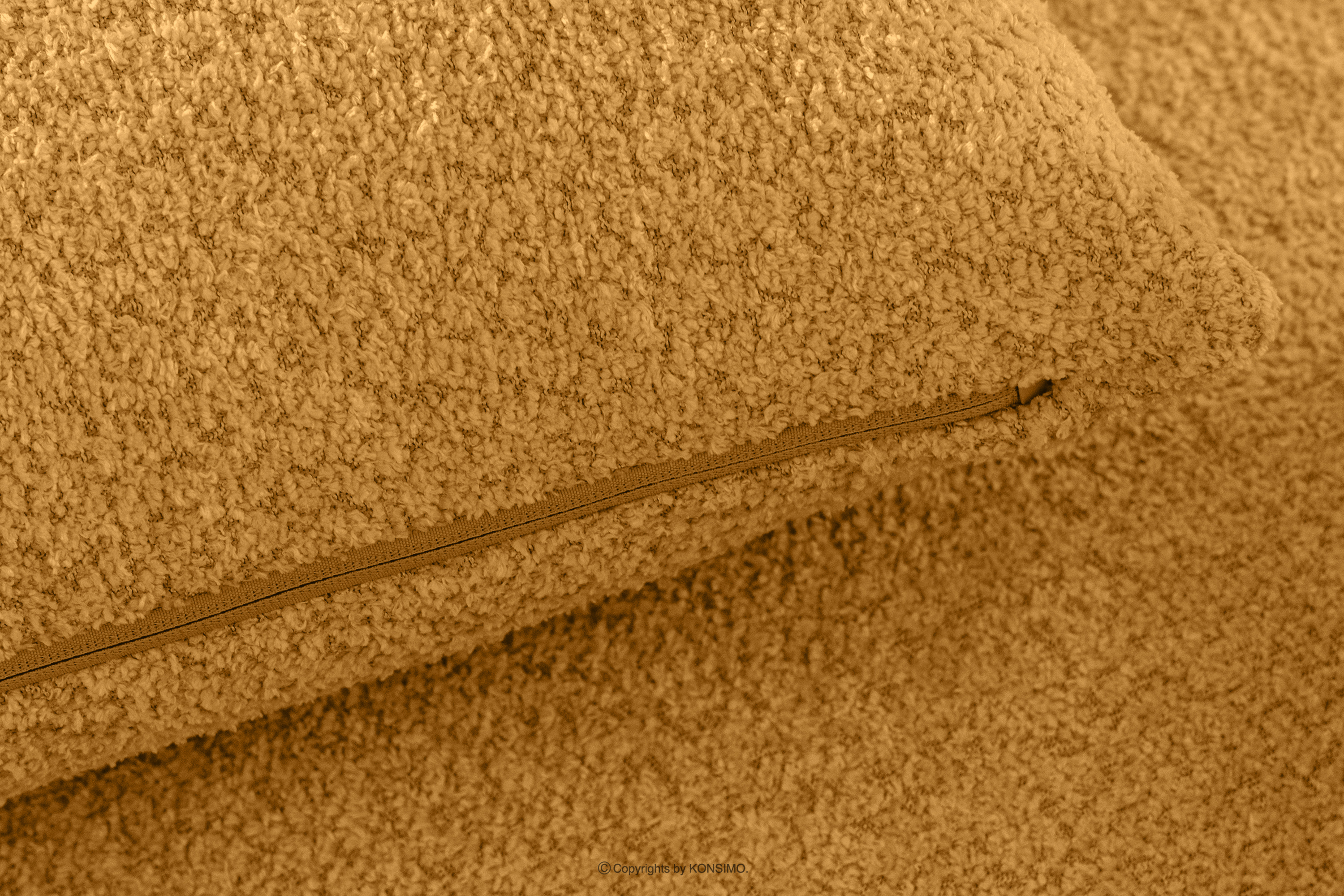 Linkes Ecksofa und Sessel im japanischen Stil Bouclé honigfarben revolutioniert das Konzept der Erholung. Das Herzstück ist ein innovativer Sitz, dessen einzigartige, gewölbte Halbmondform nicht nur ein Blickfang ist, sondern vor allem unvergleichlichen Komfort bietet. Dank der Verwendung von B-Wellenunterfederungen und hochwertigem HR30-Schaumstoff ist der Sitz mittelhart und gleichzeitig äußerst elastisch und weich.