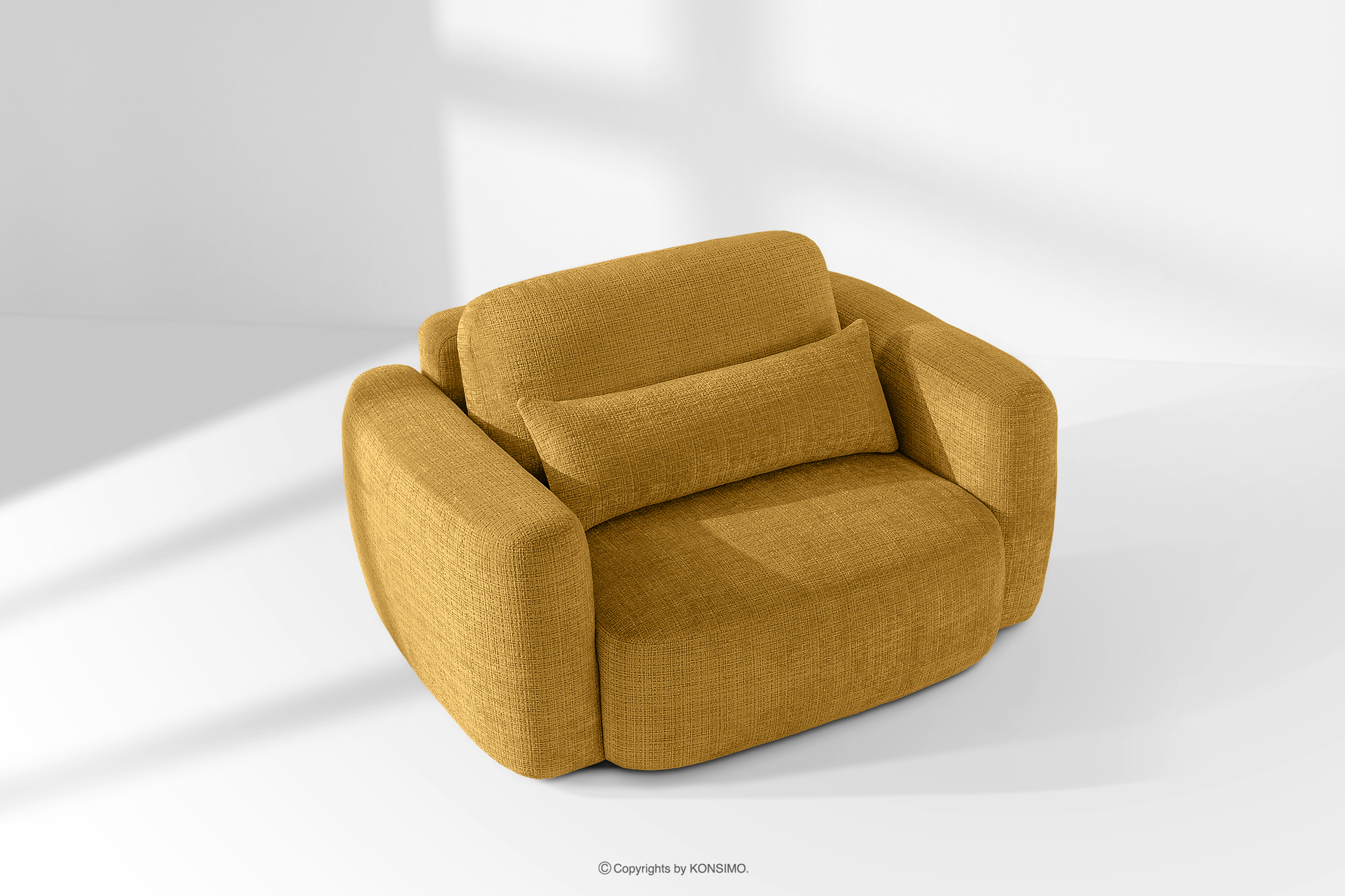 Sessel im japanischen Stil aus gelbem Chenille-Stoff revolutioniert das Konzept der Erholung. Das Herzstück ist ein innovativer Sitz, dessen einzigartige, gewölbte Halbmondform nicht nur ein Blickfang ist, sondern vor allem unvergleichlichen Komfort bietet. Dank der Verwendung von B-Wellenunterfederungen und hochwertigem HR30-Schaumstoff ist der Sitz mittelhart und gleichzeitig äußerst elastisch und weich.
