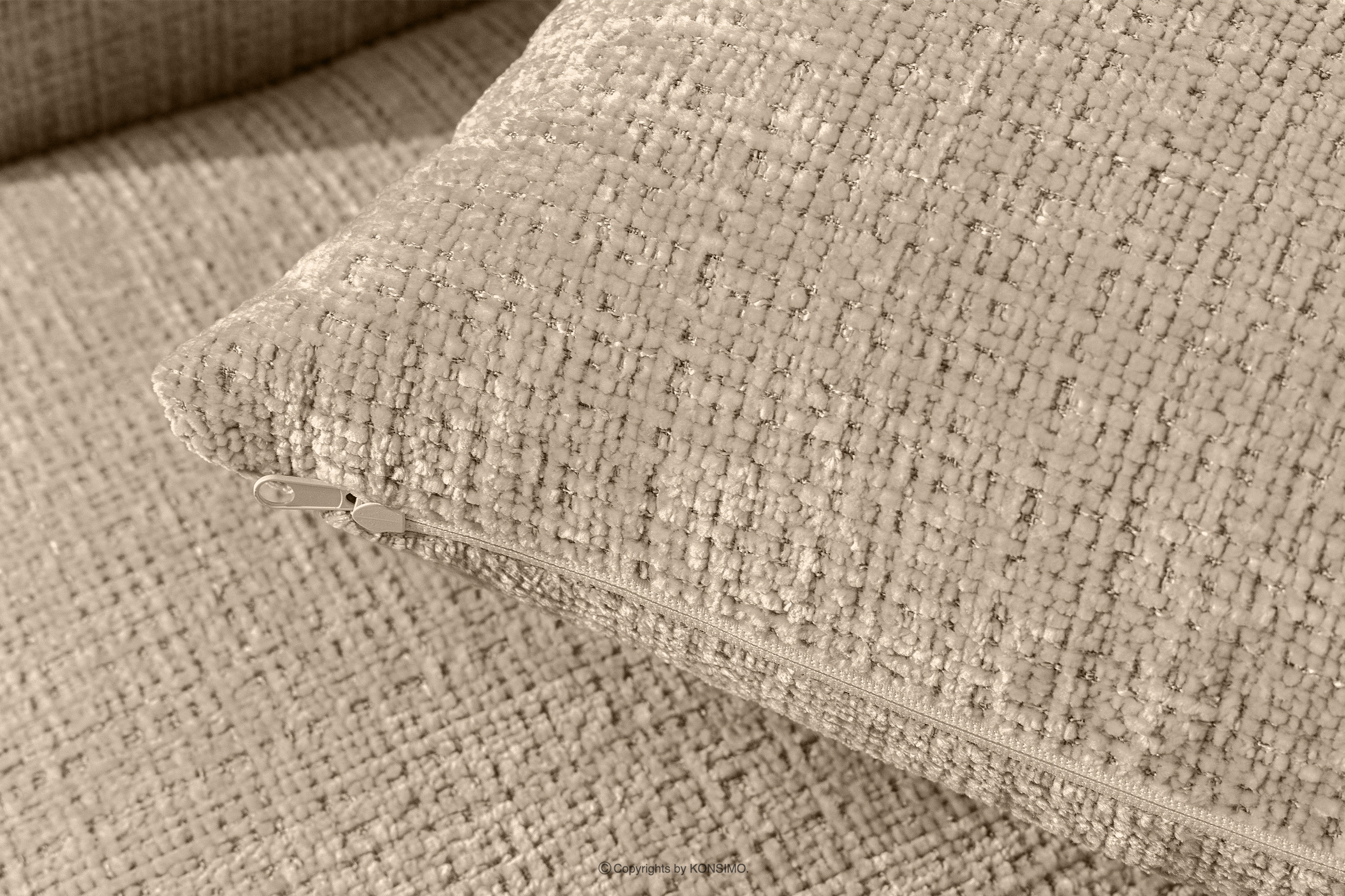 Japandi-Sessel aus beigem Chenille-Stoff revolutioniert das Konzept der Erholung. Das Herzstück ist ein innovativer Sitz, dessen einzigartige, gewölbte Halbmondform nicht nur ein Blickfang ist, sondern vor allem unvergleichlichen Komfort bietet. Dank der Verwendung von B-Wellenunterfederungen und hochwertigem HR30-Schaumstoff ist der Sitz mittelhart und gleichzeitig äußerst elastisch und weich. Diese Kombination garantiert eine perfekte Anpassung an die Körperform, minimiert Druckpunkte und sorgt für Entspannung auf höchstem Niveau.