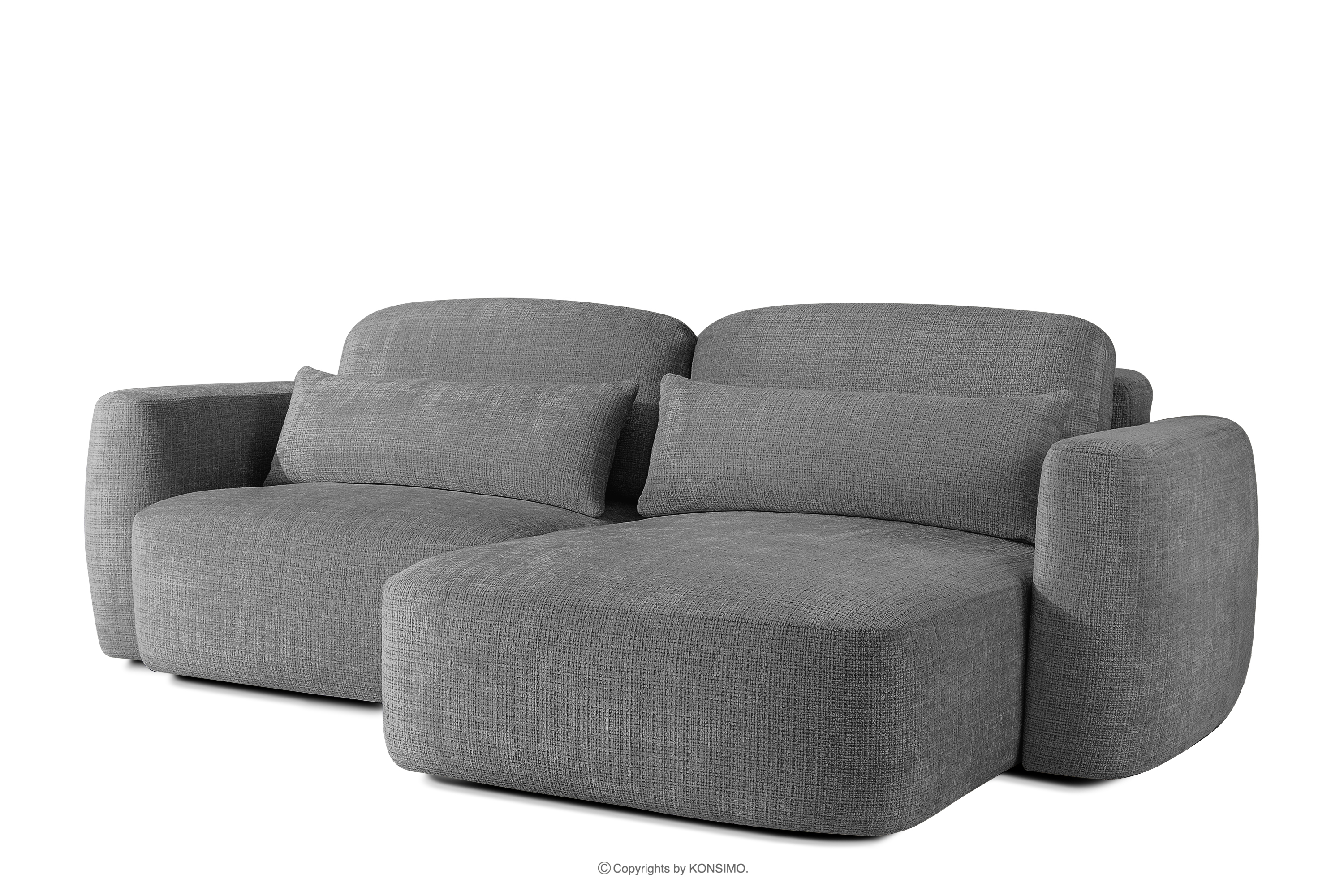 Japandi-Ecksofa aus Chenille-Stoff rechts dunkelgrau revolutioniert das Konzept der Erholung. Das Herzstück ist ein innovativer Sitz, dessen einzigartige, gewölbte Halbmondform nicht nur ein Blickfang ist, sondern vor allem unvergleichlichen Komfort bietet. Dank der Verwendung von B-Wellenunterfederungen und hochwertigem HR30-Schaumstoff ist der Sitz mittelhart und gleichzeitig äußerst elastisch und weich. Diese Kombination garantiert eine perfekte Anpassung an die Körperform, minimiert Druckpunkte und sorgt für Entspannung auf höchstem Niveau.