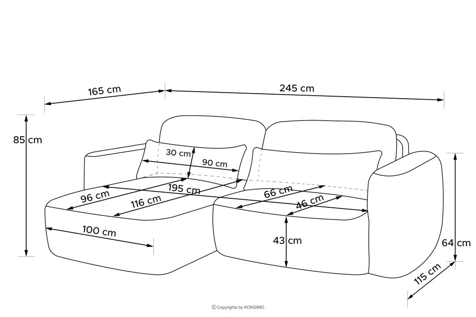 Das Ecksofa wurde für maximale Funktionalität und Ästhetik konzipiert, die auch die anspruchsvollsten Menschen zu schätzen wissen. Die Armlehnen sind mit dickem Formschaum gepolstert, extrem weich und laden zum Entspannen ein. Die Rückenkissen sind mit einer Mischung aus 70 % Silikonkügelchen und 30 % Schaumstoffgranulat gefüllt, wodurch sie ihre Form perfekt beibehalten und sich dem Körper anpassen. Die beiden Lendenkissen, die zu 100 % mit Silikonkügelchen gefüllt sind, sind der Schlüssel zu individuellem Komfort. Ihre hohe und dicke Form drückt die Lendenwirbelsäule effektiv nach außen und stützt den Rücken bis auf Höhe der Schulterblätter. Dank der Doppelnutzung dieser Kissen kann die Sitztiefe verändert werden, so dass man leicht vom Sitzen in eine halb liegende Position wechseln kann, ideal zum Lesen oder Filme schauen. Die perfekt ausgearbeitete Form des Möbels, d.h. die gepolsterte Rückenlehne und die soliden Nähte, ermöglichen es, das Ecksofa sowohl an einer Wand als auch als freistehendes Element in der Einrichtung zu platzieren.