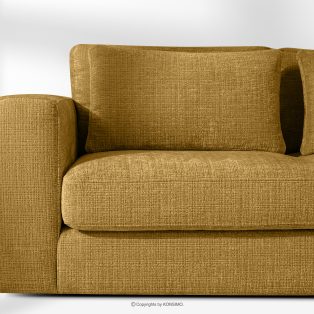 Großes Ecksofa für das Wohnzimmer aus Chenille-Stoff rechts gelb ist die Quintessenz zeitloser Eleganz und unvergleichlichen Komforts, entworfen für die anspruchsvollsten Nutzer. Es ist ein Möbelstück, das mit Stolz den Titel „KLASSIKER ÜBER KLASSIKERN” trägt und edle Handwerkstradition mit innovativen Lösungen für maximale Ergonomie verbindet. Der Sitz dieses einzigartigen Ecksofas wurde auf der Grundlage hochwertiger Polstergurte und 17 cm dickem HR 30/120-Schaumstoff konstruiert, die eine solide und elastische Basis bilden.