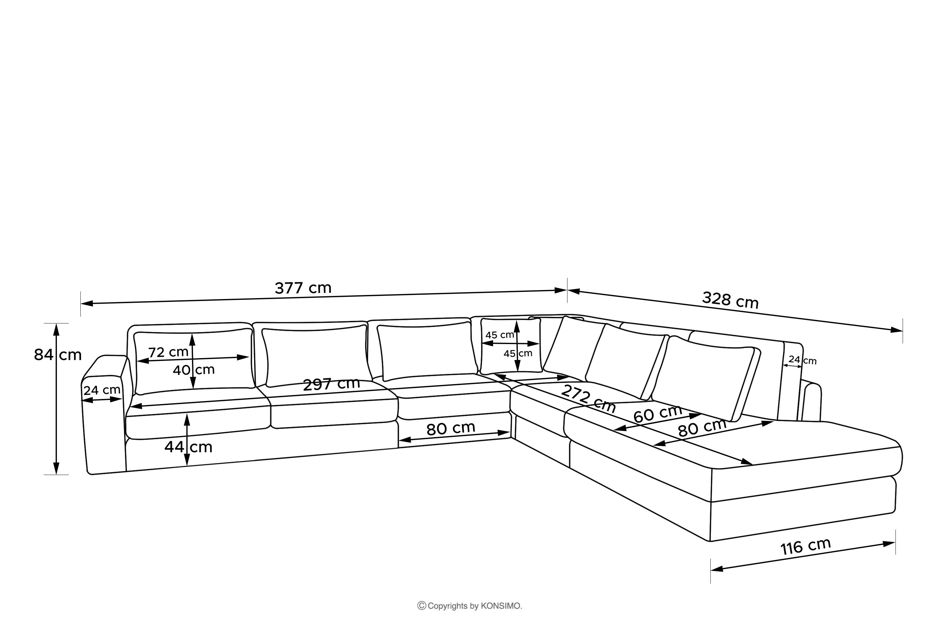 Dadurch bietet der Sitz eine perfekte Kombination aus Weichheit und mittlerer Härte und garantiert bequeme Unterstützung während langer Stunden der Entspannung. Die Rückenlehne, ein Schlüsselelement für die richtige Stützung der Wirbelsäule, ist mit Polstergurten und 2 cm dickem T 23/15-Schaumstoff ausgestattet, was in Kombination mit entsprechend geformten Rückenpolstern für eine optimale Sitzposition sorgt. Die Seitenteile des Ecksofas, also die Armlehnen, bestehen sowohl oben als auch an den Seiten aus 3 cm dickem T 25/180-Schaumstoff, was dem Möbelstück Stabilität und ein ästhetisches Finish verleiht. Die Konstruktion des Gestells, das das Herzstück des Möbelstücks bildet, basiert auf strapazierfähigem Kiefern- und Buchenholz, ergänzt durch Spanplatten und Sperrholz, was Langlebigkeit und Stabilität für viele Jahre garantiert. Es ist nicht nur ein Möbelstück, sondern eine Investition in Komfort und Stil, die den Test der Zeit bestehen wird.