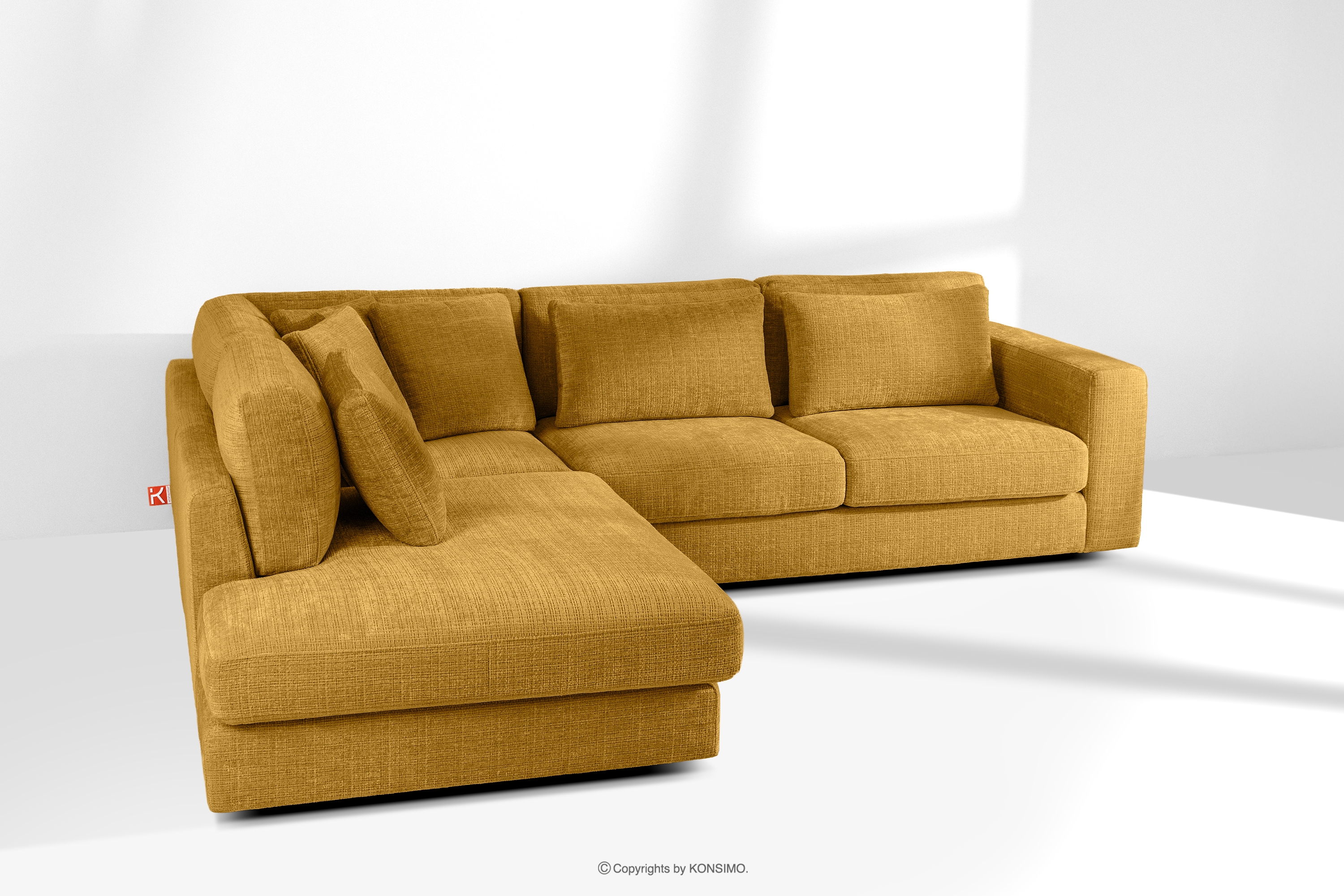 Großes Ecksofa aus Chenille-Stoff links gelb ist die Quintessenz zeitloser Eleganz und unvergleichlichen Komforts, entworfen für die anspruchsvollsten Nutzer. Es ist ein Möbelstück, das mit Stolz den Titel „KLASSIKER ÜBER KLASSIKERN” trägt und edle Handwerkstradition mit innovativen Lösungen für maximale Ergonomie verbindet. Der Sitz dieses einzigartigen Ecksofas wurde auf der Grundlage hochwertiger Polstergurte und 17 cm dickem HR 30/120-Schaumstoff konstruiert, die eine solide und elastische Basis bilden.