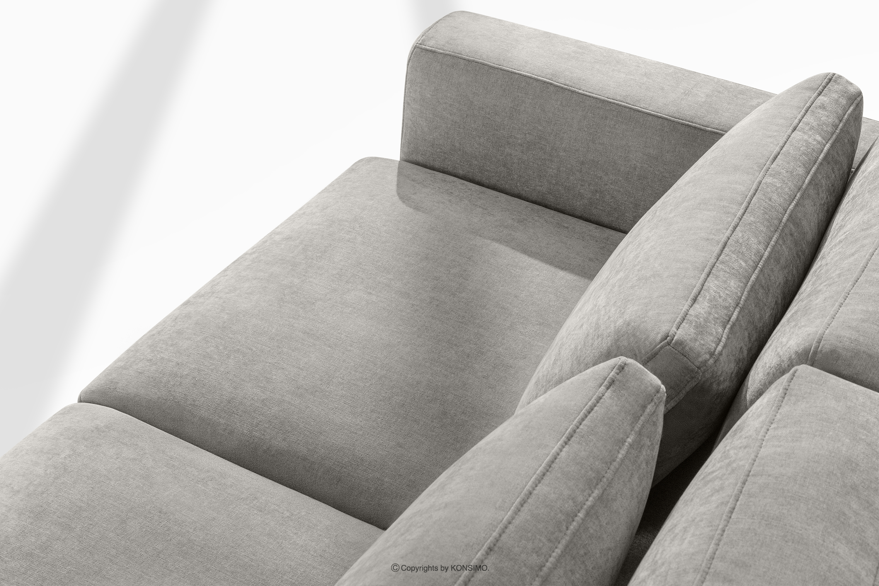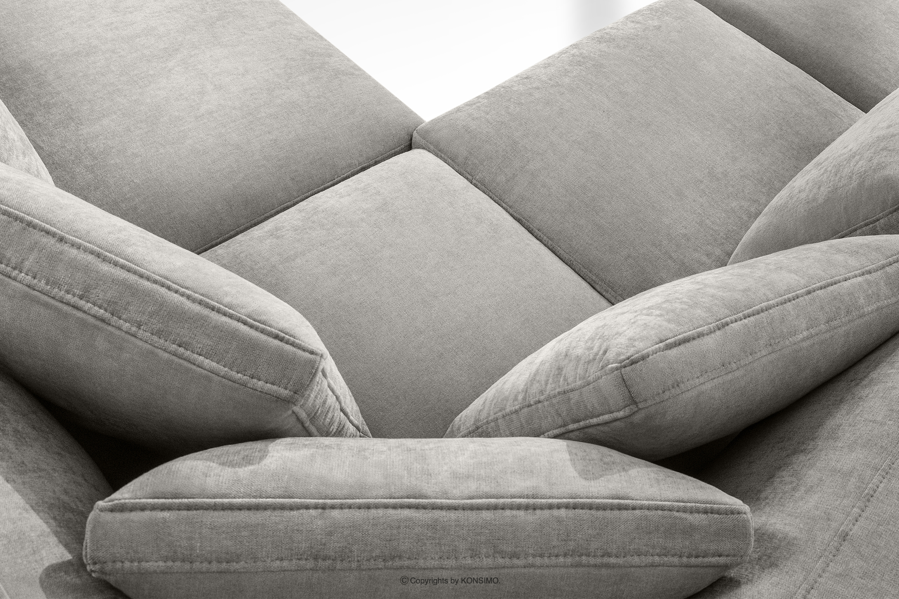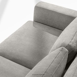 Bequeme Ecksofa aus Gewebestoff rechts hellgrau ist die Quintessenz zeitloser Eleganz und unvergleichlichen Komforts, entworfen für die anspruchsvollsten Nutzer. Es ist ein Möbelstück, das mit Stolz den Titel „KLASSIKER ÜBER KLASSIKERN” trägt und edle Handwerkstradition mit innovativen Lösungen für maximale Ergonomie verbindet. Der Sitz dieses einzigartigen Ecksofas wurde auf der Grundlage hochwertiger Polstergurte und 17 cm dickem HR 30/120-Schaumstoff konstruiert, die eine solide und elastische Basis bilden.