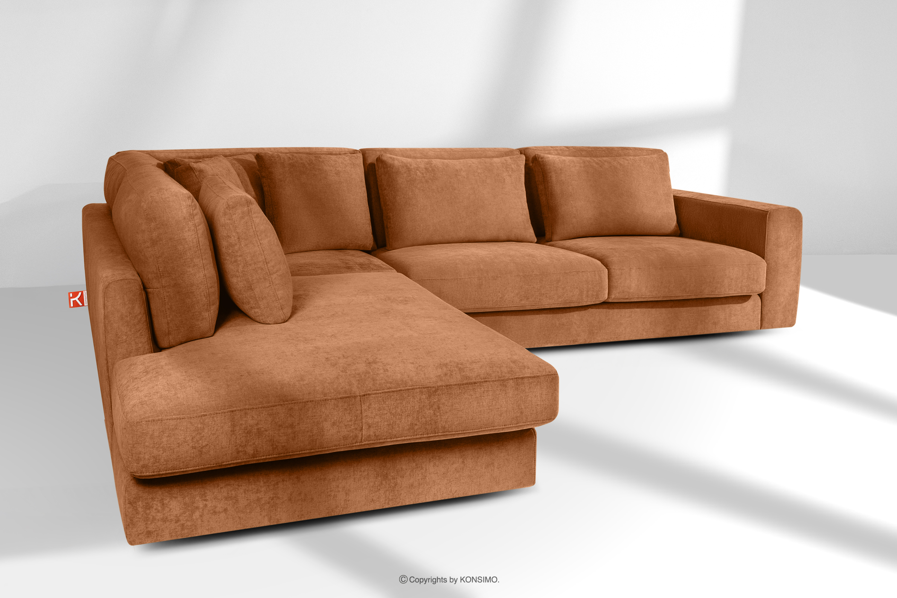 Großes bequemes Ecksofa für das Wohnzimmer Gewebestoff links rotbraun ist die Quintessenz zeitloser Eleganz und unvergleichlichen Komforts, entworfen für die anspruchsvollsten Nutzer. Es ist ein Möbelstück, das mit Stolz den Titel „KLASSIKER ÜBER KLASSIKERN” trägt und edle Handwerkstradition mit innovativen Lösungen für maximale Ergonomie verbindet. Der Sitz dieses einzigartigen Ecksofas wurde auf der Grundlage hochwertiger Polstergurte und 17 cm dickem HR 30/120-Schaumstoff konstruiert, die eine solide und elastische Basis bilden.
