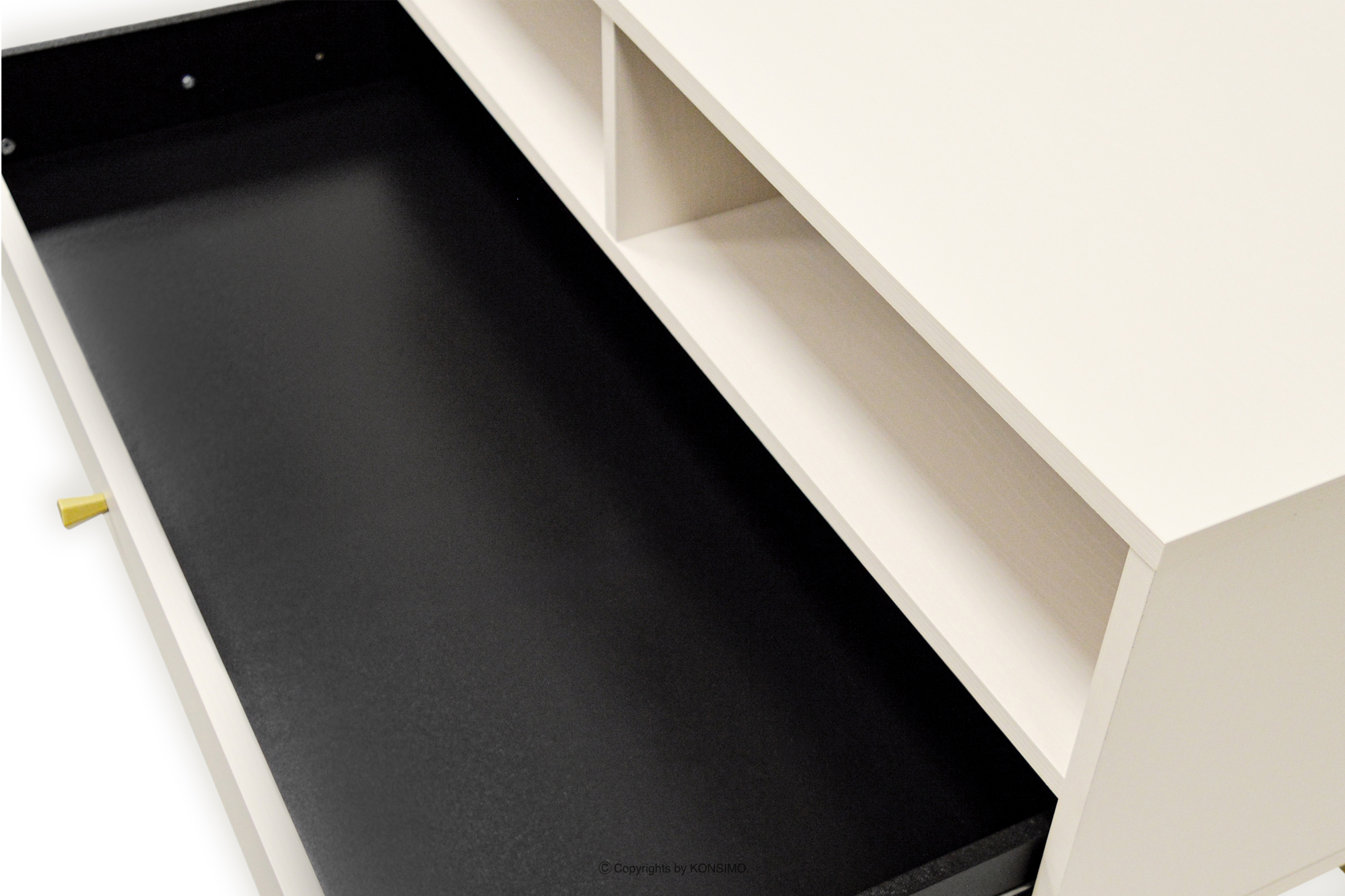 Cremefarbener Couchtisch auf goldenen Beinen ist die Quintessenz modernen Designs, kombiniert mit Funktionalität und Eleganz, geschaffen für moderne Wohnzimmer, die das Herzstück jedes Hauses bilden sollen. Die helle, cremefarbene Farbgebung der Möbel in Kombination mit den goldenen Metallbeinen verleiht dem Raum ein Gefühl von Leichtigkeit und Luxus und entspricht gleichzeitig den neuesten Einrichtungstrends.