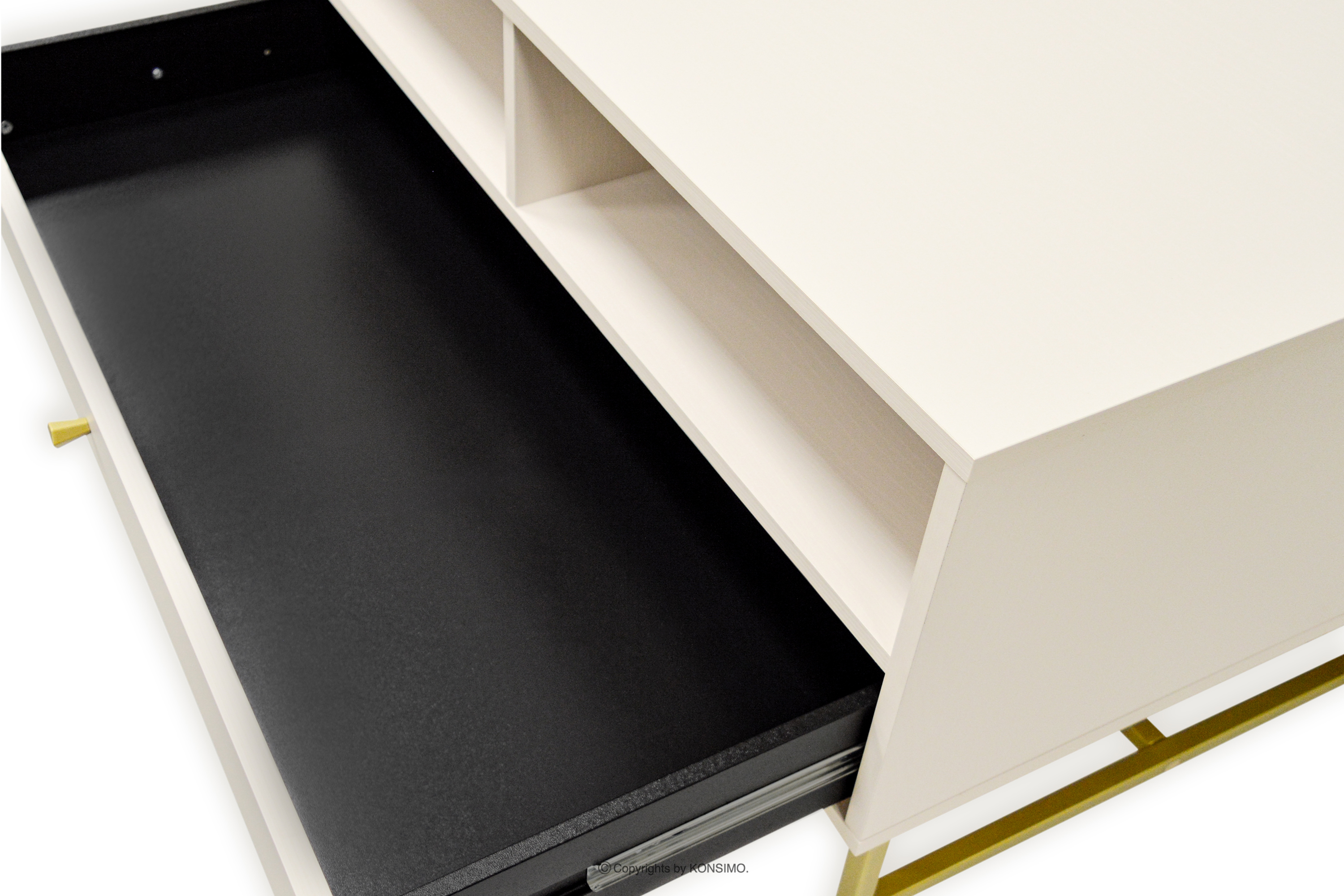 Moderner Couchtisch auf hohen Beinen, cremefarben/gold ist die Quintessenz modernen Designs, kombiniert mit Funktionalität und Eleganz, geschaffen für moderne Wohnzimmer, die das Herzstück jedes Hauses bilden sollen. Die helle, cremefarbene Farbgebung der Möbel in Kombination mit den goldenen Metallbeinen verleiht dem Raum ein Gefühl von Leichtigkeit und Luxus und entspricht gleichzeitig den neuesten Einrichtungstrends.