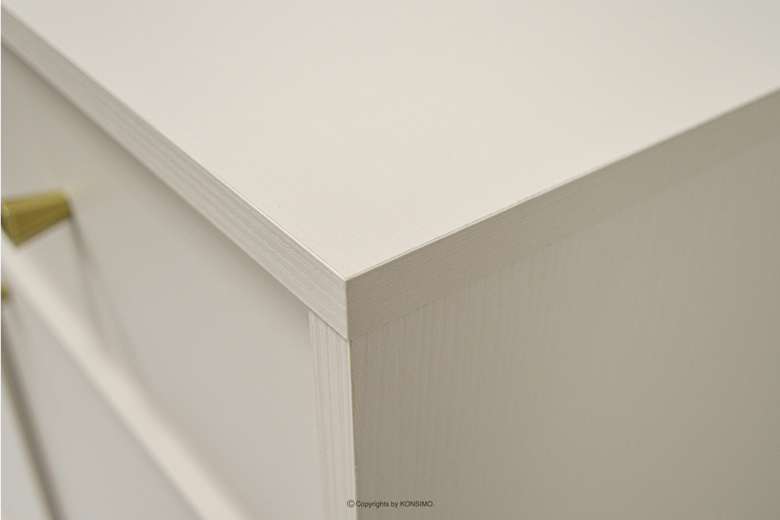 Schmale Kommode auf goldenen Beinen, cremefarben ist die Quintessenz modernen Designs, kombiniert mit Funktionalität und Eleganz, geschaffen für moderne Wohnzimmer, die das Herzstück jedes Hauses bilden sollen. Die helle, cremefarbene Farbgebung der Möbel in Kombination mit den goldenen Metallbeinen verleiht dem Raum ein Gefühl von Leichtigkeit und Luxus und entspricht gleichzeitig den neuesten Einrichtungstrends.
