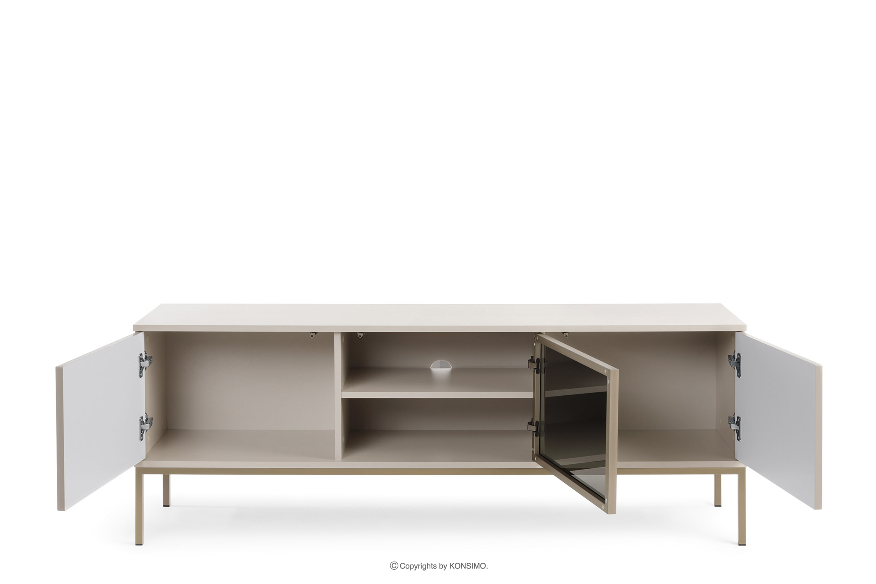 Cremefarbene Kommode mit Lamellen auf hohen Beinen Hergestellt aus hochwertiger 16 mm starker Laminatplatte, garantiert sie Langlebigkeit und Widerstandsfähigkeit im täglichen Gebrauch. Die Fronten aus 18 mm starkem gefrästem MDF verleihen Eleganz und Tiefe und schaffen einen einzigartigen dreidimensionalen Effekt. Die Glaselemente aus 4 mm starkem, schwarzem Antisol-Hartglas, eingefasst in Aluminiumrahmen, unterstreichen die Ästhetik des Möbelstücks.