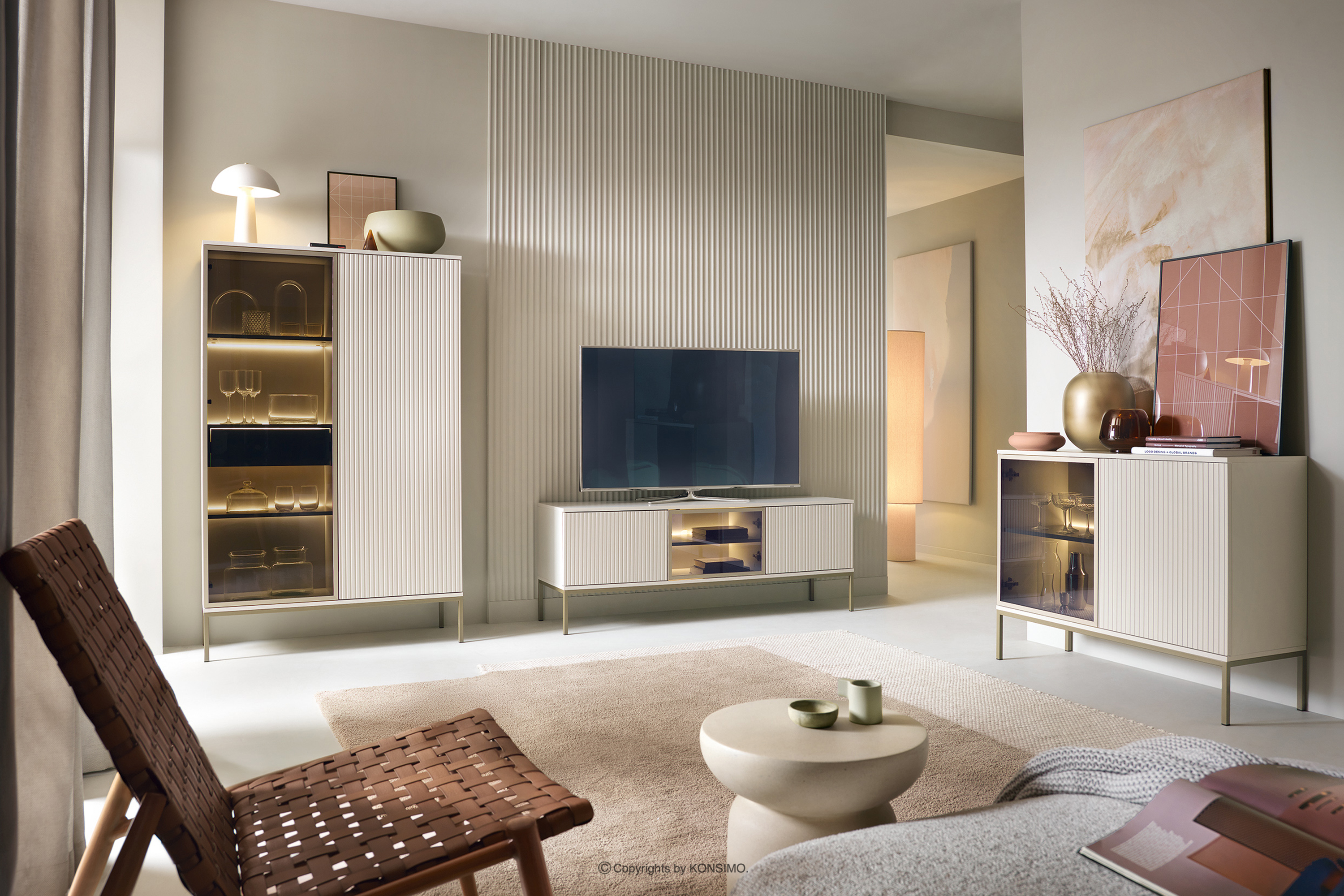 FONTE Mehr aus der Kollektion Cremefarbene Vitrine mit Lamellen auf hohen Beinen- Farbe cremig