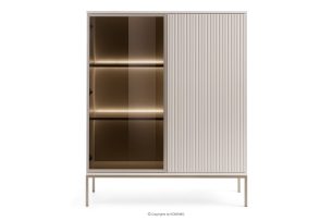 Cremefarbene niedrige Vitrine mit Lamellen Hergestellt aus hochwertiger 16 mm starker Laminatplatte, garantiert sie Langlebigkeit und Widerstandsfähigkeit im täglichen Gebrauch. Die Fronten aus 18 mm starkem gefrästem MDF verleihen Eleganz und Tiefe und schaffen einen einzigartigen dreidimensionalen Effekt. Die Glaselemente aus 4 mm starkem, schwarzem Antisol-Hartglas, eingefasst in Aluminiumrahmen, unterstreichen die Ästhetik des Möbelstücks.