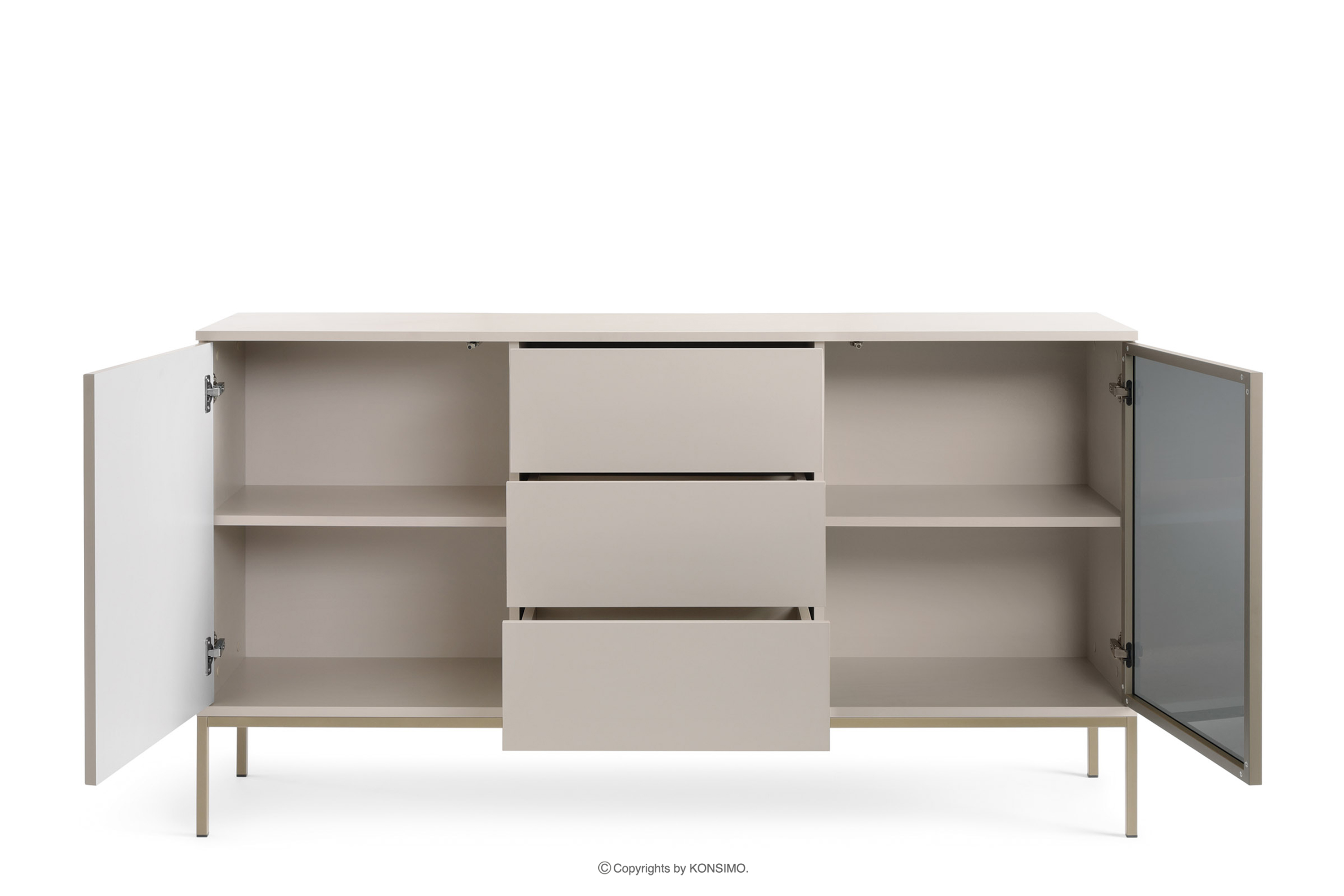 Cremefarbene breite Kommode mit Glastüren und Lamellen Hergestellt aus hochwertiger 16 mm starker Laminatplatte, garantiert sie Langlebigkeit und Widerstandsfähigkeit im täglichen Gebrauch. Die Fronten aus 18 mm starkem gefrästem MDF verleihen Eleganz und Tiefe und schaffen einen einzigartigen dreidimensionalen Effekt. Die Glaselemente aus 4 mm starkem, schwarzem Antisol-Hartglas, eingefasst in Aluminiumrahmen, unterstreichen die Ästhetik des Möbelstücks.