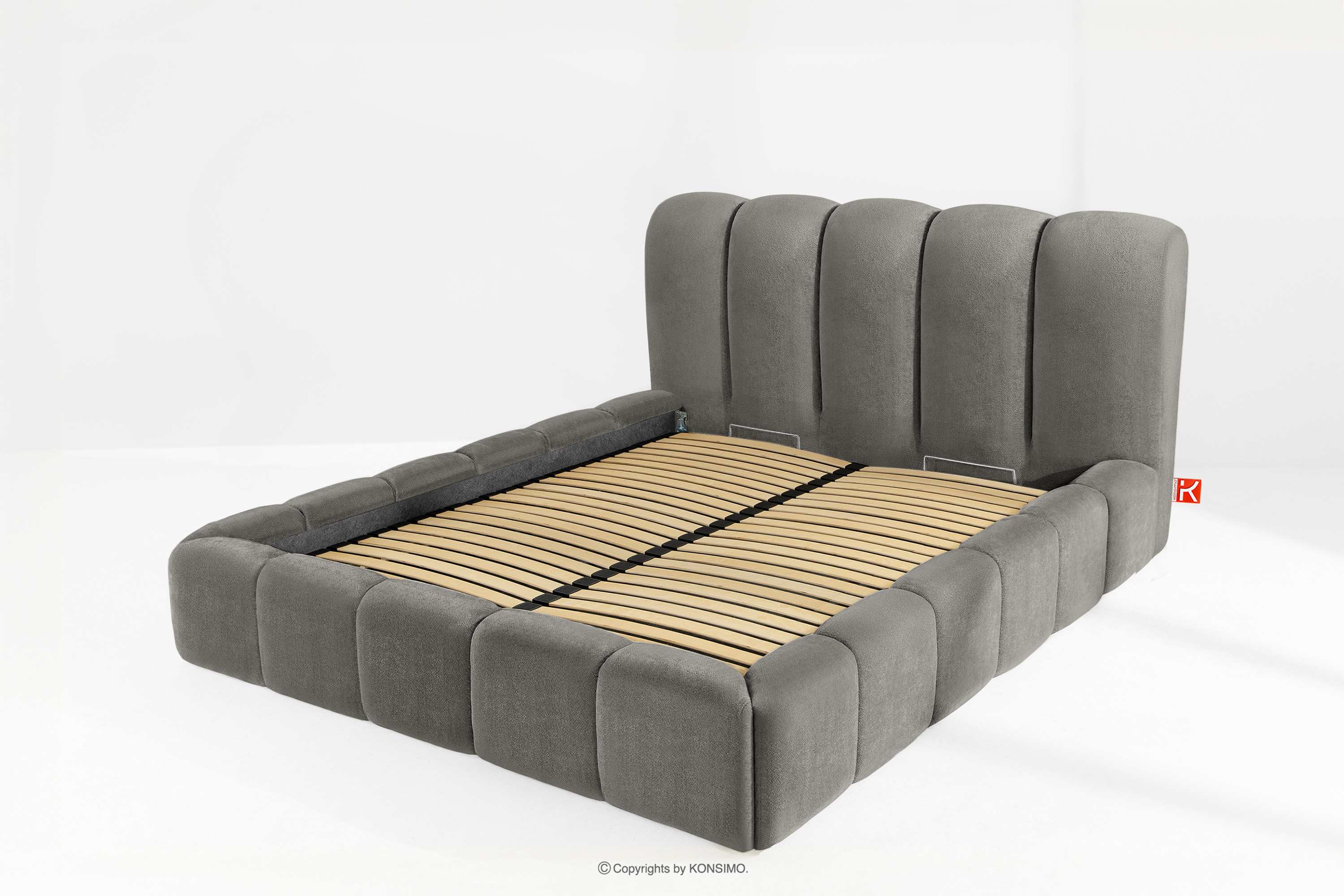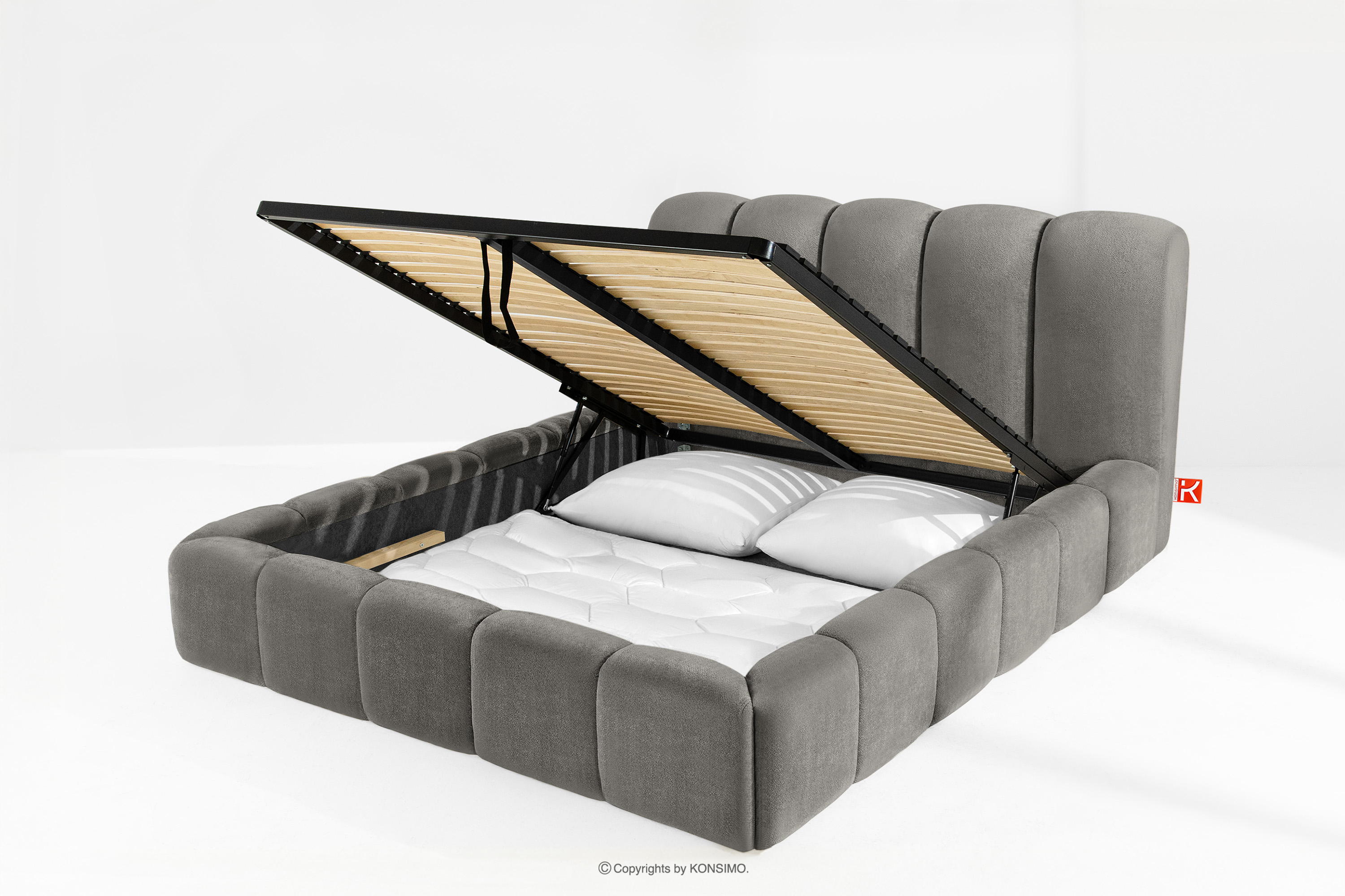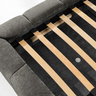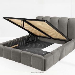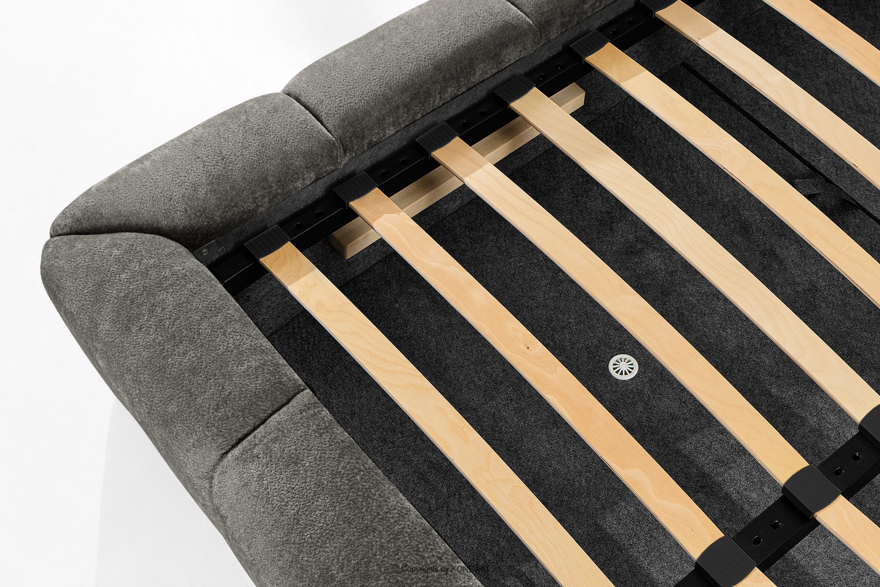 Unter dieser Schicht aus Gemütlichkeit und Weichheit verbirgt sich solide Technik und Funktionalität, die den Anforderungen moderner Wohnungen gerecht wird, in denen jeder Zentimeter Platz Gold wert ist. Die Konstruktion des Bettes basiert auf einem robusten Metallrahmen, der Stabilität und keine störenden Quietschgeräusche garantiert. Die Ausstattung mit hochwertigen Holzlatten sorgt für eine optimale Funktion der Matratze, verbessert ihre Belüftung und reagiert präzise auf den Druck des Körpers der schlafenden Person. Darüber hinaus verbirgt sich unter der gesamten Liegefläche ein äußerst geräumiger Bettkasten, der einen zusätzlichen Schrank oder eine Kommode ersetzen kann und Platz für Bettdecken, Kissen, Decken oder saisonale Kleidung bietet. Damit die Nutzung dieses Stauraums zum reinen Vergnügen wird, haben wir einen fortschrittlichen Mechanismus mit Gasdruckfedern eingebaut. Dank ihm ist zum Anheben der schweren Matratze zusammen mit dem Lattenrost keine Kraft erforderlich – der Mechanismus arbeitet reibungslos und leise und hält den Lattenrost beim Verstauen von Gegenständen oben, wodurch das tägliche Bettenmachen oder Verstauen von Bettwäsche zu einem schnellen, leichten und intuitiven Vorgang wird, der der Philosophie des funktionalen Minimalismus entspricht.