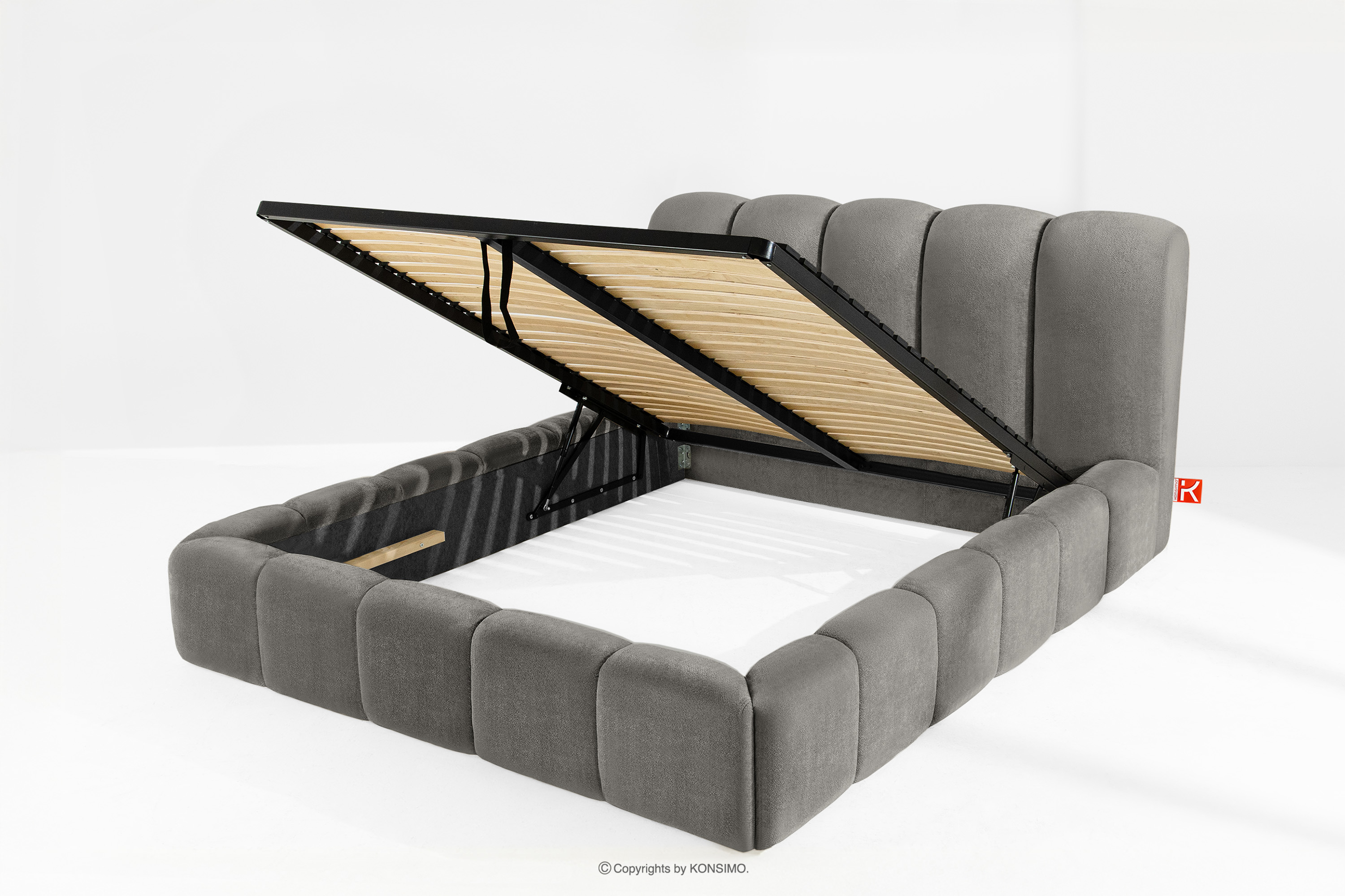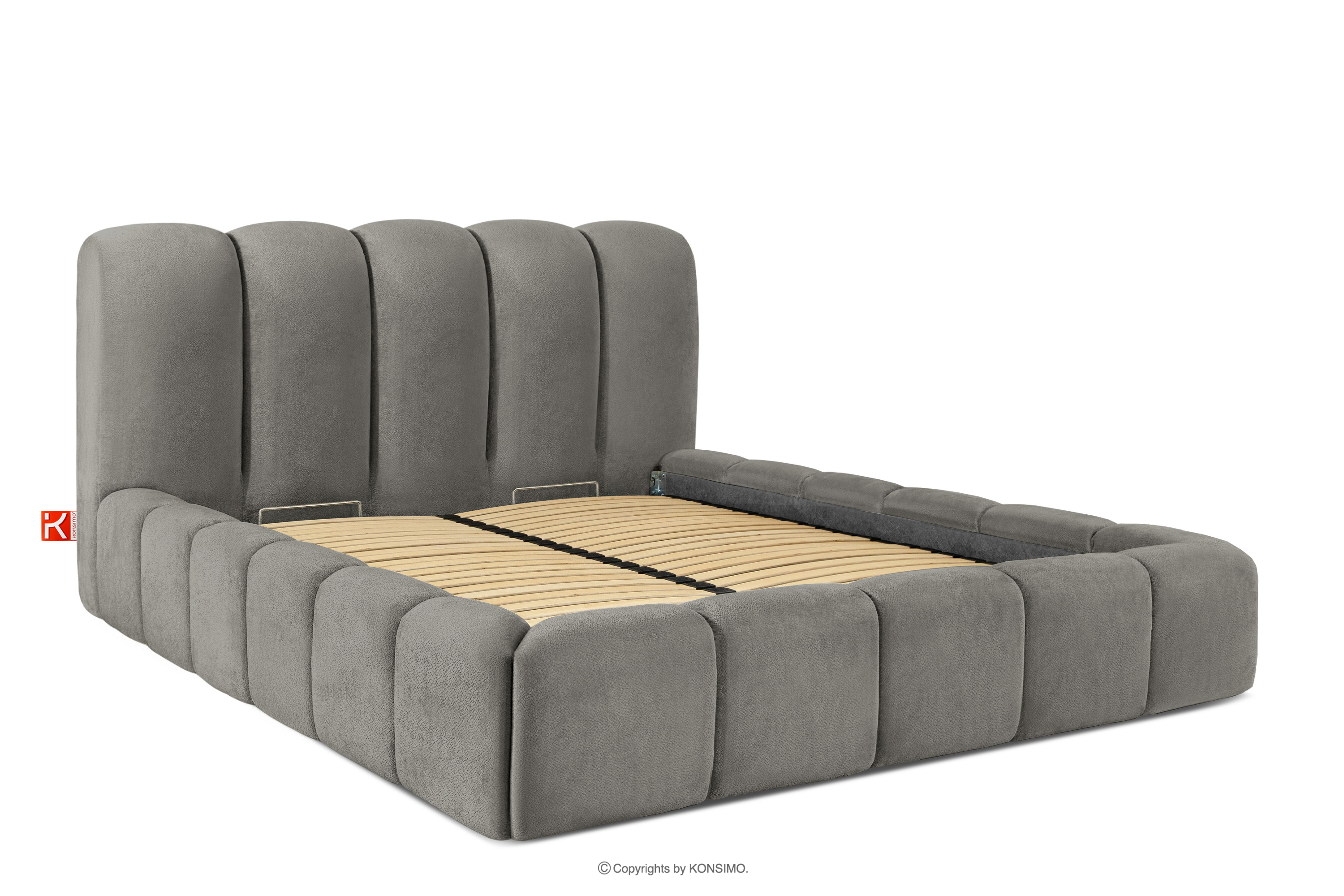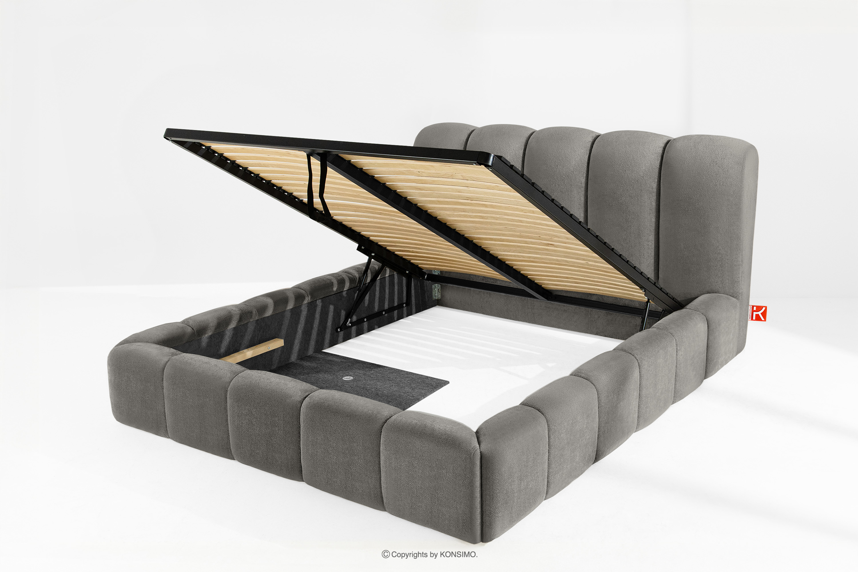 Unter dieser Schicht aus Gemütlichkeit und Weichheit verbirgt sich solide Technik und Funktionalität, die den Anforderungen moderner Wohnungen gerecht wird, in denen jeder Zentimeter Platz Gold wert ist. Die Konstruktion des Bettes basiert auf einem robusten Metallrahmen, der Stabilität und keine störenden Quietschgeräusche garantiert. Die Ausstattung mit hochwertigen Holzlatten sorgt für eine optimale Funktion der Matratze, verbessert ihre Belüftung und reagiert präzise auf den Druck des Körpers der schlafenden Person. Darüber hinaus verbirgt sich unter der gesamten Liegefläche ein äußerst geräumiger Bettkasten, der einen zusätzlichen Schrank oder eine Kommode ersetzen kann und Platz für Bettdecken, Kissen, Decken oder saisonale Kleidung bietet. Damit die Nutzung dieses Stauraums zum reinen Vergnügen wird, haben wir einen fortschrittlichen Mechanismus mit Gasdruckfedern eingebaut. Dank ihm ist zum Anheben der schweren Matratze zusammen mit dem Lattenrost keine Kraft erforderlich – der Mechanismus arbeitet reibungslos und leise und hält den Lattenrost beim Verstauen von Gegenständen oben, wodurch das tägliche Bettenmachen oder Verstauen von Bettwäsche zu einem schnellen, leichten und intuitiven Vorgang wird, der der Philosophie des funktionalen Minimalismus entspricht.
