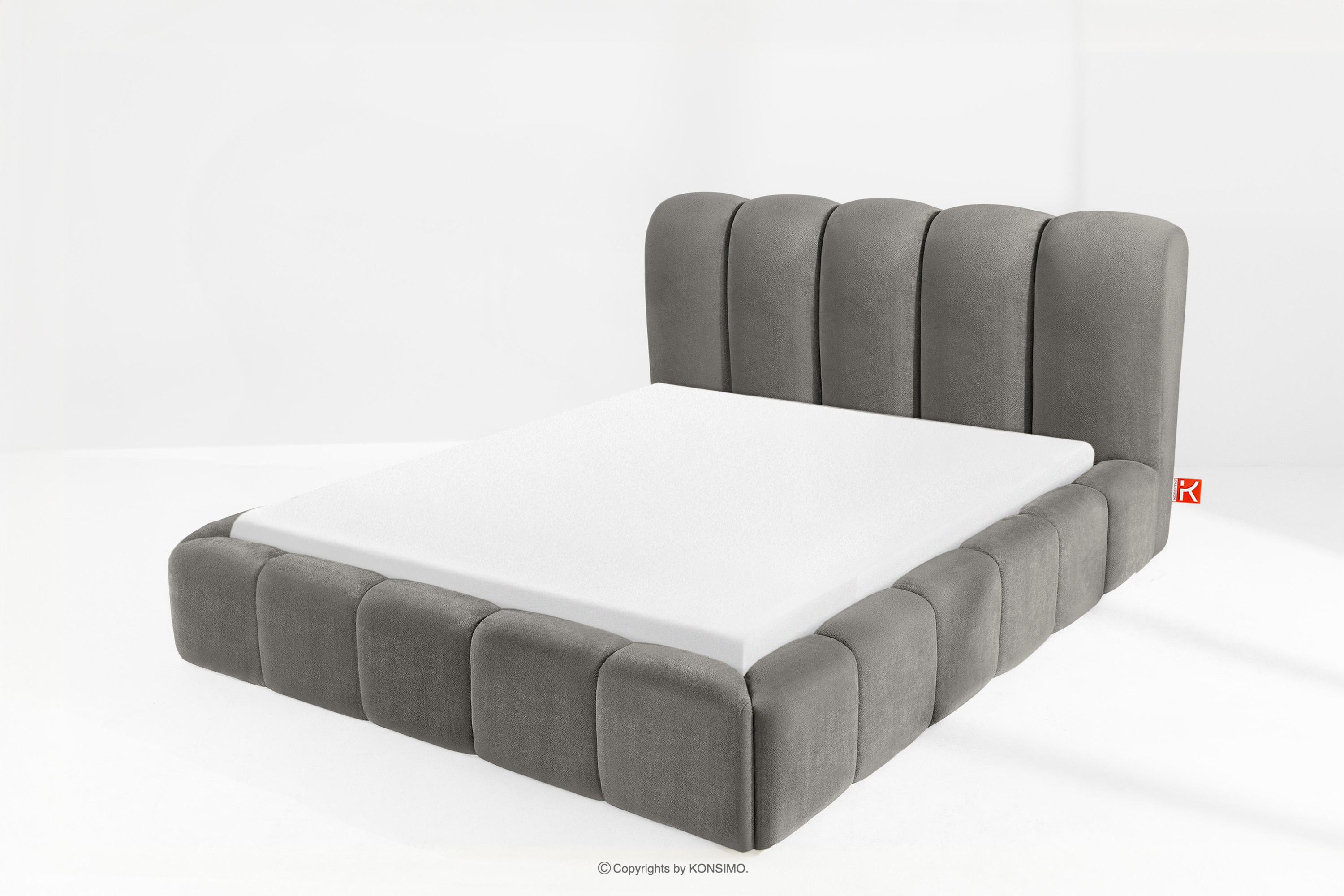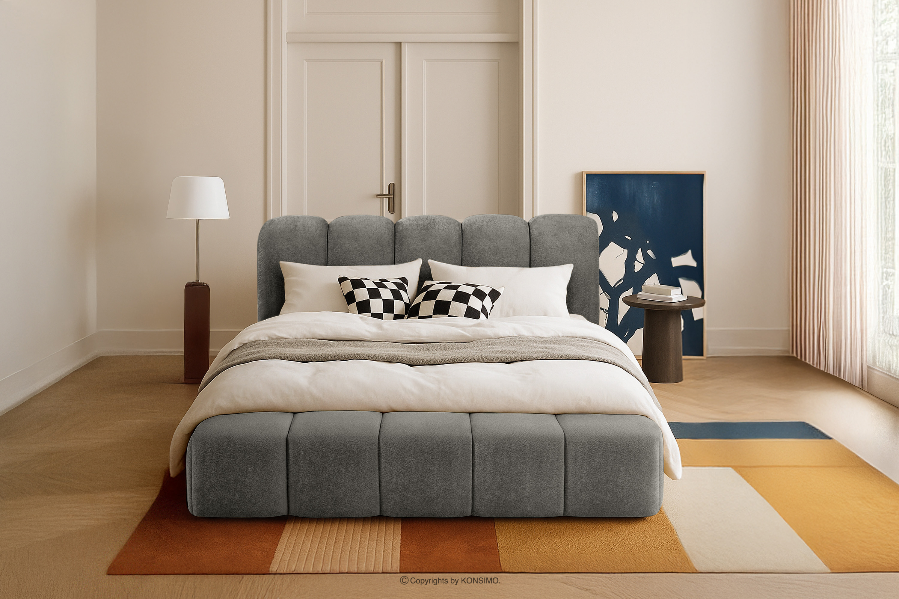 Polsterbett 160 cm mit dunkelgrauer Steppung ist eine Hommage an die Schlichtheit, die nicht auf Raffinesse verzichtet und eine ideale Lösung für alle darstellt, die ihr Schlafzimmer in einen Raum der absoluten Ruhe und visuellen Harmonie verwandeln möchten. Eine wichtige Rolle spielt hier der sorgfältig ausgewählte Chenille-Stoff, dessen einzigartiges, flauschiges Garn dem Möbelstück eine unvergleichliche Tiefe und Eleganz verleiht, sodass das Bett nicht nur ein Ort zum Schlafen ist, sondern auch eine echte Zierde des Interieurs.