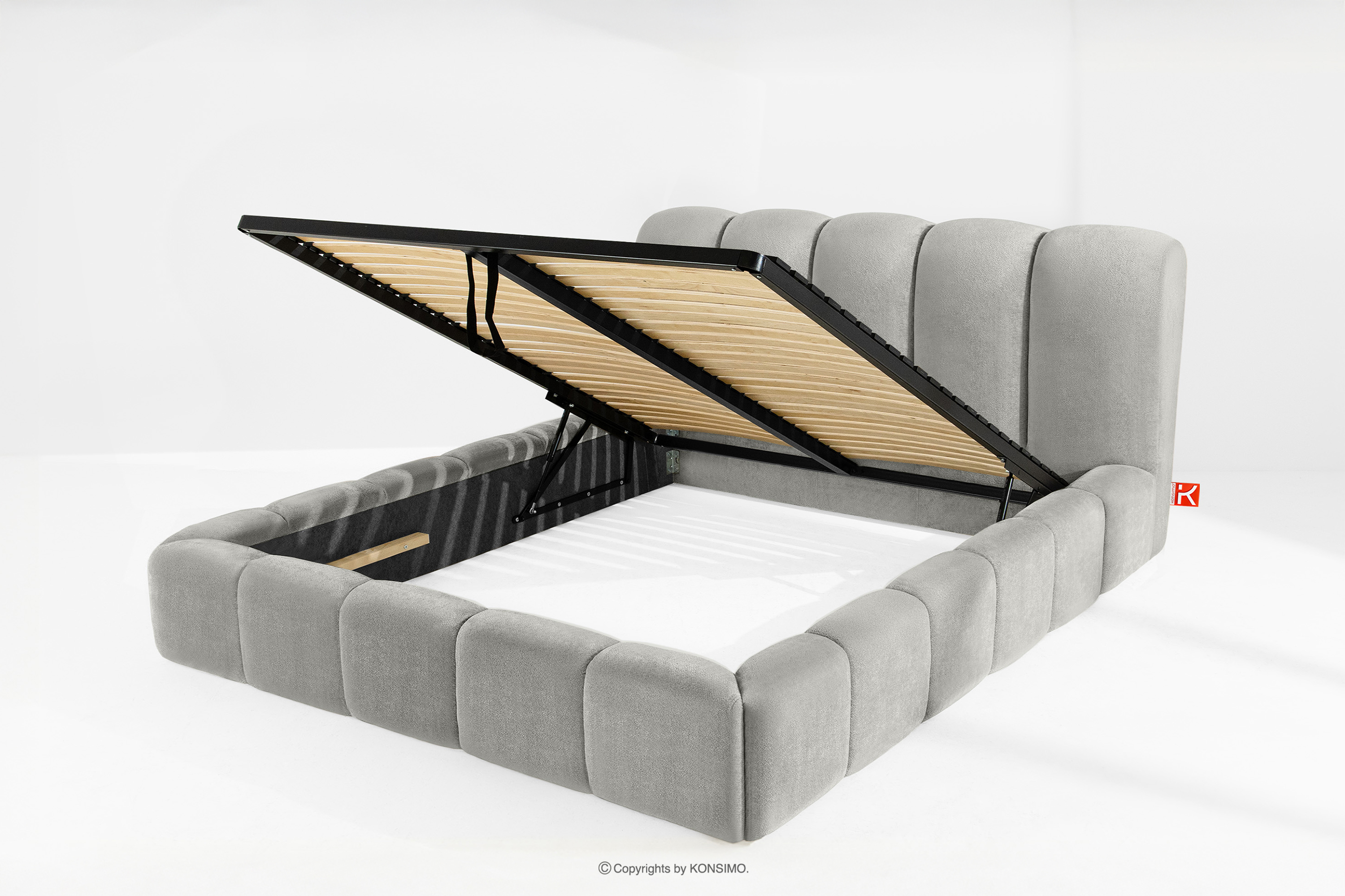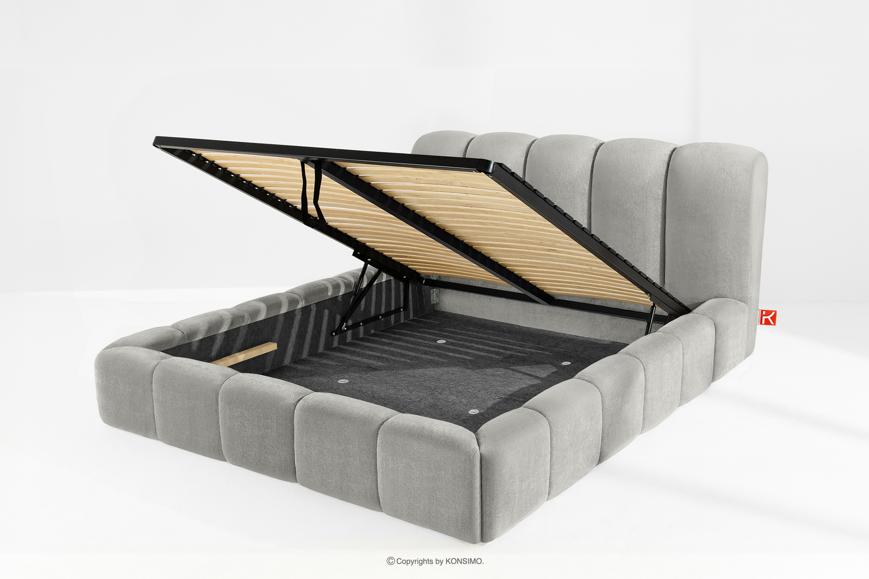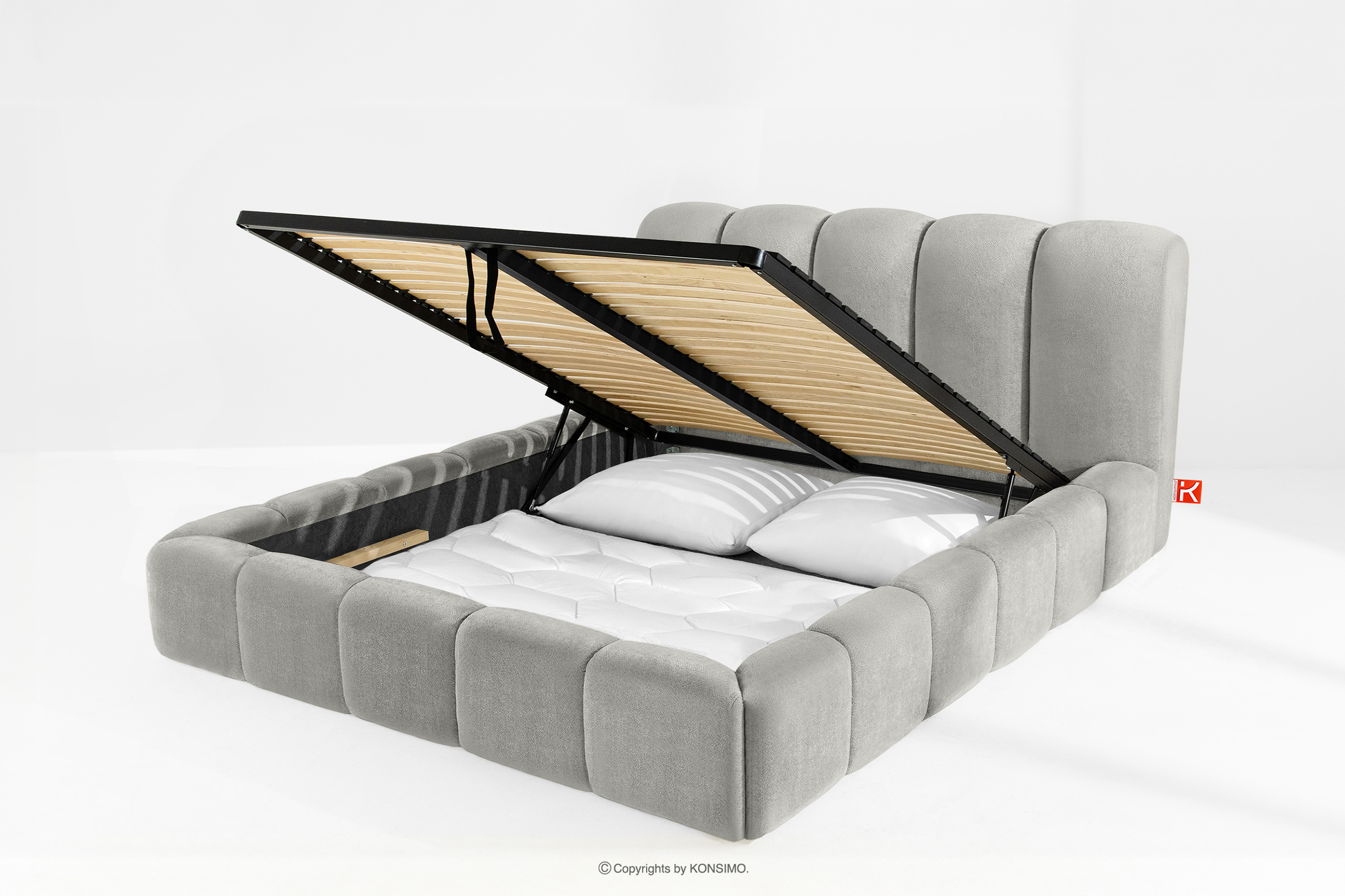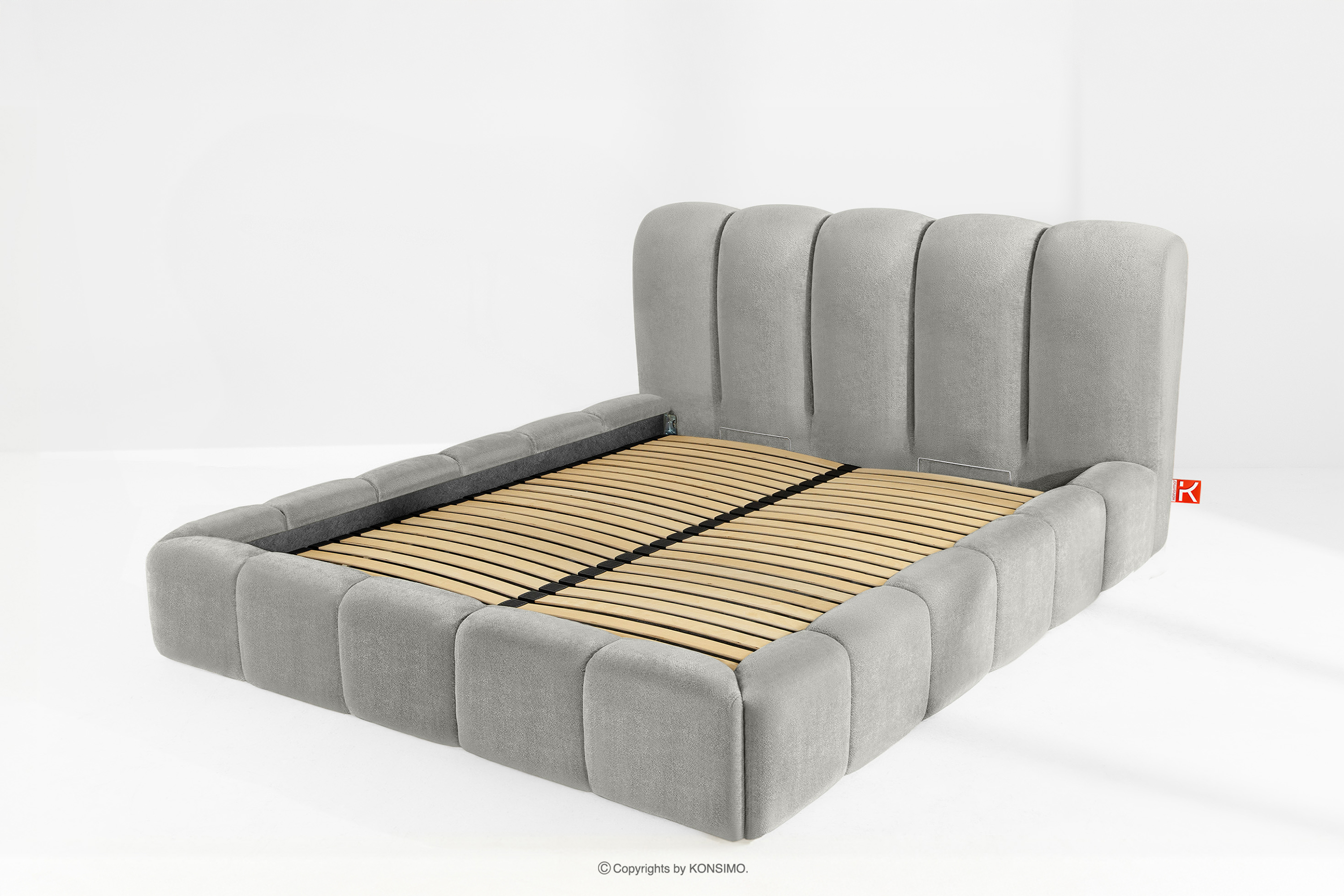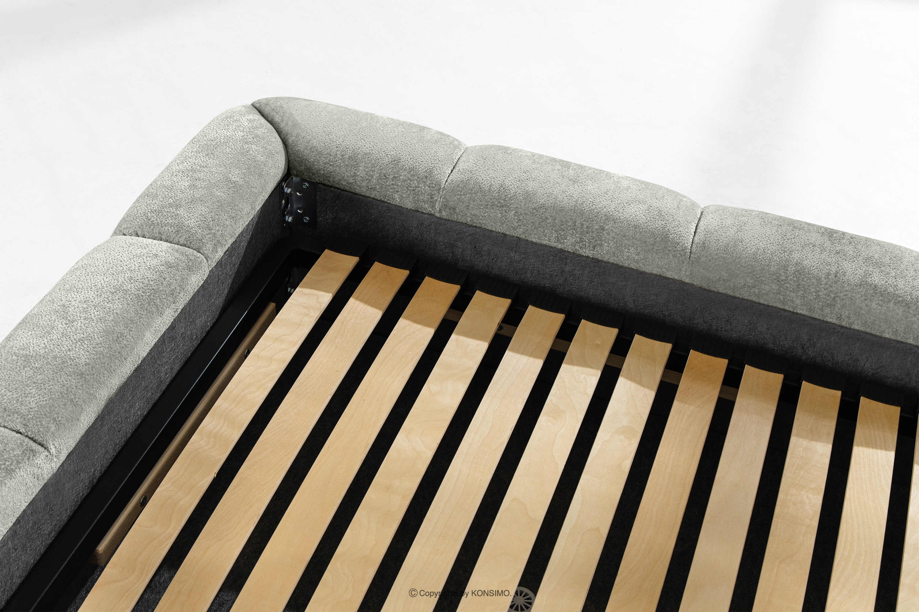 Polsterbett 180 cm mit Steppung hellgrau ist eine Hommage an die Schlichtheit, die nicht auf Raffinesse verzichtet und eine ideale Lösung für alle darstellt, die ihr Schlafzimmer in einen Raum der absoluten Ruhe und visuellen Harmonie verwandeln möchten. Eine wichtige Rolle spielt hier der sorgfältig ausgewählte Chenille-Stoff, dessen einzigartiges, flauschiges Garn dem Möbelstück eine unvergleichliche Tiefe und Eleganz verleiht, sodass das Bett nicht nur ein Ort zum Schlafen ist, sondern auch eine echte Zierde des Interieurs.