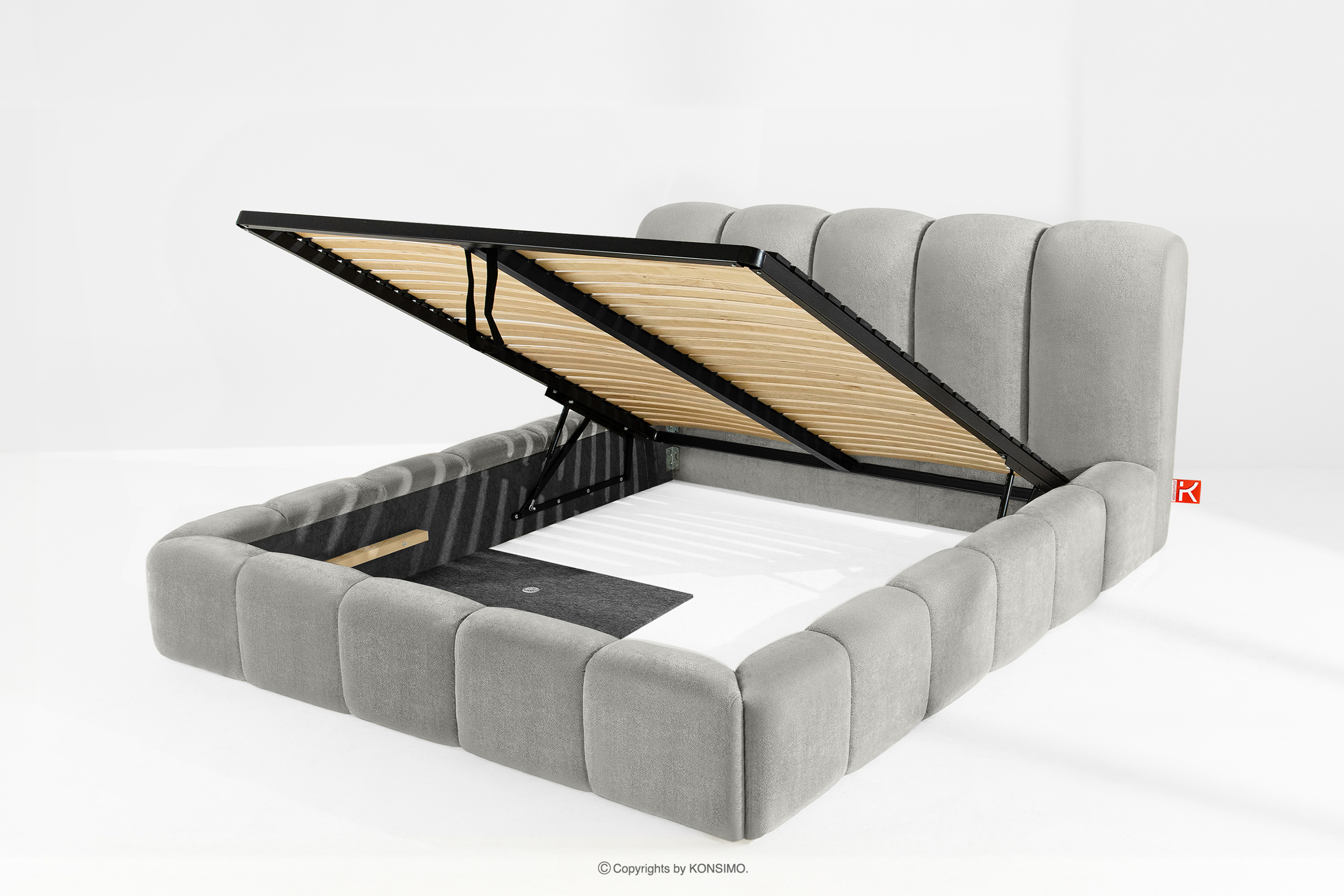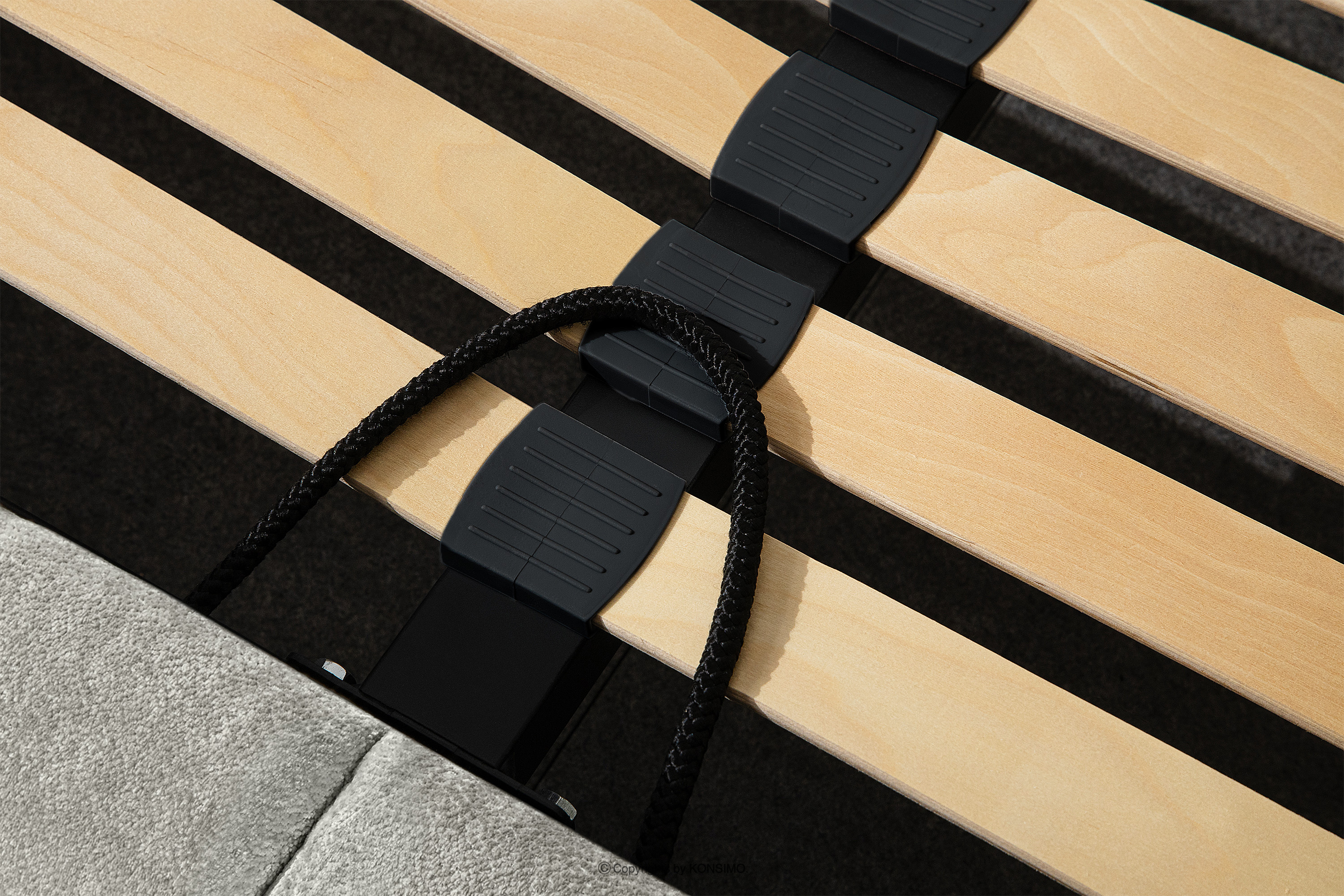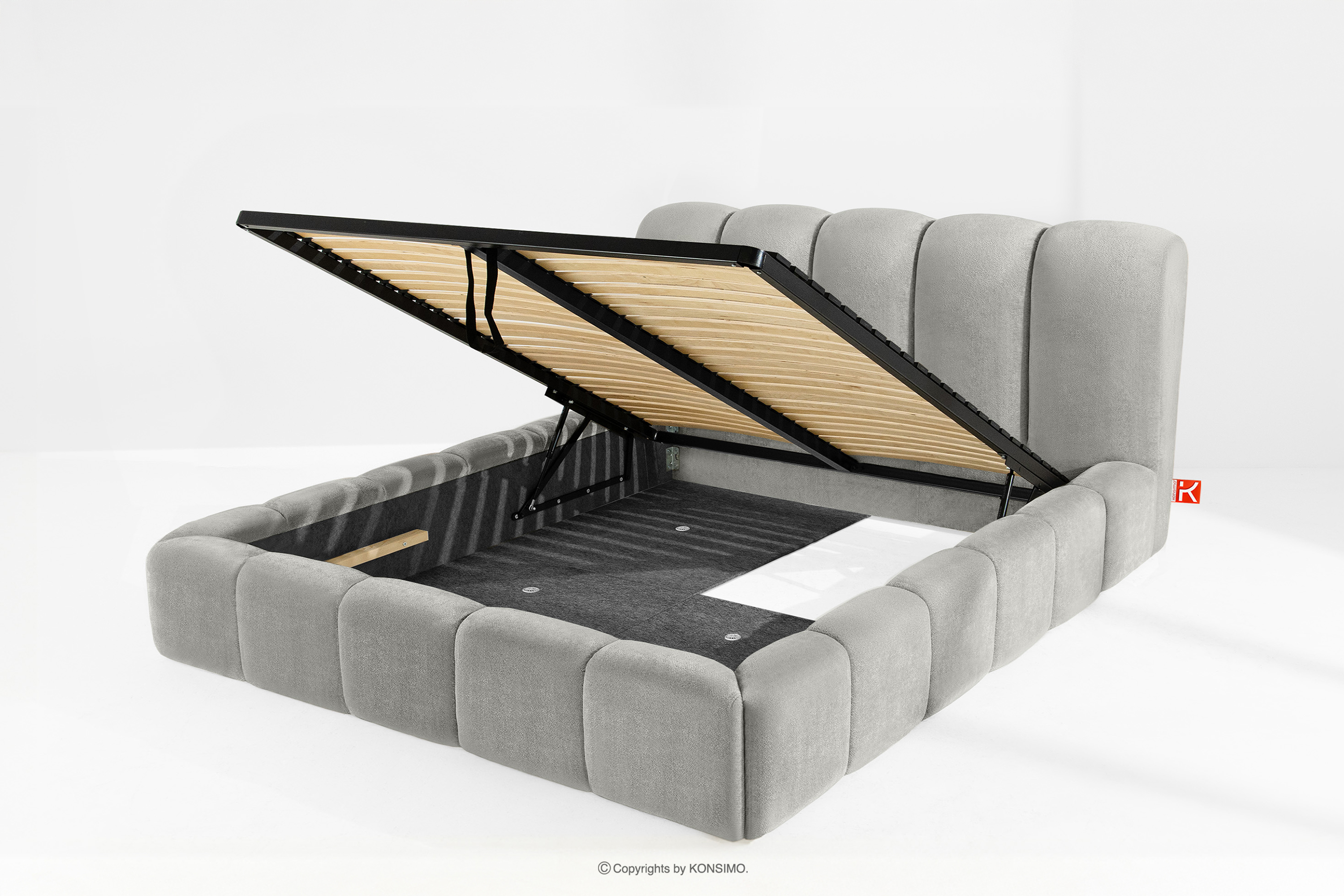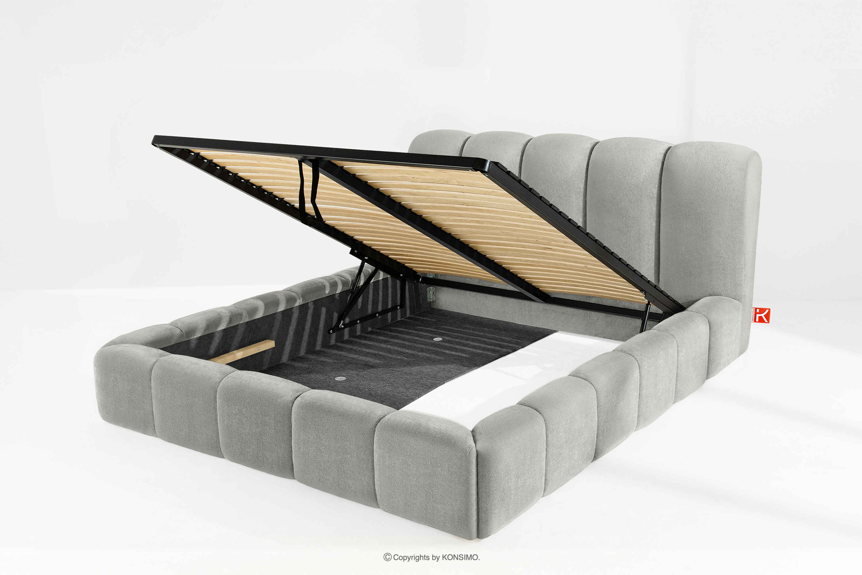Polsterbett 180 cm mit Steppung hellgrau ist eine Hommage an die Schlichtheit, die nicht auf Raffinesse verzichtet und eine ideale Lösung für alle darstellt, die ihr Schlafzimmer in einen Raum der absoluten Ruhe und visuellen Harmonie verwandeln möchten. Eine wichtige Rolle spielt hier der sorgfältig ausgewählte Chenille-Stoff, dessen einzigartiges, flauschiges Garn dem Möbelstück eine unvergleichliche Tiefe und Eleganz verleiht, sodass das Bett nicht nur ein Ort zum Schlafen ist, sondern auch eine echte Zierde des Interieurs.