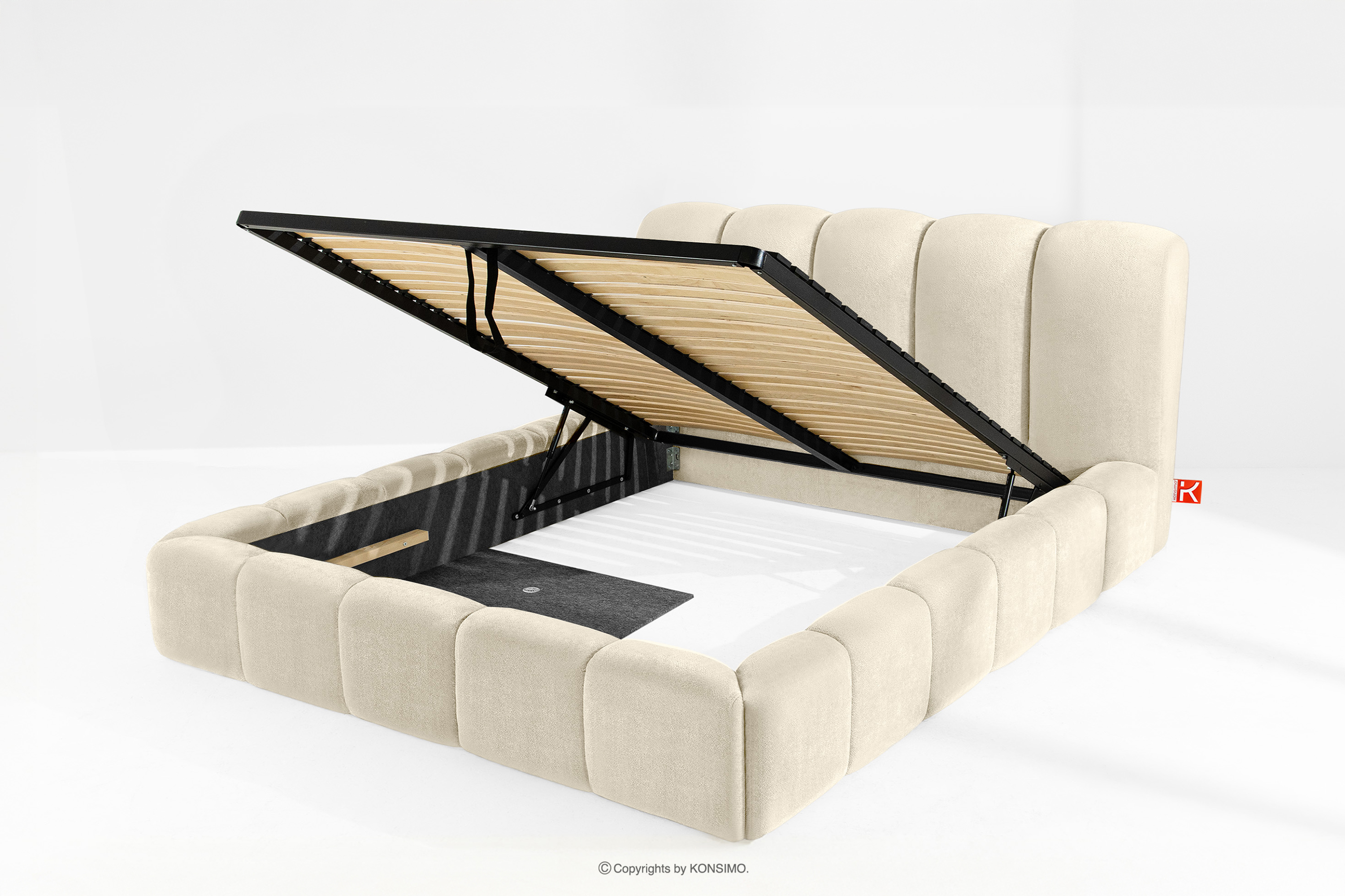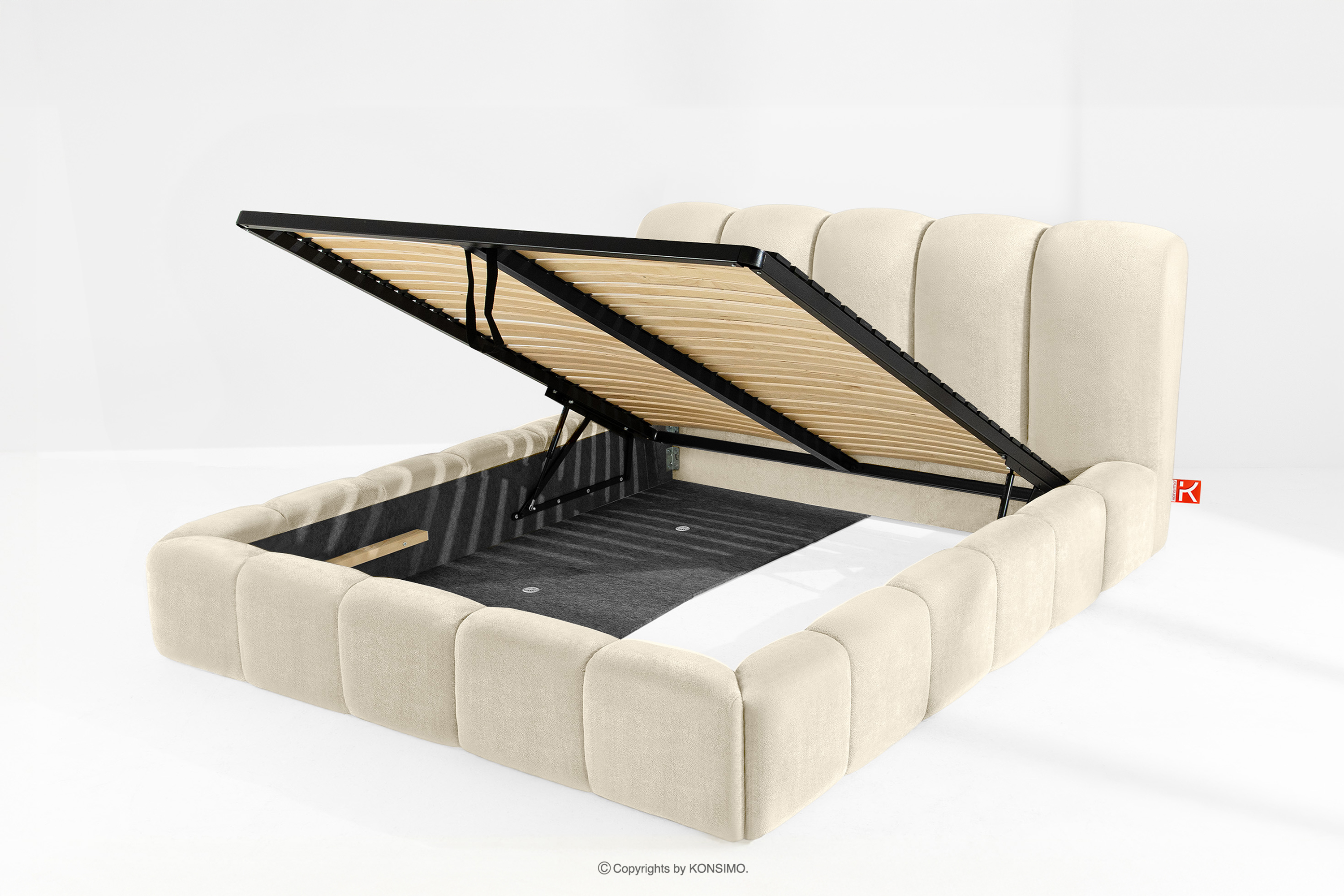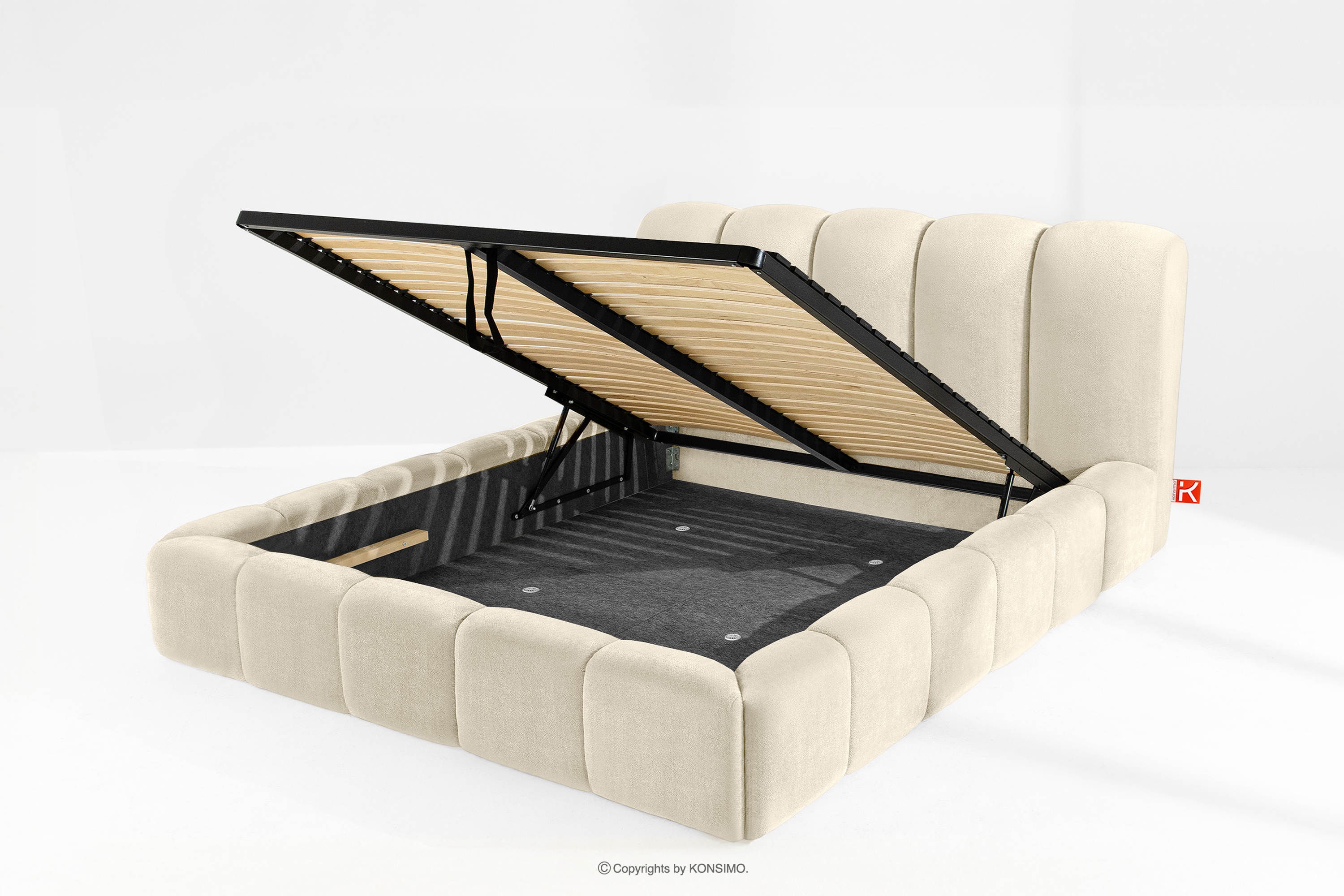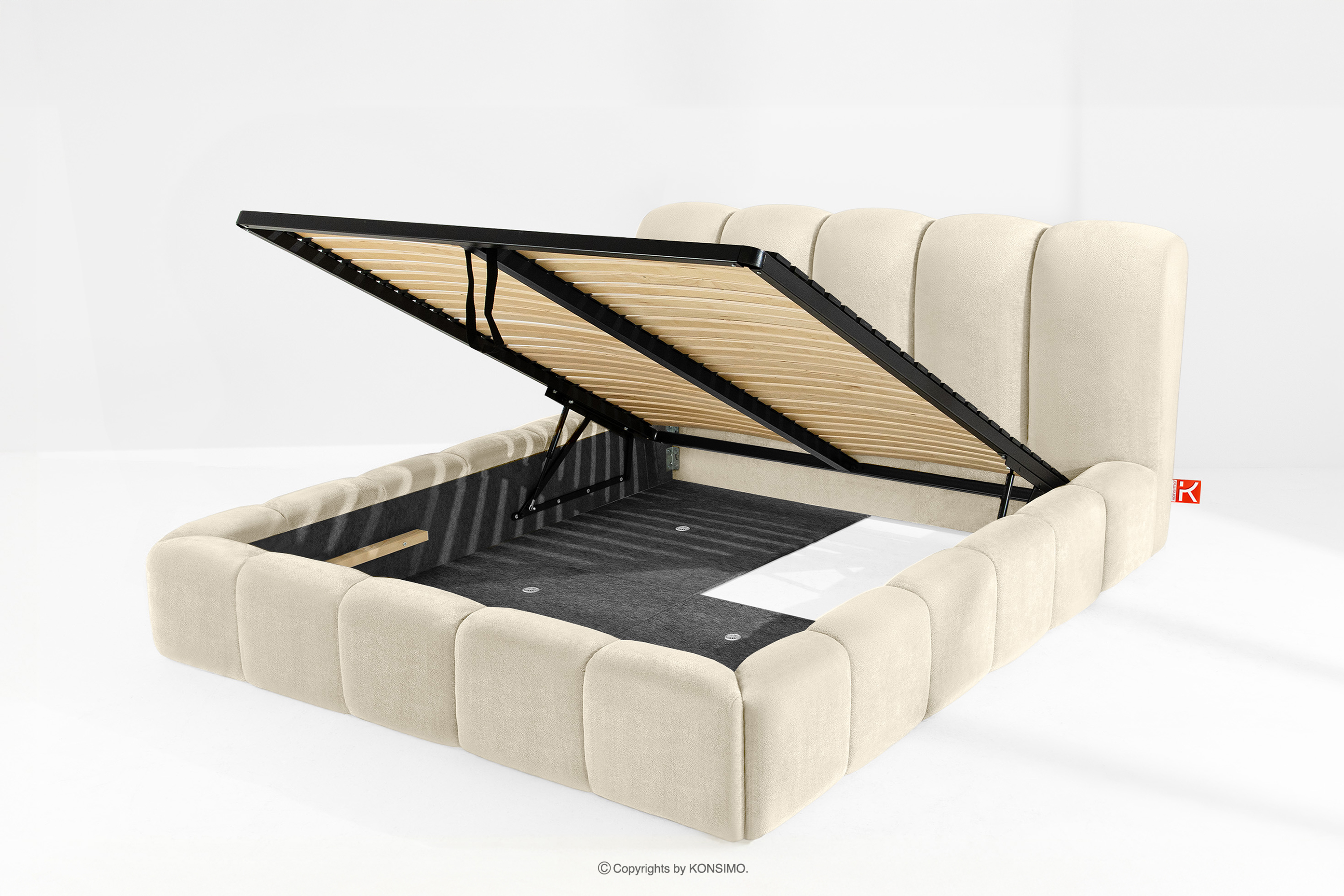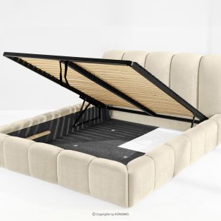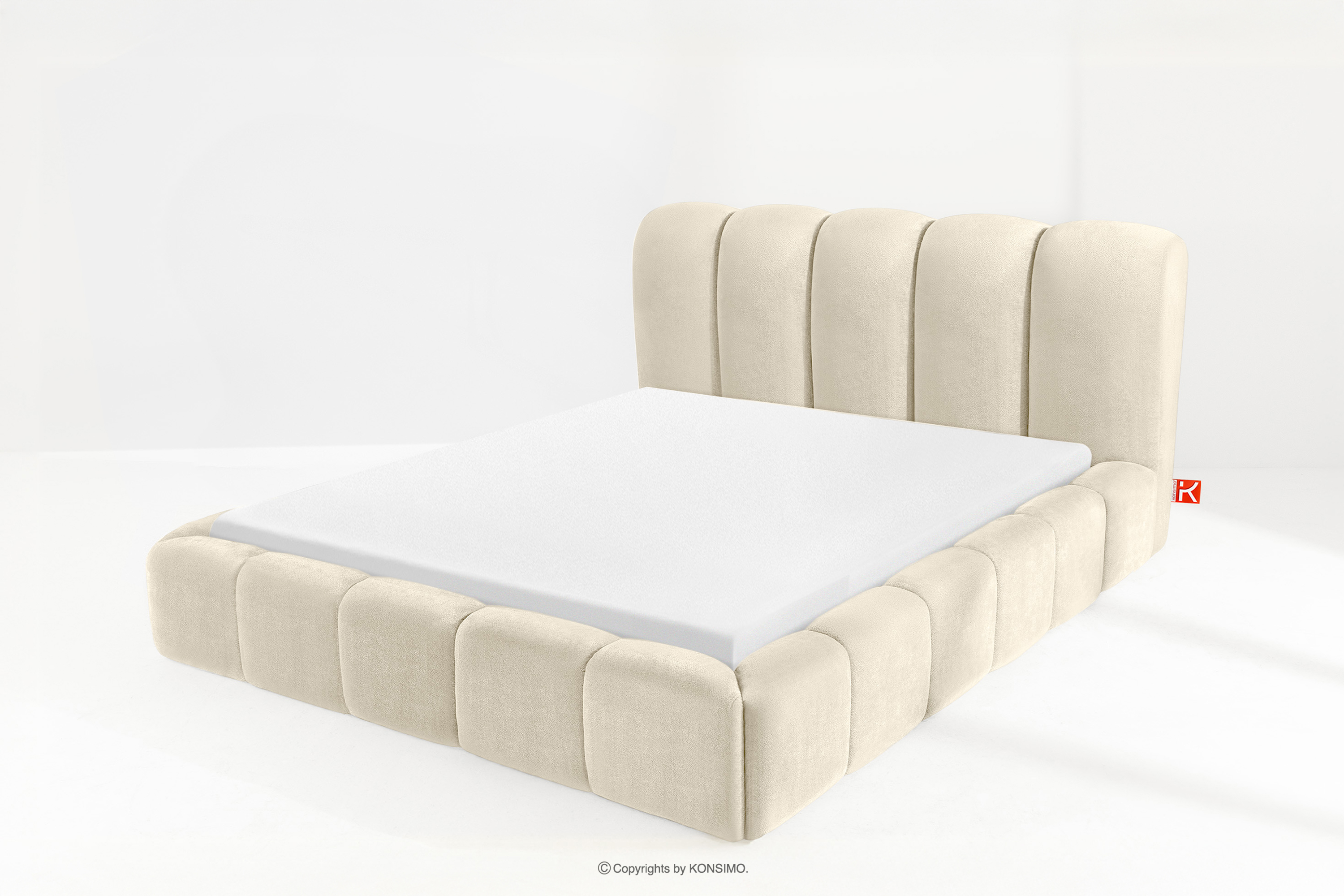 Polsterbett 180 cm im Japandi-Stil mit ecrufarbener Steppung ist eine Hommage an die Schlichtheit, die nicht auf Raffinesse verzichtet und eine ideale Lösung für alle darstellt, die ihr Schlafzimmer in einen Raum der absoluten Ruhe und visuellen Harmonie verwandeln möchten. Eine wichtige Rolle spielt hier der sorgfältig ausgewählte Chenille-Stoff, dessen einzigartiges, flauschiges Garn dem Möbelstück eine unvergleichliche Tiefe und Eleganz verleiht, sodass das Bett nicht nur ein Ort zum Schlafen ist, sondern auch eine echte Zierde des Interieurs.