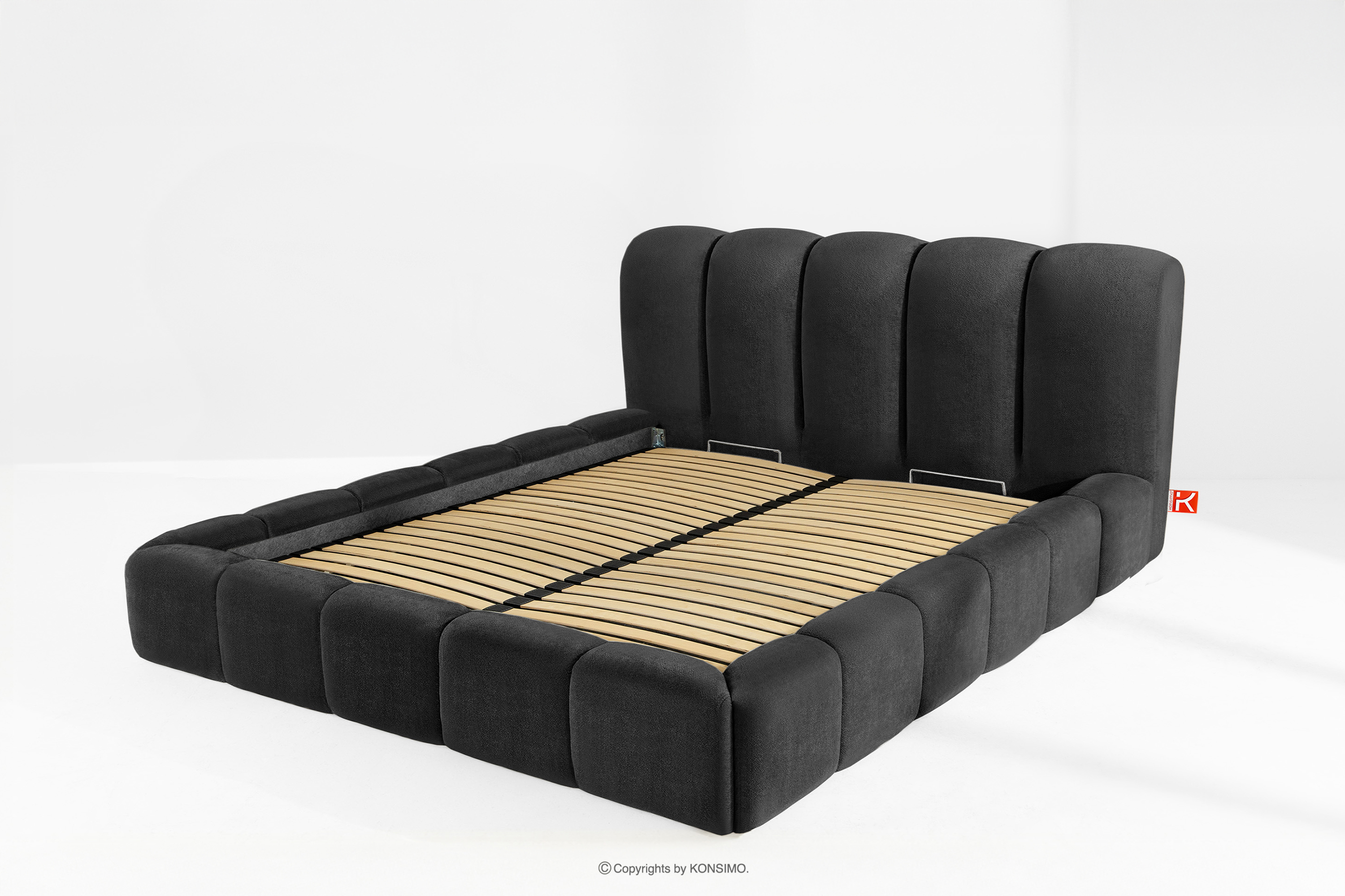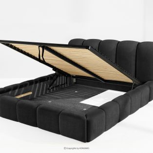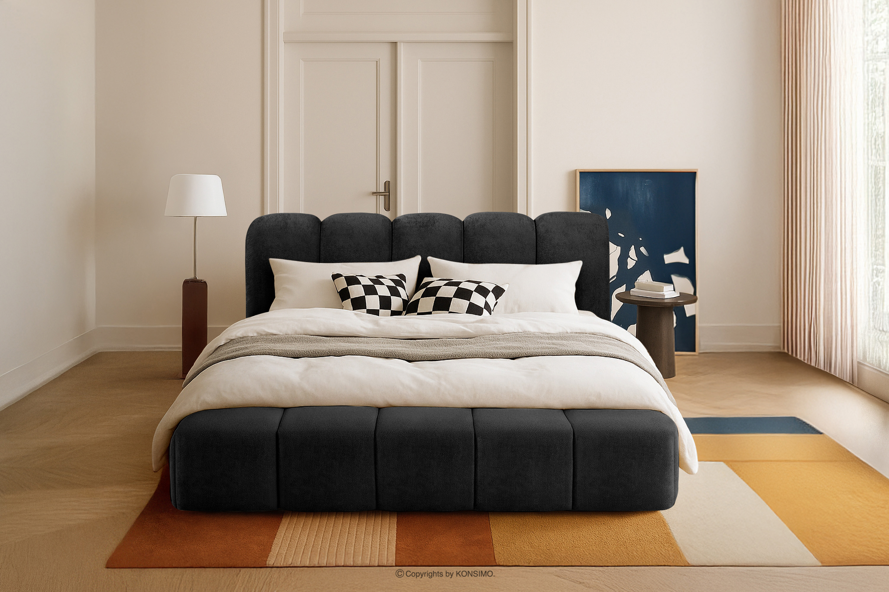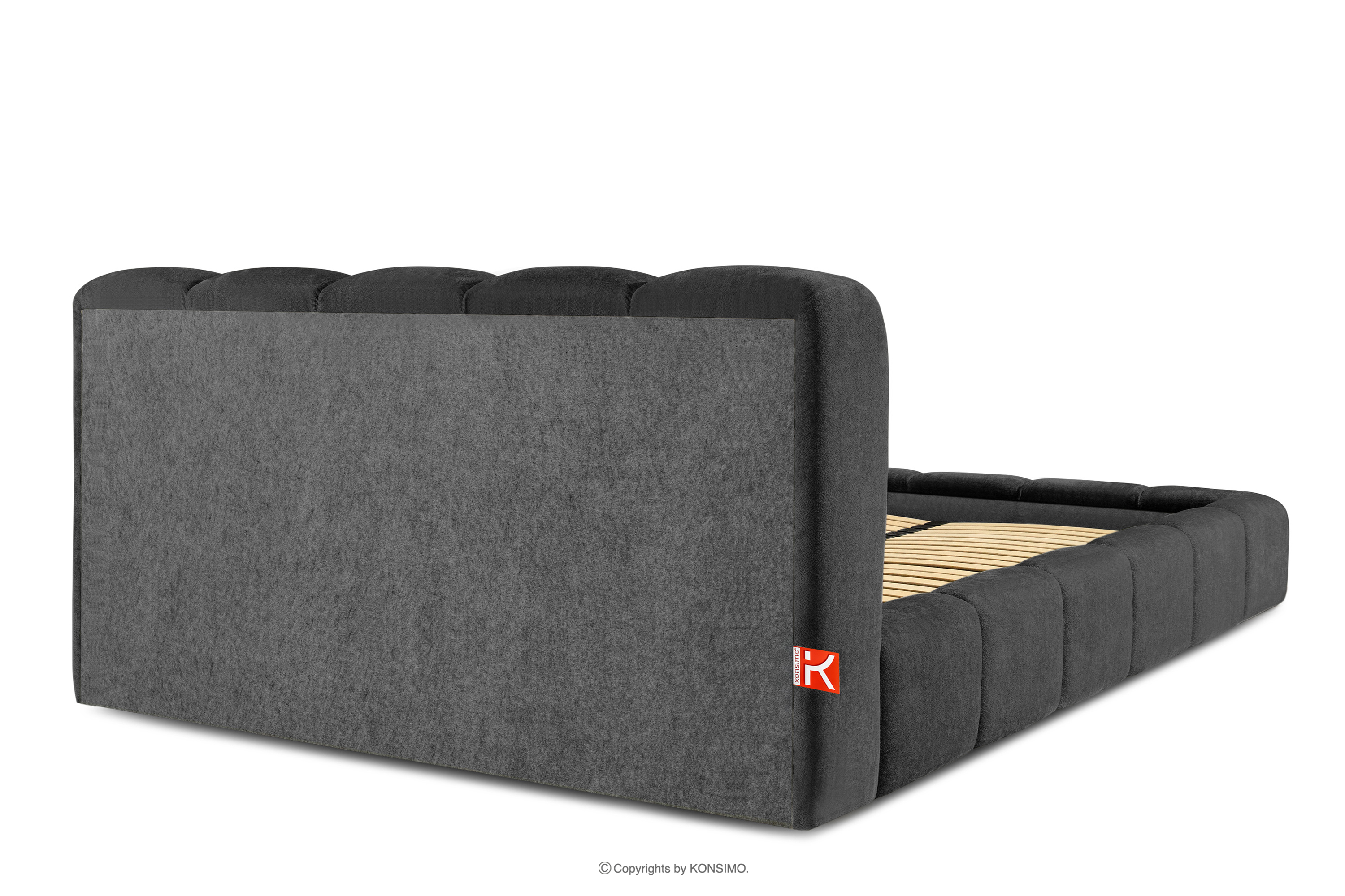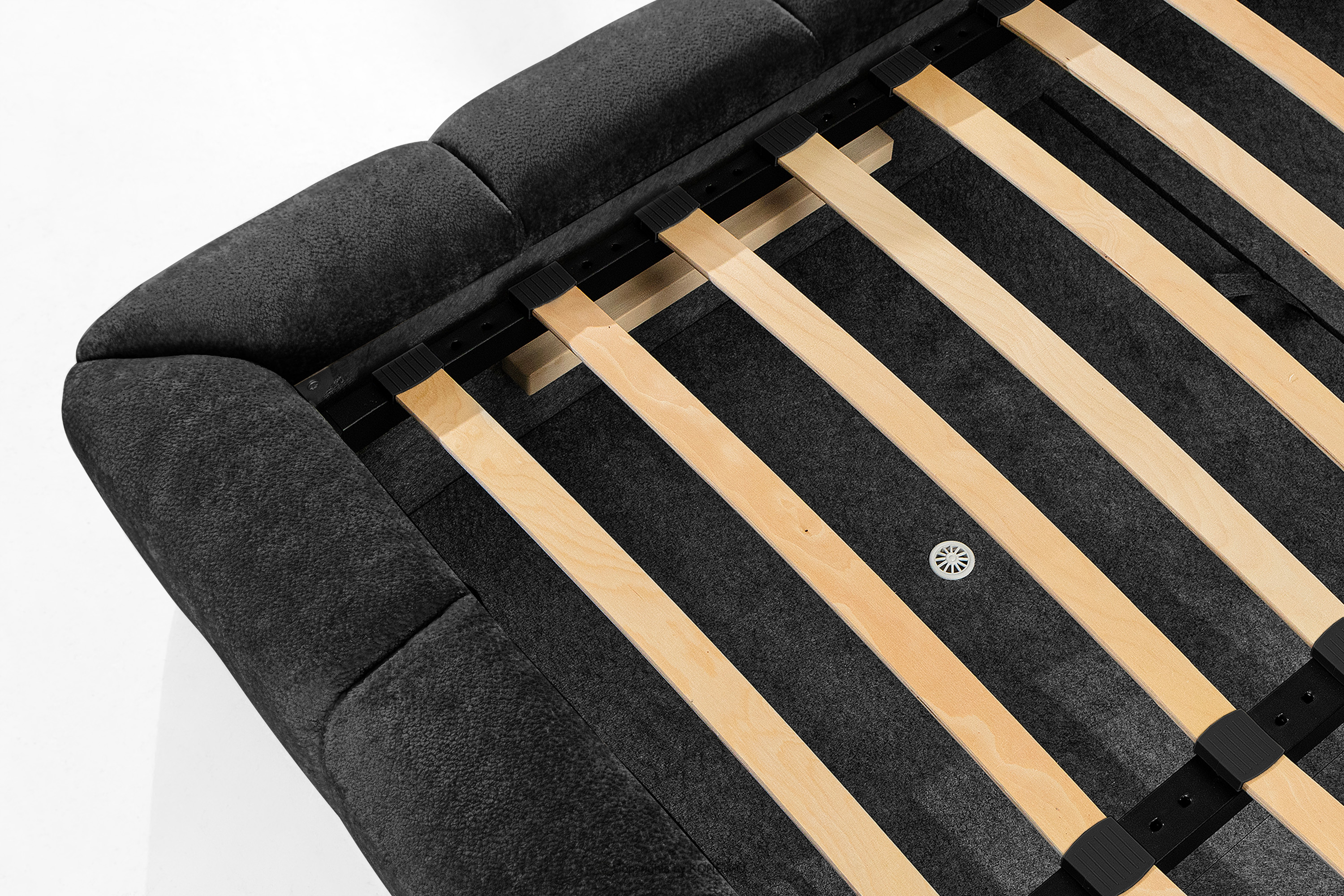 Polsterbett 200 cm mit Steppung in Anthrazit ist eine Hommage an die Schlichtheit, die nicht auf Raffinesse verzichtet und eine ideale Lösung für alle darstellt, die ihr Schlafzimmer in einen Raum der absoluten Ruhe und visuellen Harmonie verwandeln möchten. Eine wichtige Rolle spielt hier der sorgfältig ausgewählte Chenille-Stoff, dessen einzigartiges, flauschiges Garn dem Möbelstück eine unvergleichliche Tiefe und Eleganz verleiht, sodass das Bett nicht nur ein Ort zum Schlafen ist, sondern auch eine echte Zierde des Interieurs.