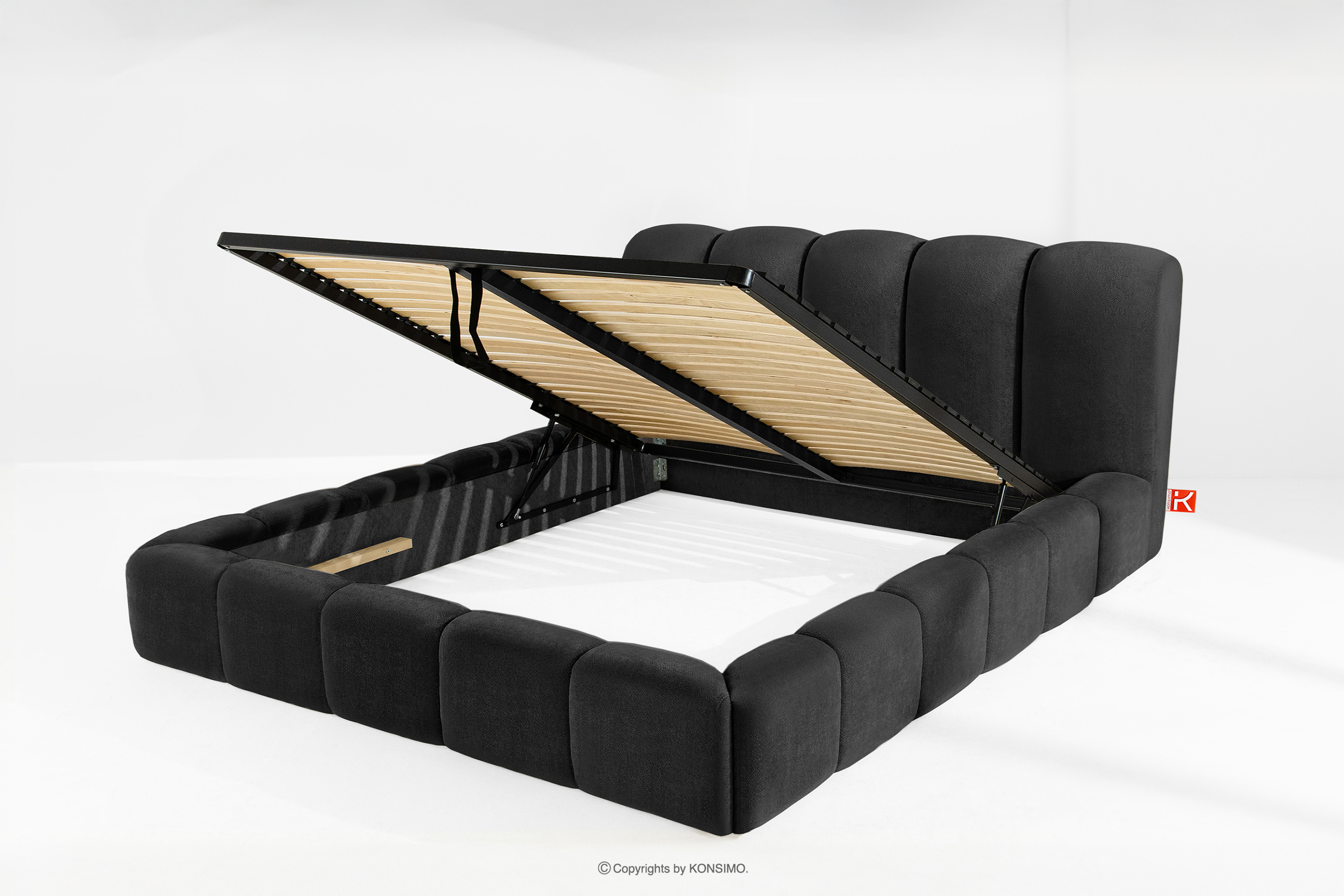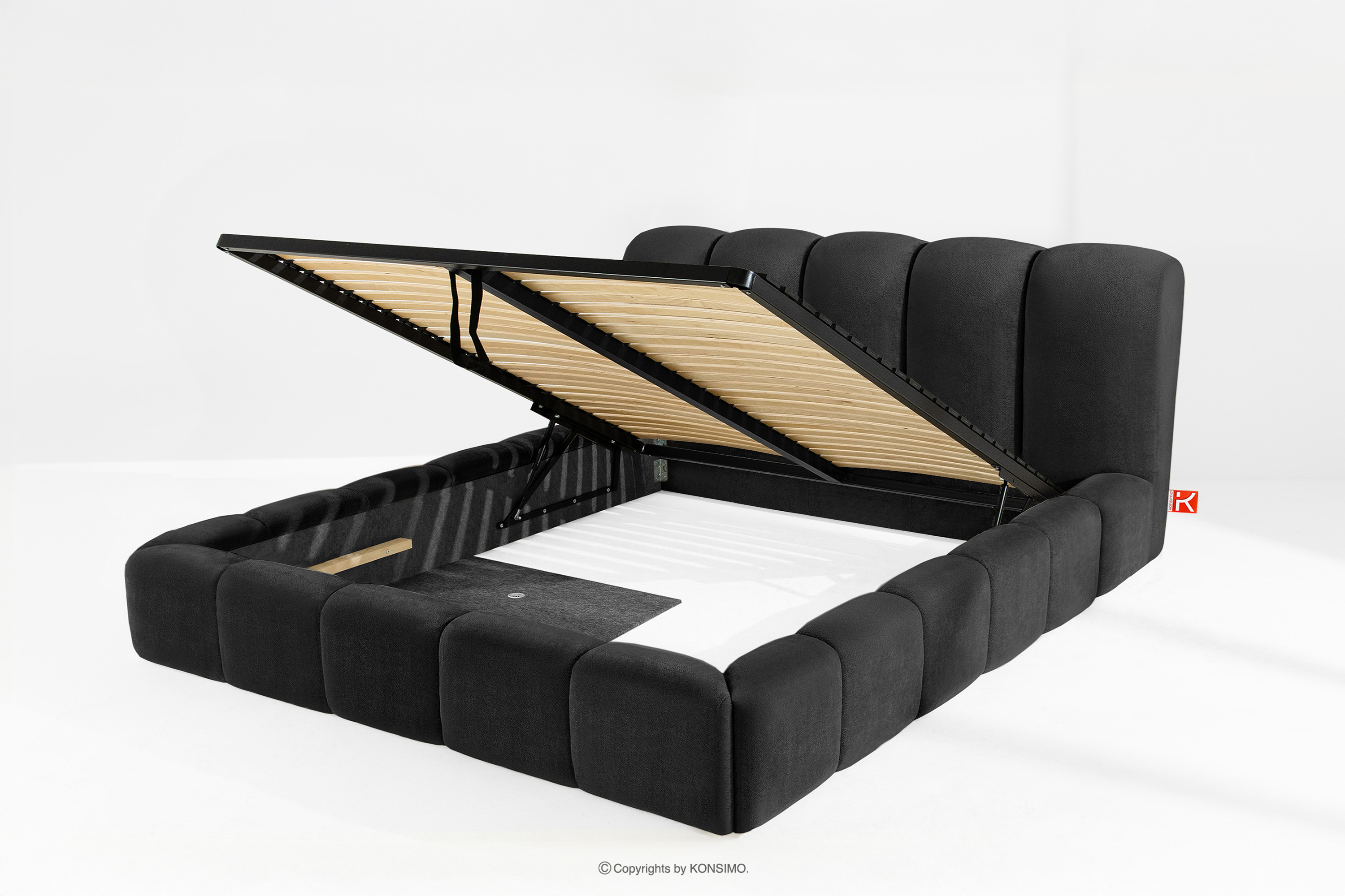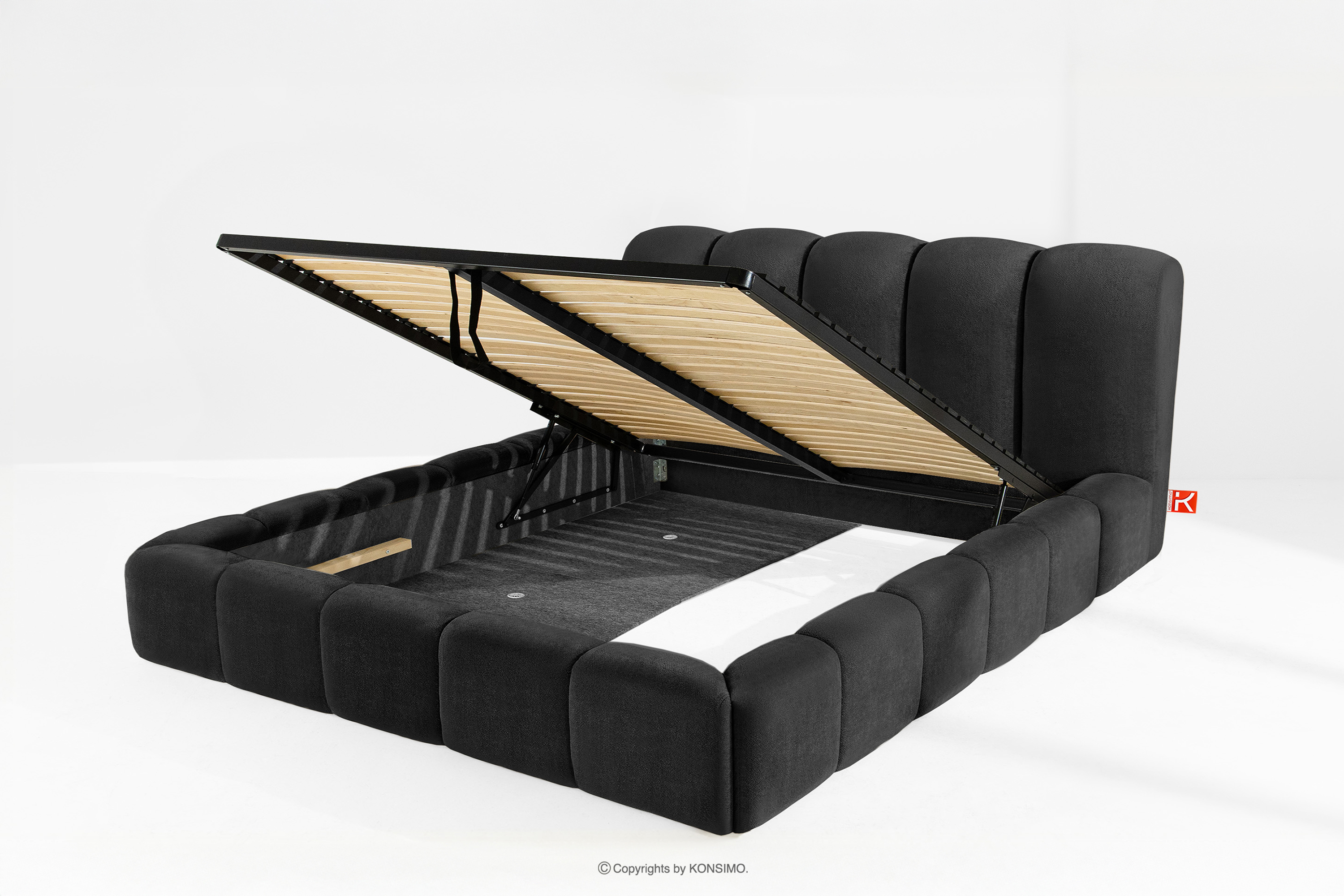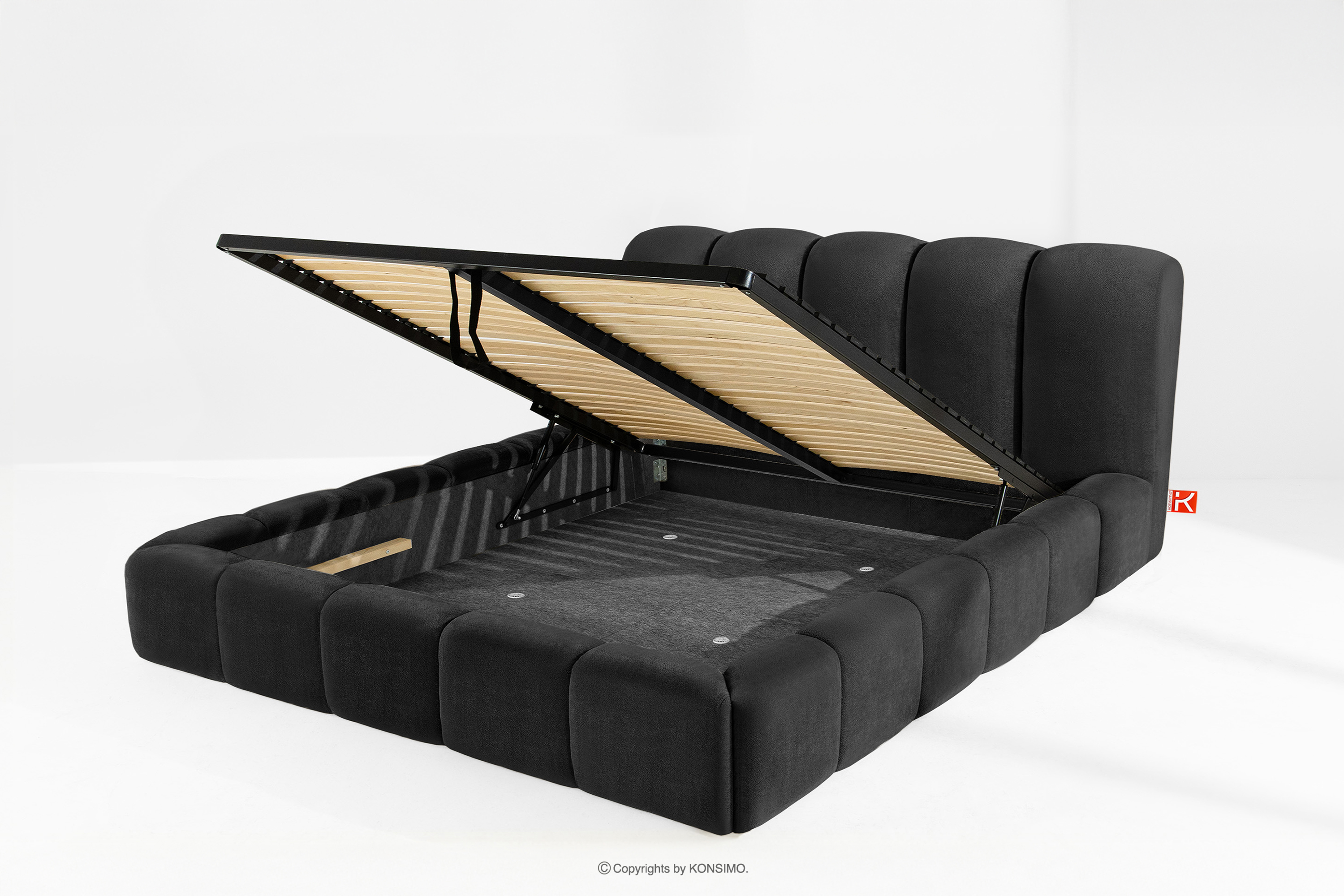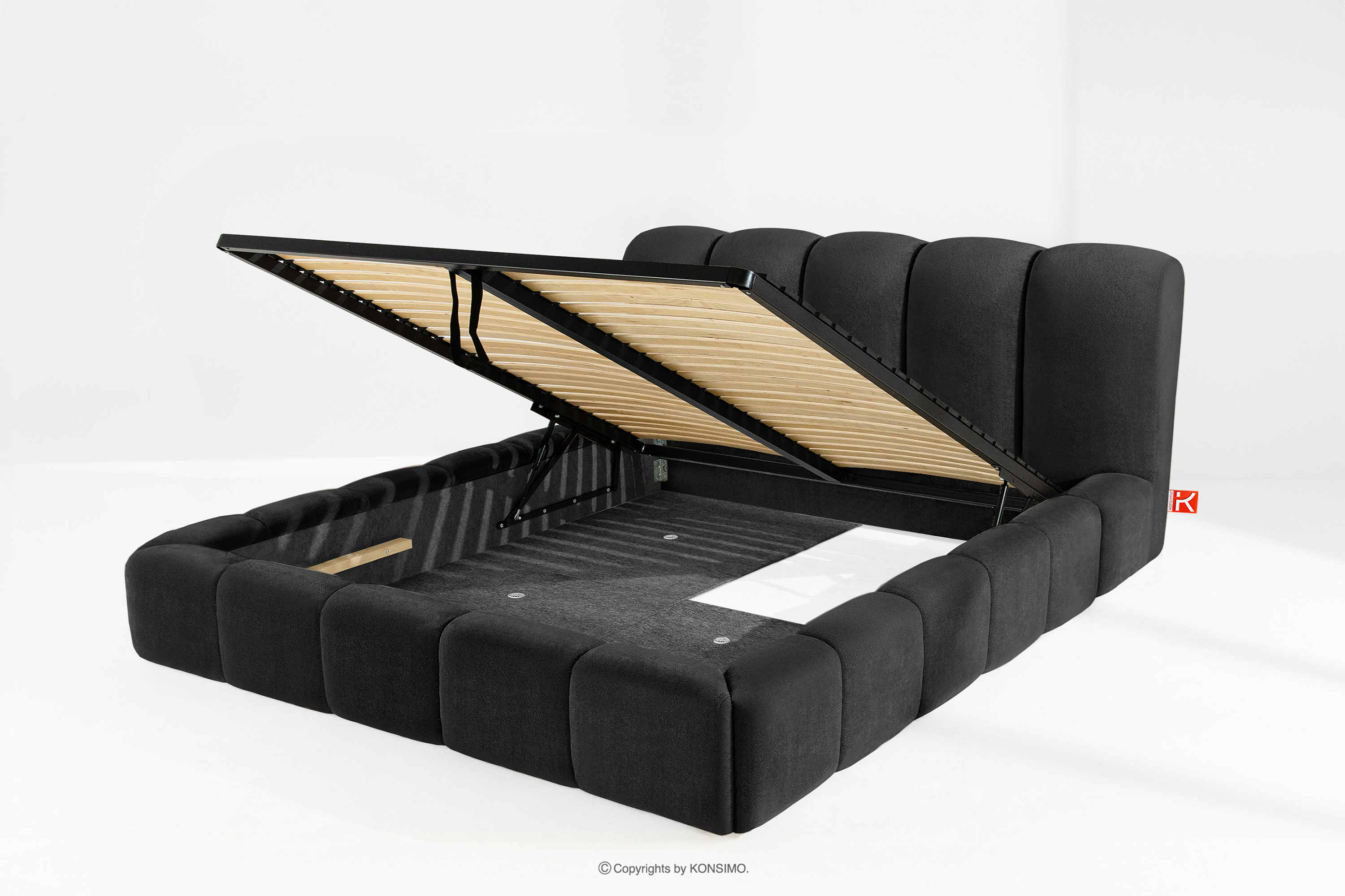 Polsterbett 200 cm mit Steppung in Anthrazit ist eine Hommage an die Schlichtheit, die nicht auf Raffinesse verzichtet und eine ideale Lösung für alle darstellt, die ihr Schlafzimmer in einen Raum der absoluten Ruhe und visuellen Harmonie verwandeln möchten. Eine wichtige Rolle spielt hier der sorgfältig ausgewählte Chenille-Stoff, dessen einzigartiges, flauschiges Garn dem Möbelstück eine unvergleichliche Tiefe und Eleganz verleiht, sodass das Bett nicht nur ein Ort zum Schlafen ist, sondern auch eine echte Zierde des Interieurs.