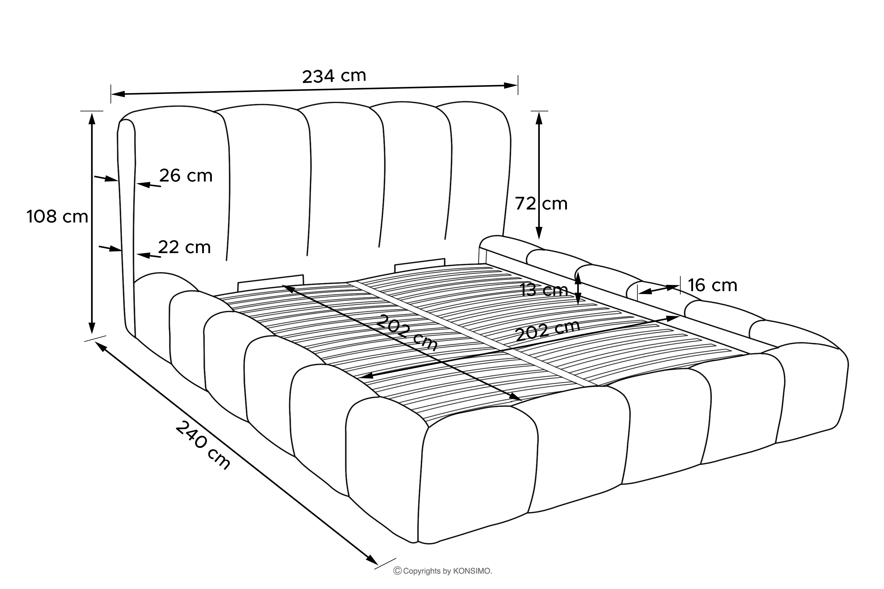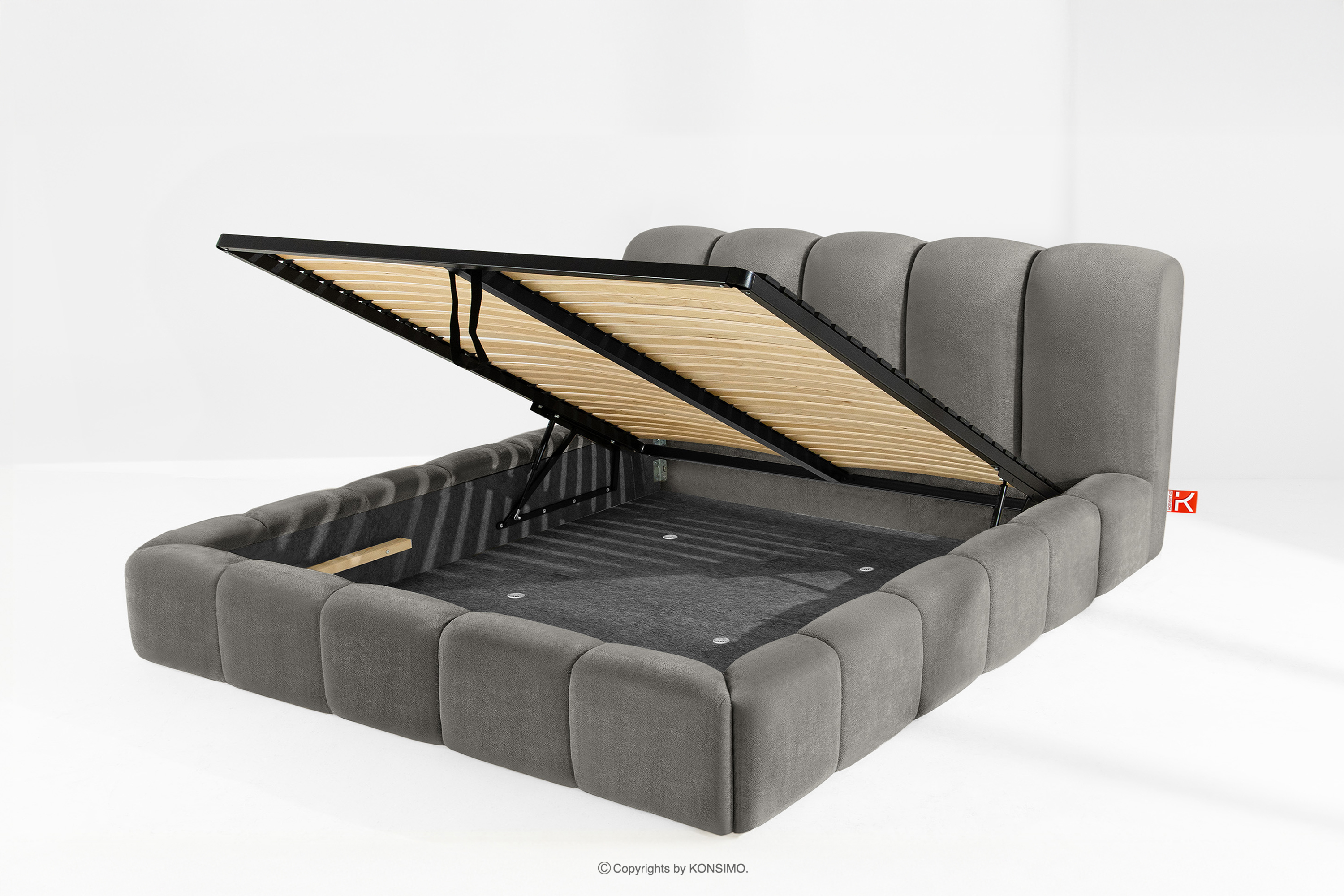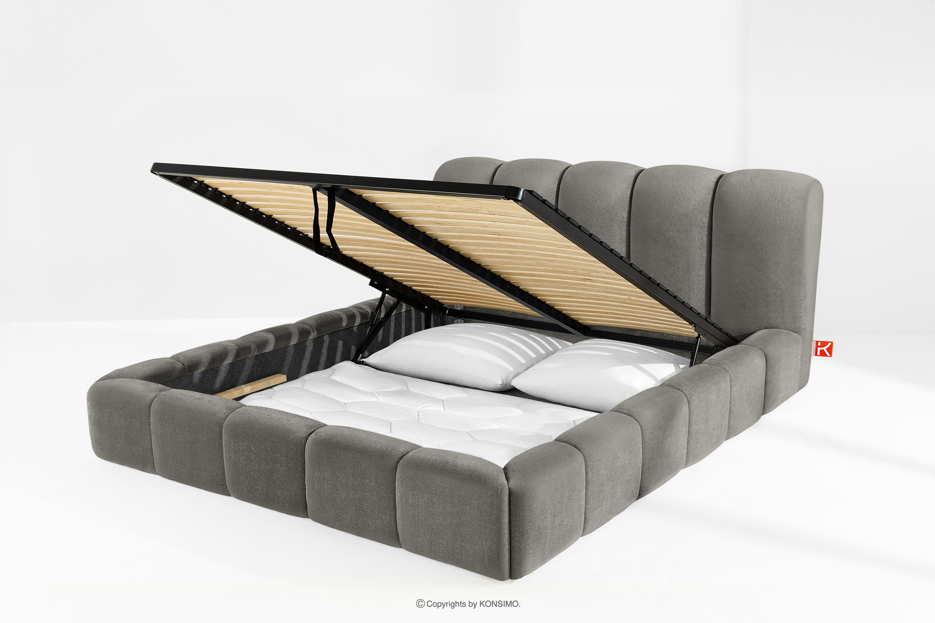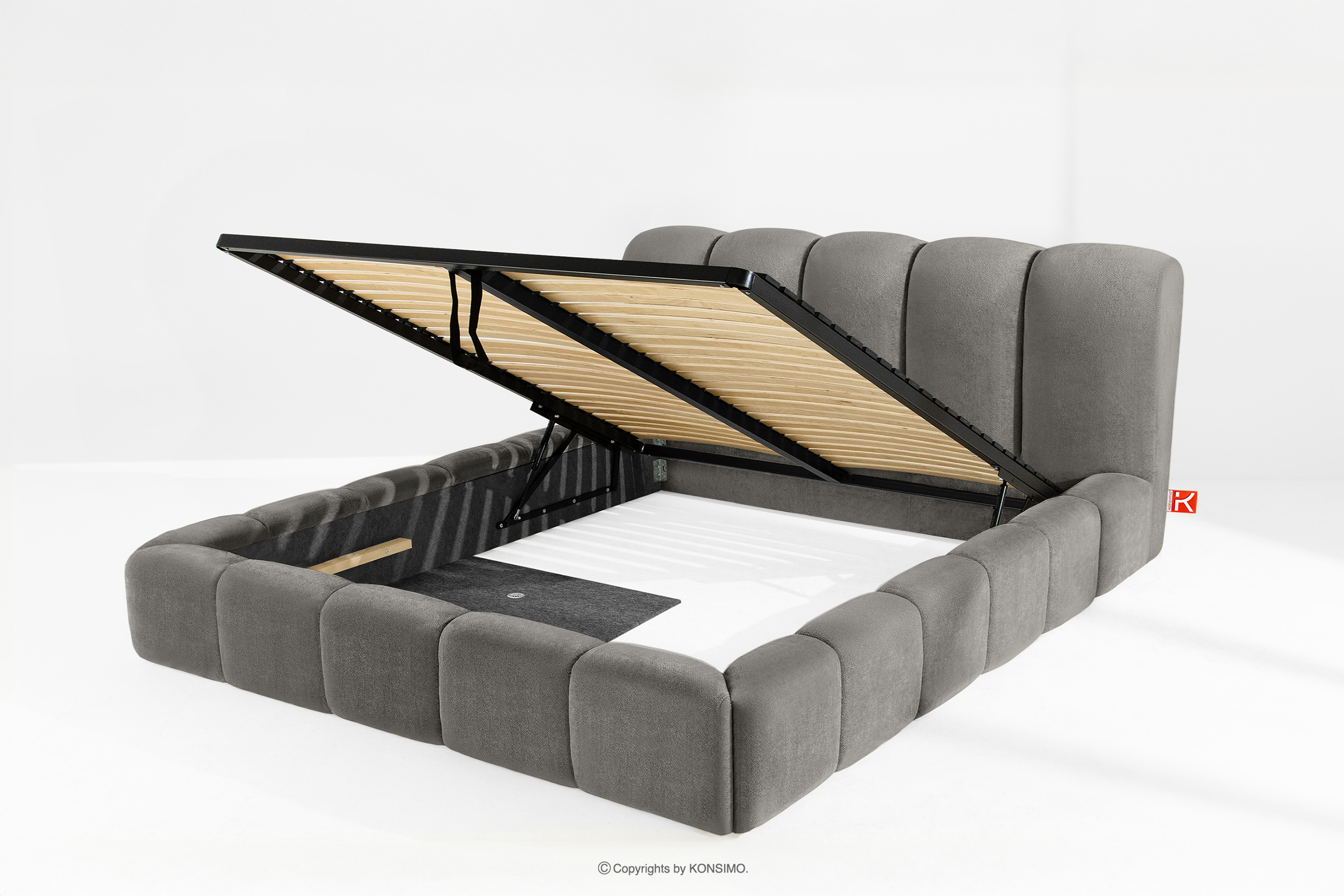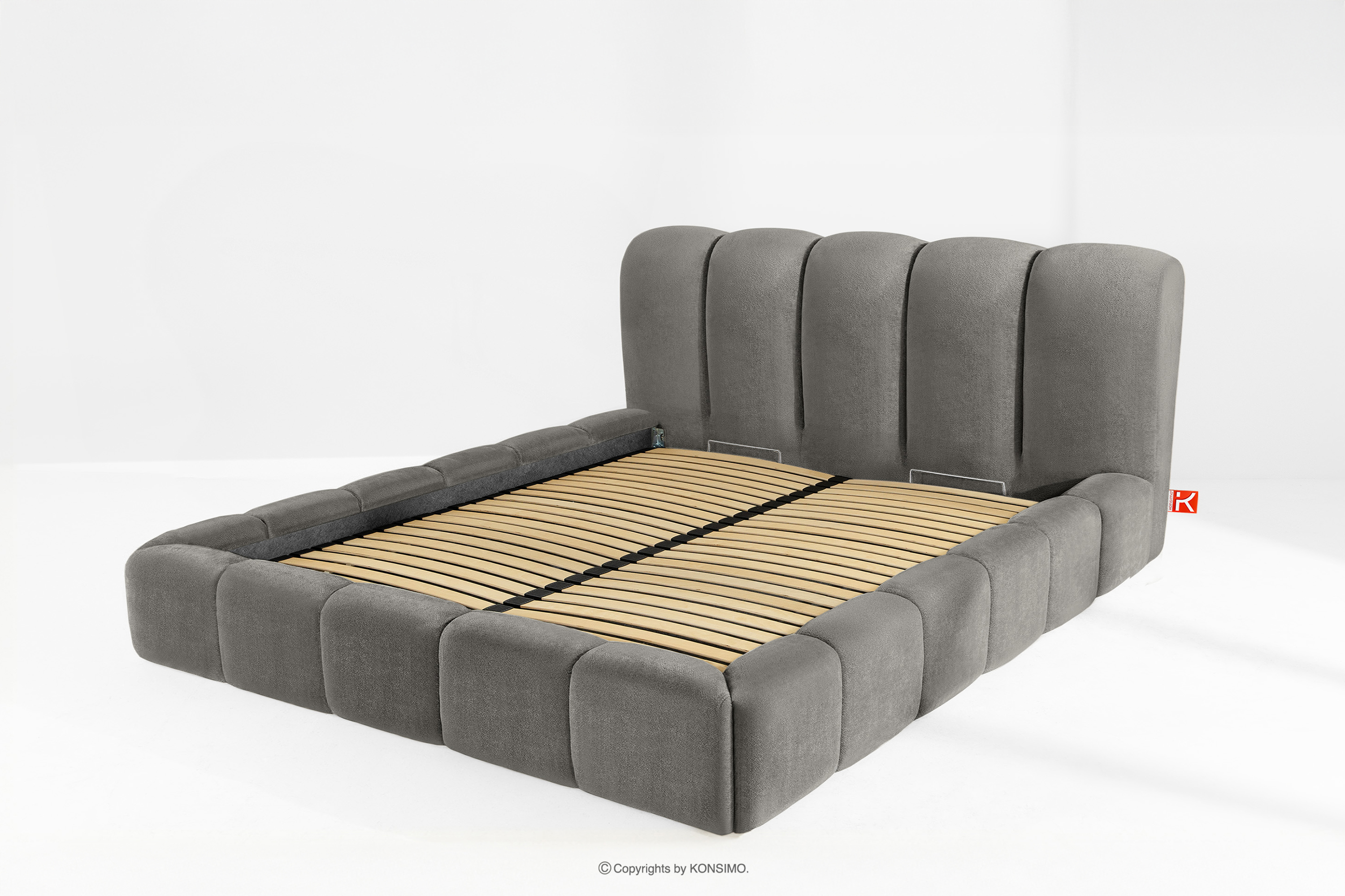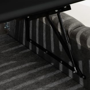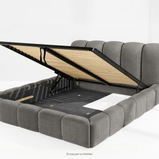 Unter dieser Schicht aus Gemütlichkeit und Weichheit verbirgt sich solide Technik und Funktionalität, die den Anforderungen moderner Wohnungen gerecht wird, in denen jeder Zentimeter Platz Gold wert ist. Die Konstruktion des Bettes basiert auf einem robusten Metallrahmen, der Stabilität und keine störenden Quietschgeräusche garantiert. Die Ausstattung mit hochwertigen Holzlatten sorgt für eine optimale Funktion der Matratze, verbessert ihre Belüftung und reagiert präzise auf den Druck des Körpers der schlafenden Person. Darüber hinaus verbirgt sich unter der gesamten Liegefläche ein äußerst geräumiger Bettkasten, der einen zusätzlichen Schrank oder eine Kommode ersetzen kann und Platz für Bettdecken, Kissen, Decken oder saisonale Kleidung bietet. Damit die Nutzung dieses Stauraums zum reinen Vergnügen wird, haben wir einen fortschrittlichen Mechanismus mit Gasdruckfedern eingebaut. Dank ihm ist zum Anheben der schweren Matratze zusammen mit dem Lattenrost keine Kraft erforderlich – der Mechanismus arbeitet reibungslos und leise und hält den Lattenrost beim Verstauen von Gegenständen oben, wodurch das tägliche Bettenmachen oder Verstauen von Bettwäsche zu einem schnellen, leichten und intuitiven Vorgang wird, der der Philosophie des funktionalen Minimalismus entspricht.