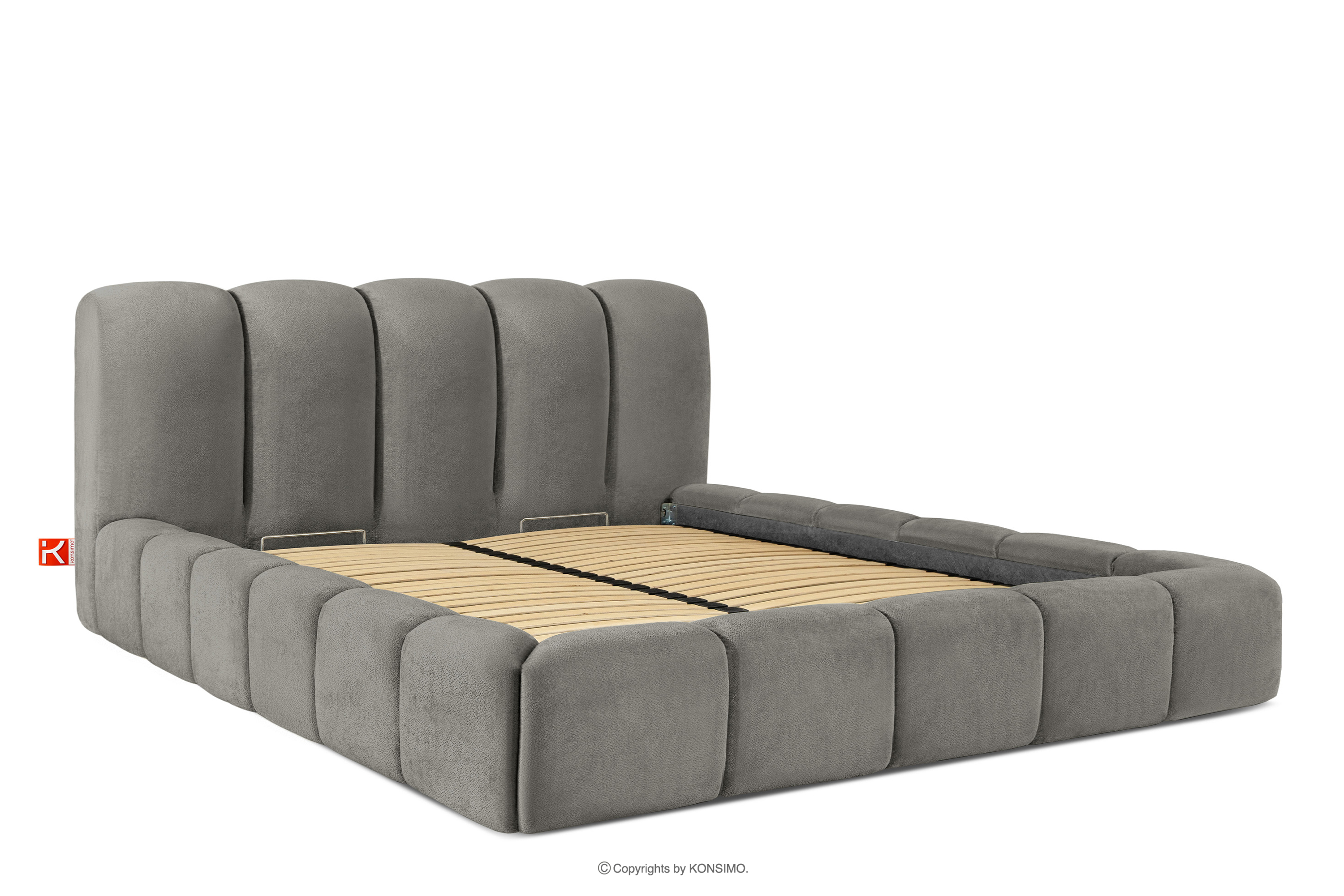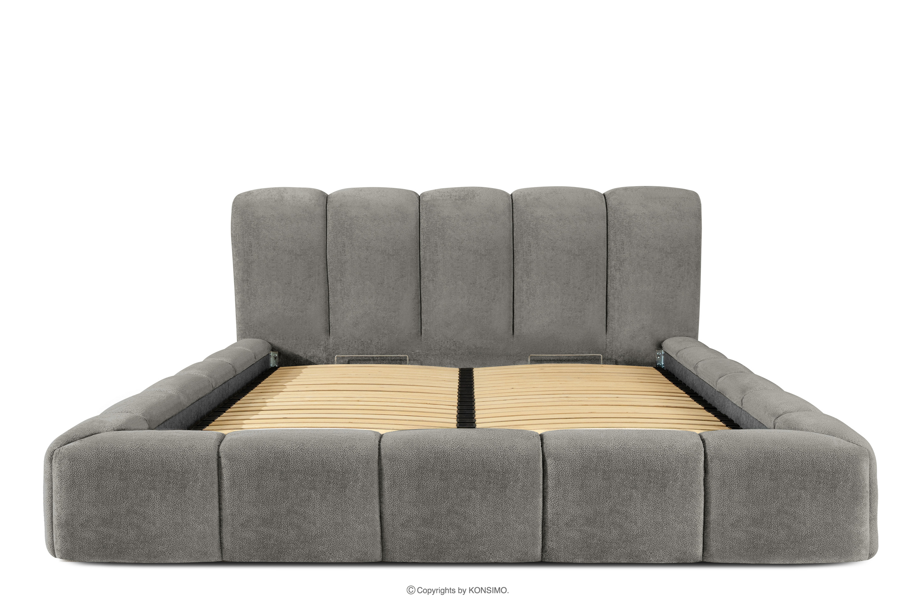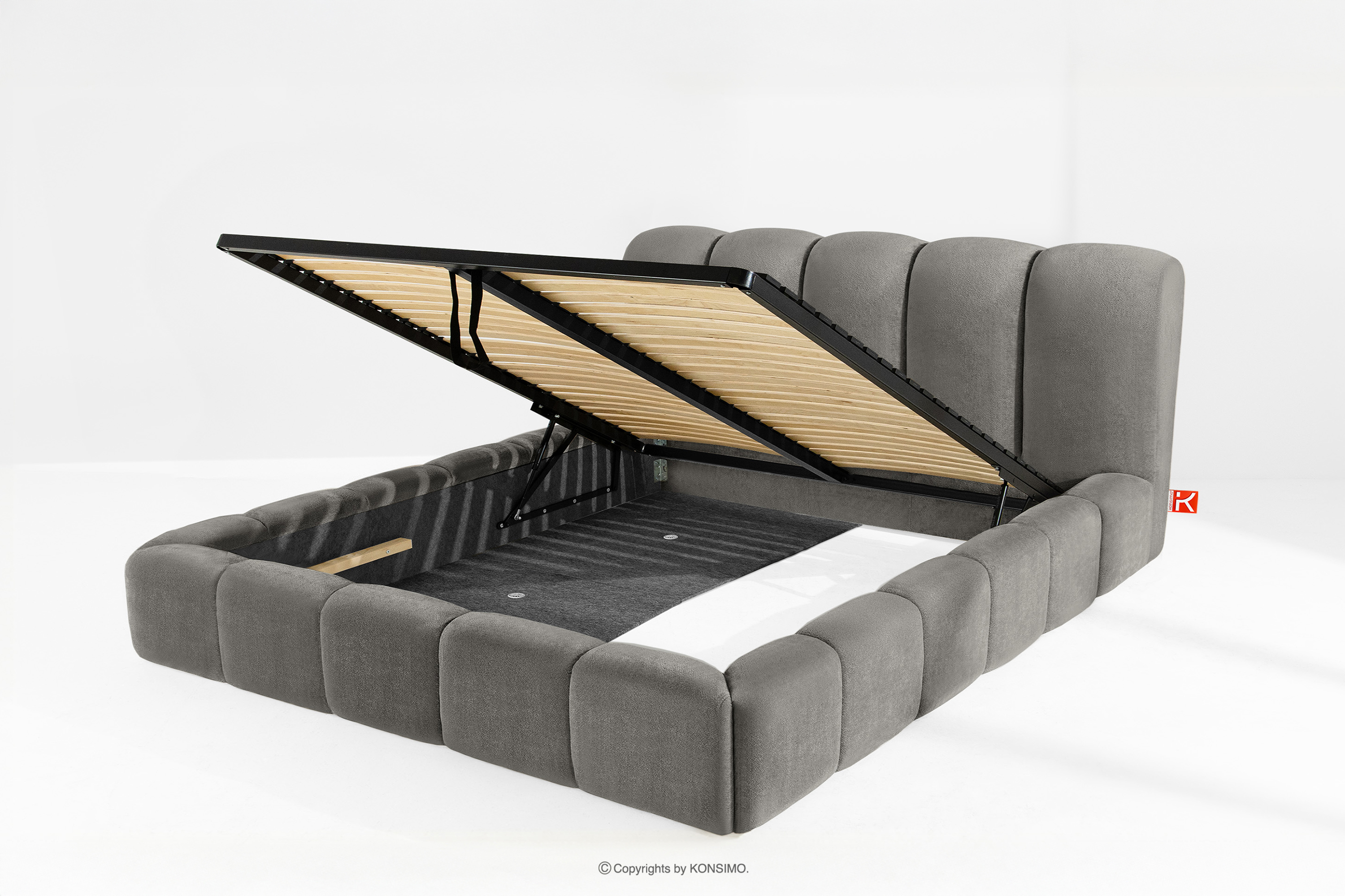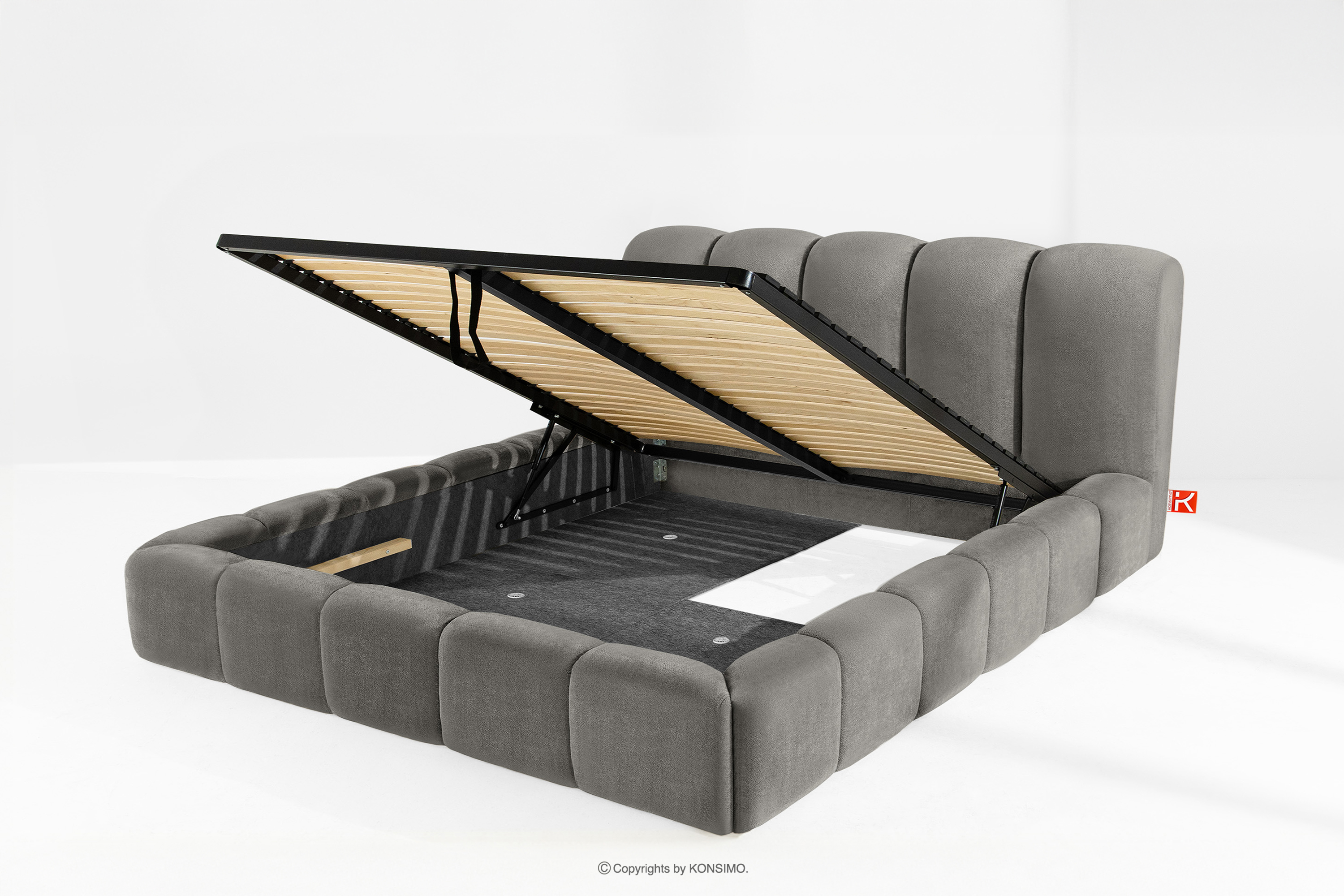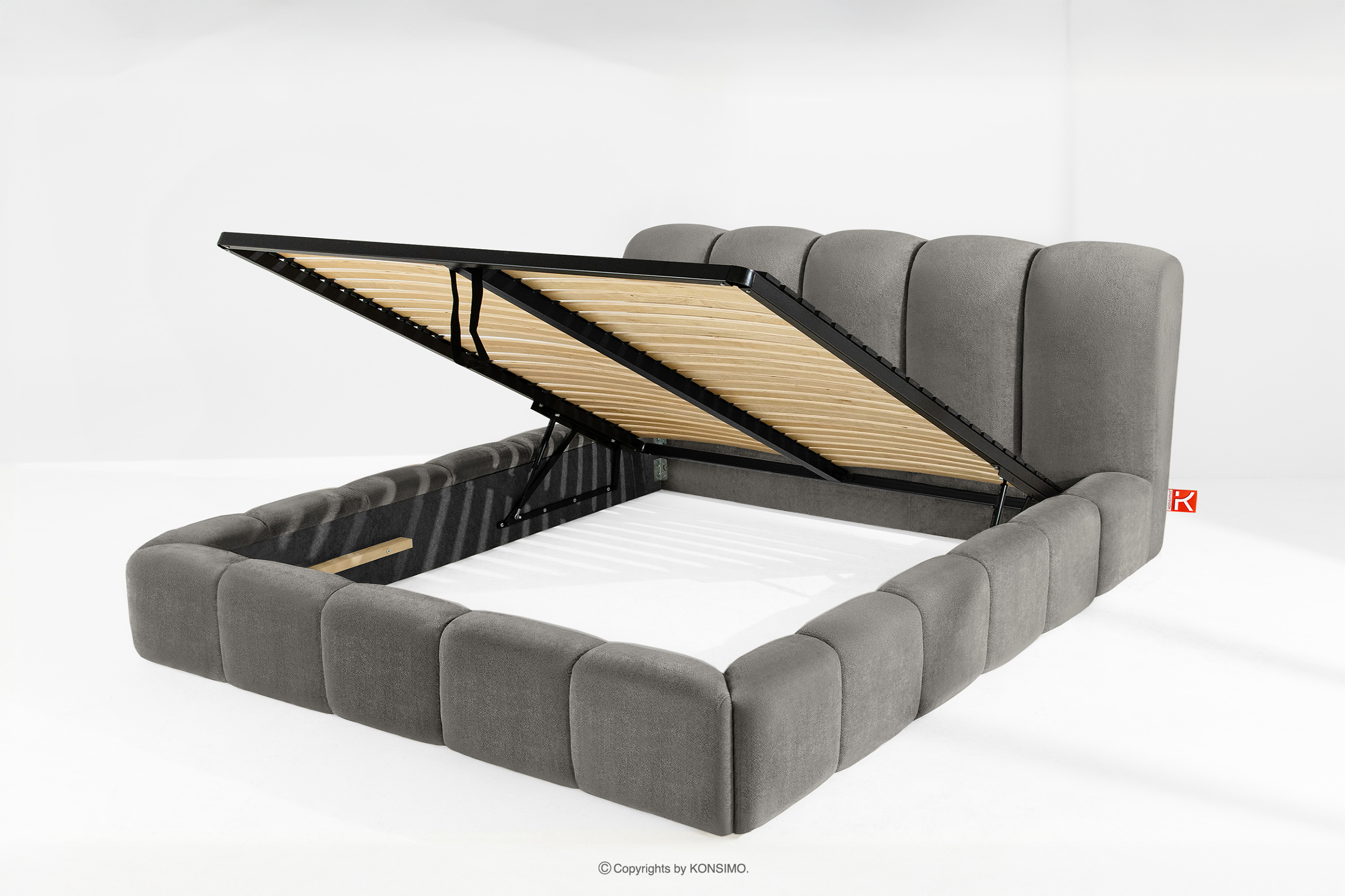 Unter dieser Schicht aus Gemütlichkeit und Weichheit verbirgt sich solide Technik und Funktionalität, die den Anforderungen moderner Wohnungen gerecht wird, in denen jeder Zentimeter Platz Gold wert ist. Die Konstruktion des Bettes basiert auf einem robusten Metallrahmen, der Stabilität und keine störenden Quietschgeräusche garantiert. Die Ausstattung mit hochwertigen Holzlatten sorgt für eine optimale Funktion der Matratze, verbessert ihre Belüftung und reagiert präzise auf den Druck des Körpers der schlafenden Person. Darüber hinaus verbirgt sich unter der gesamten Liegefläche ein äußerst geräumiger Bettkasten, der einen zusätzlichen Schrank oder eine Kommode ersetzen kann und Platz für Bettdecken, Kissen, Decken oder saisonale Kleidung bietet. Damit die Nutzung dieses Stauraums zum reinen Vergnügen wird, haben wir einen fortschrittlichen Mechanismus mit Gasdruckfedern eingebaut. Dank ihm ist zum Anheben der schweren Matratze zusammen mit dem Lattenrost keine Kraft erforderlich – der Mechanismus arbeitet reibungslos und leise und hält den Lattenrost beim Verstauen von Gegenständen oben, wodurch das tägliche Bettenmachen oder Verstauen von Bettwäsche zu einem schnellen, leichten und intuitiven Vorgang wird, der der Philosophie des funktionalen Minimalismus entspricht.