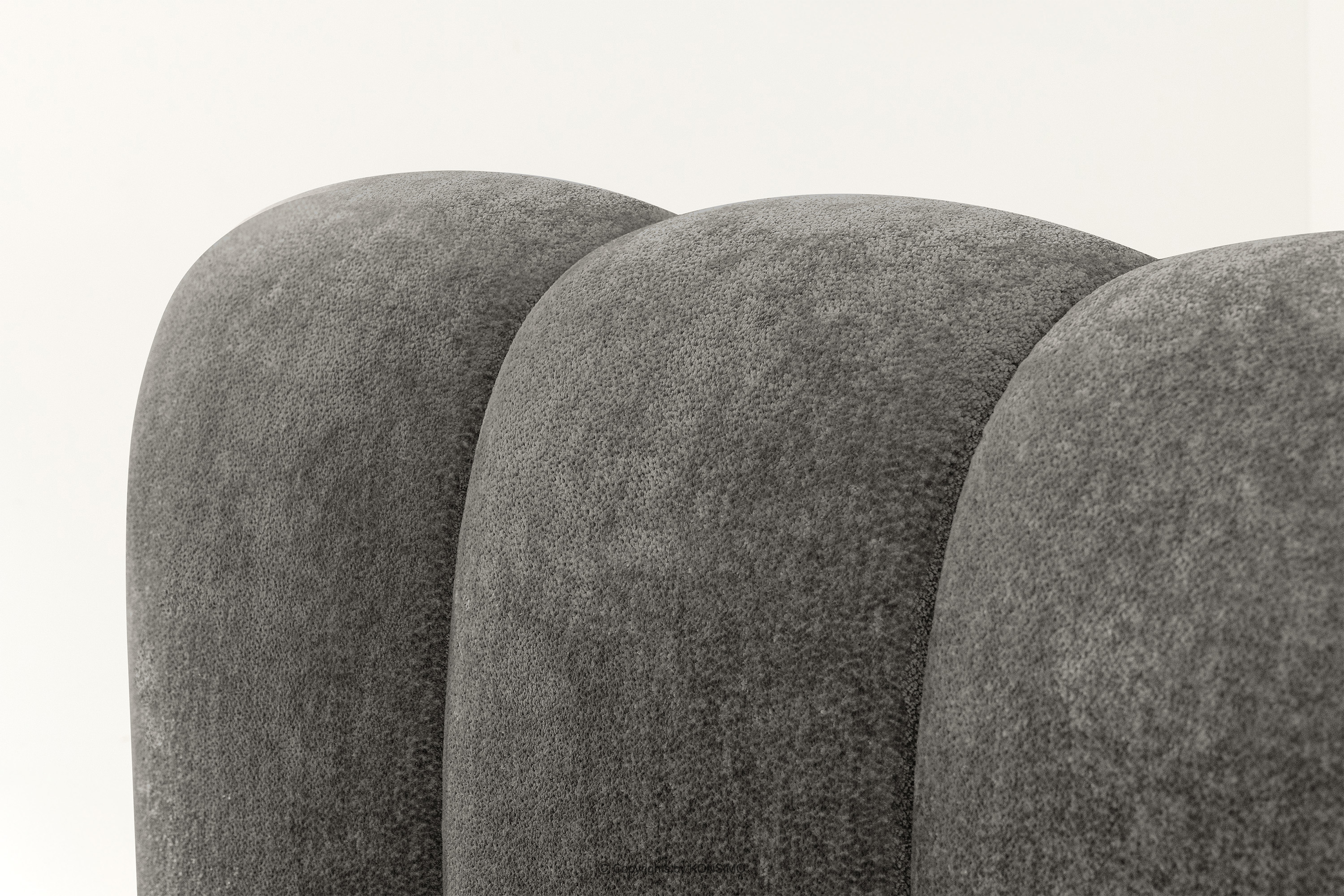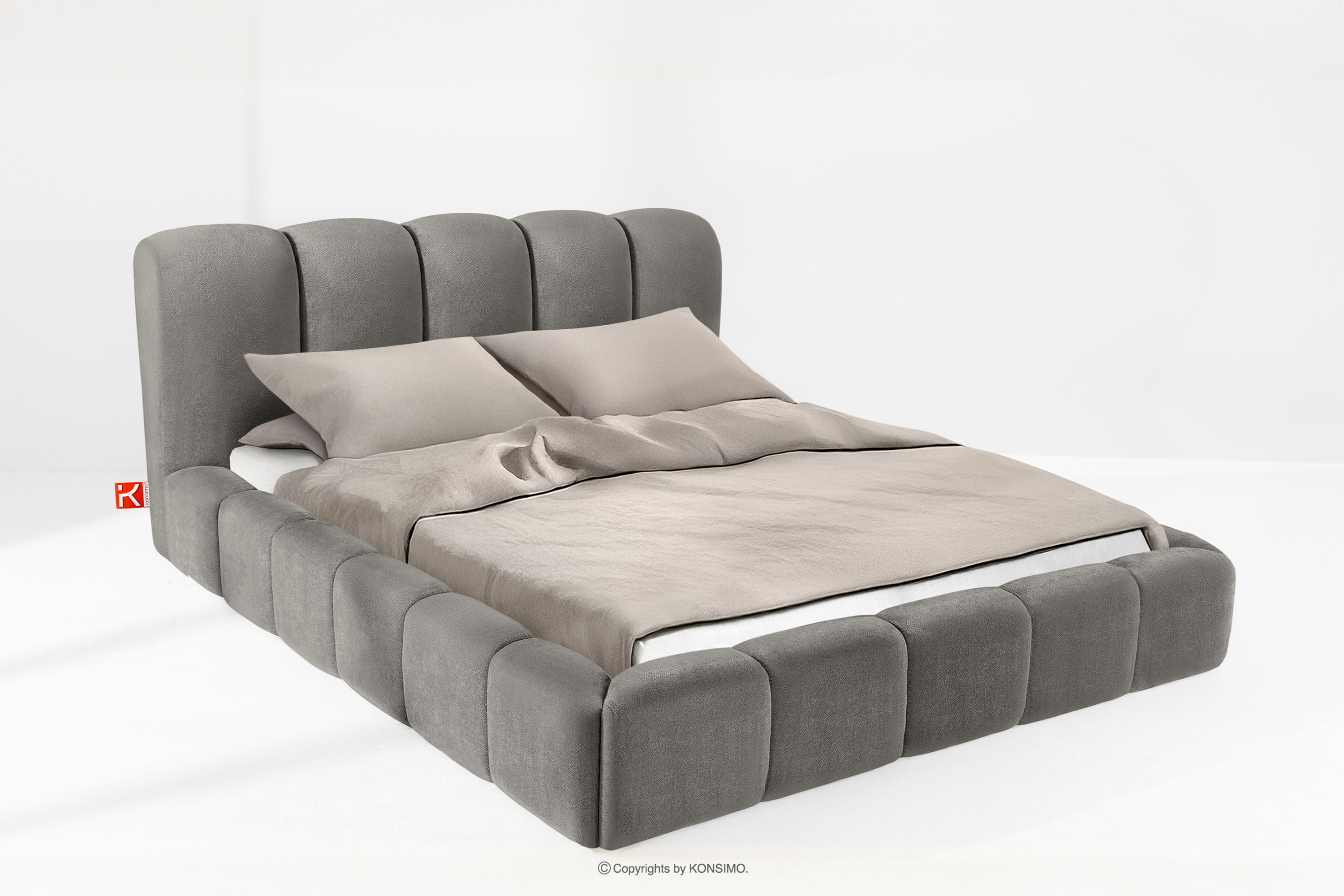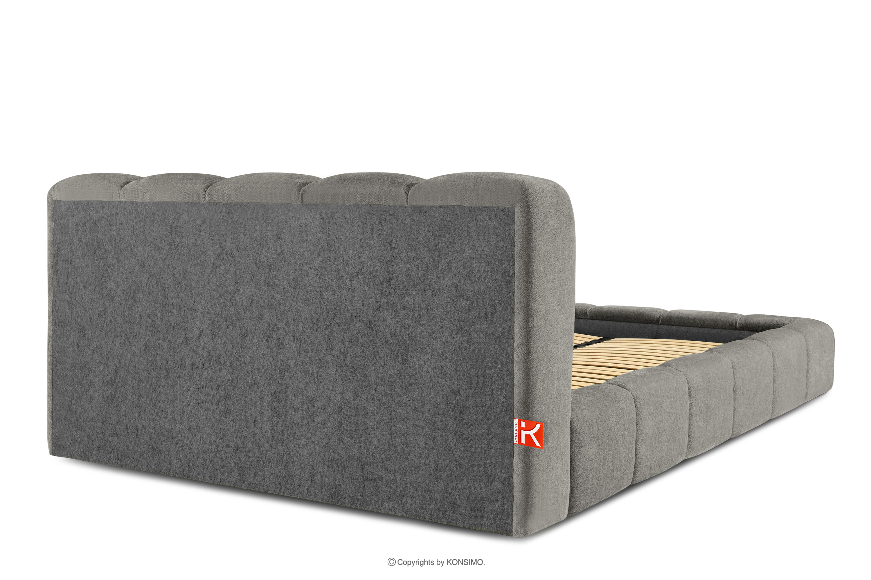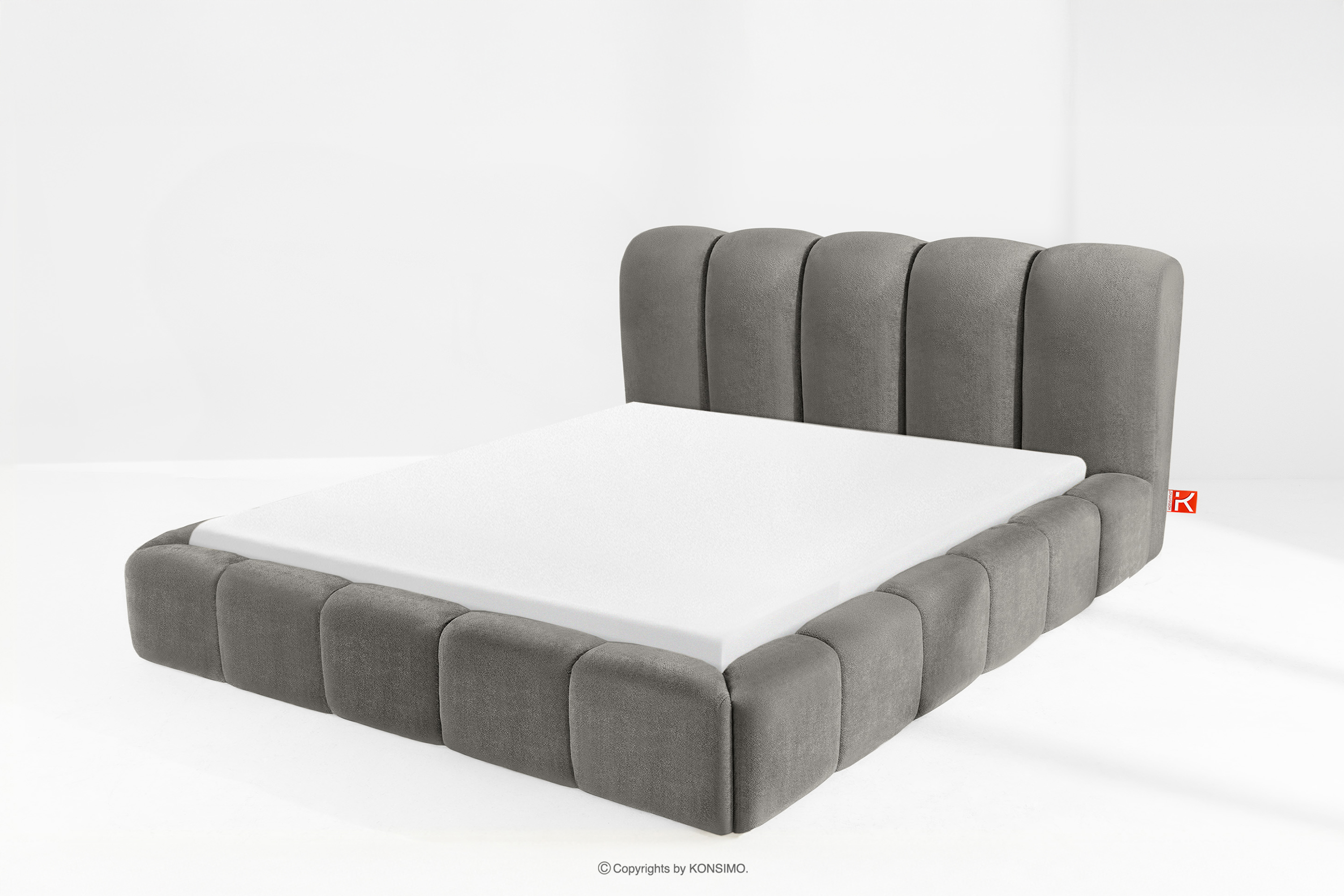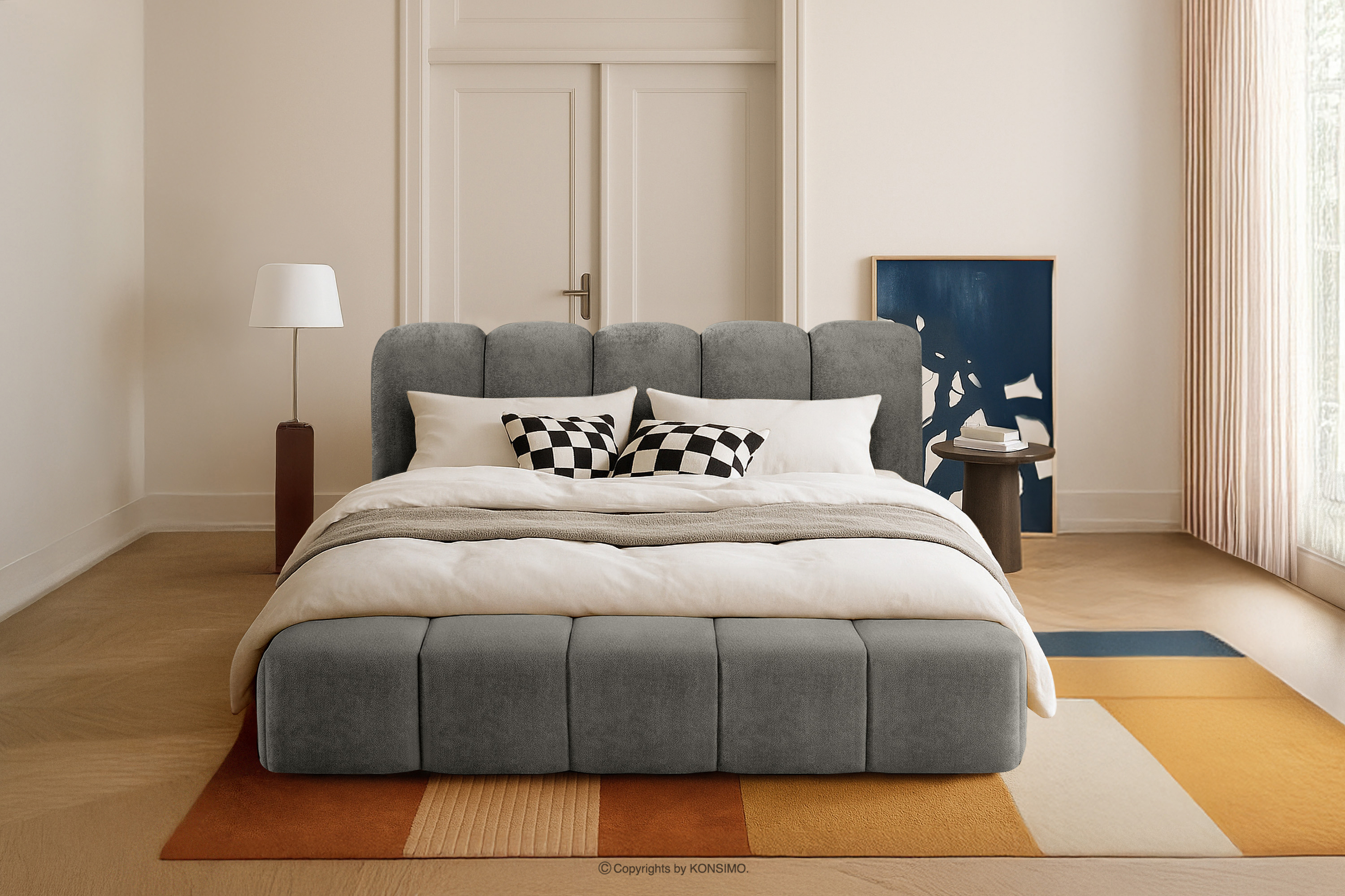 Polsterbett 200 cm mit Steppung in Dunkelgrau ist eine Hommage an die Schlichtheit, die nicht auf Raffinesse verzichtet und eine ideale Lösung für alle darstellt, die ihr Schlafzimmer in einen Raum der absoluten Ruhe und visuellen Harmonie verwandeln möchten. Eine wichtige Rolle spielt hier der sorgfältig ausgewählte Chenille-Stoff, dessen einzigartiges, flauschiges Garn dem Möbelstück eine unvergleichliche Tiefe und Eleganz verleiht, sodass das Bett nicht nur ein Ort zum Schlafen ist, sondern auch eine echte Zierde des Interieurs.