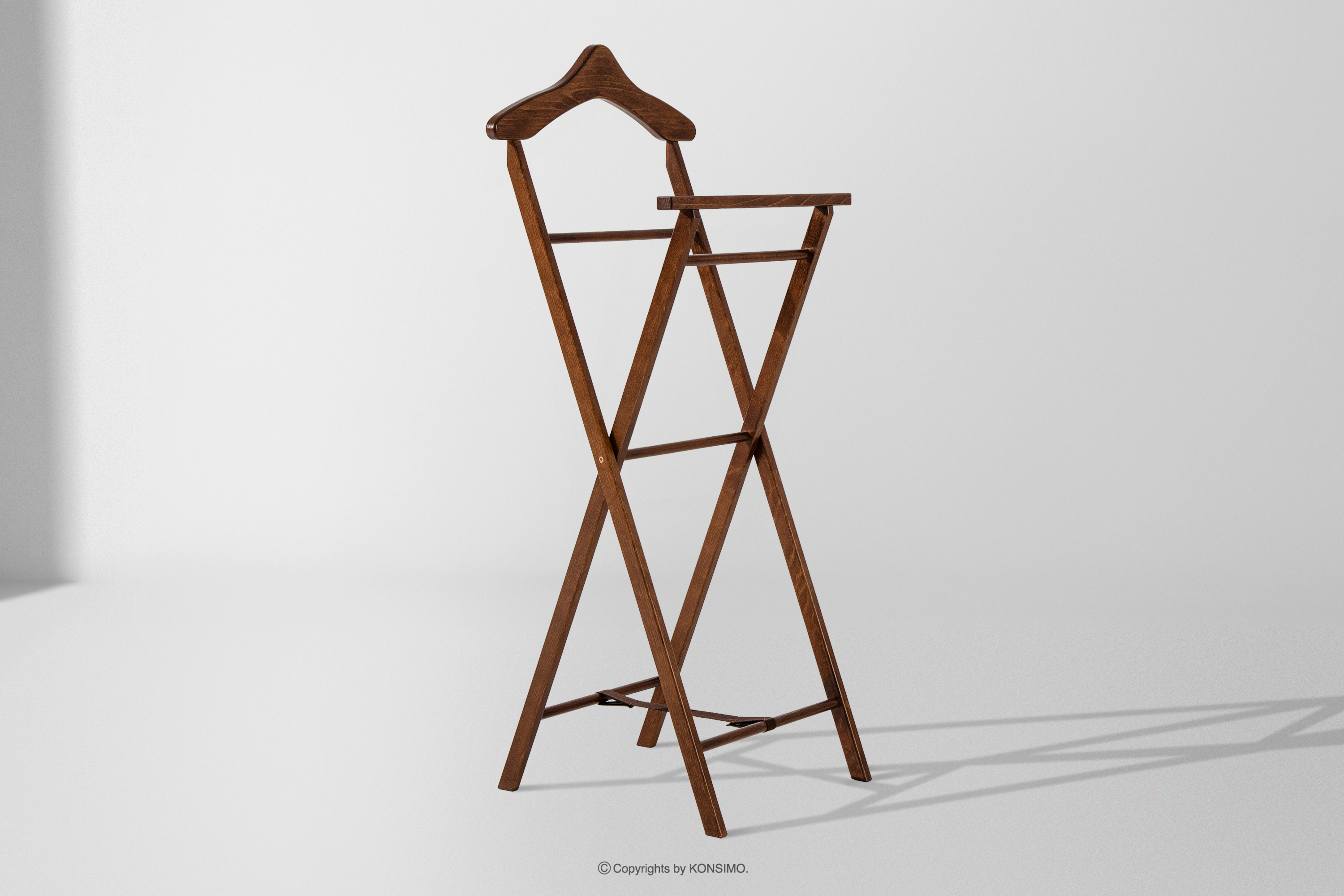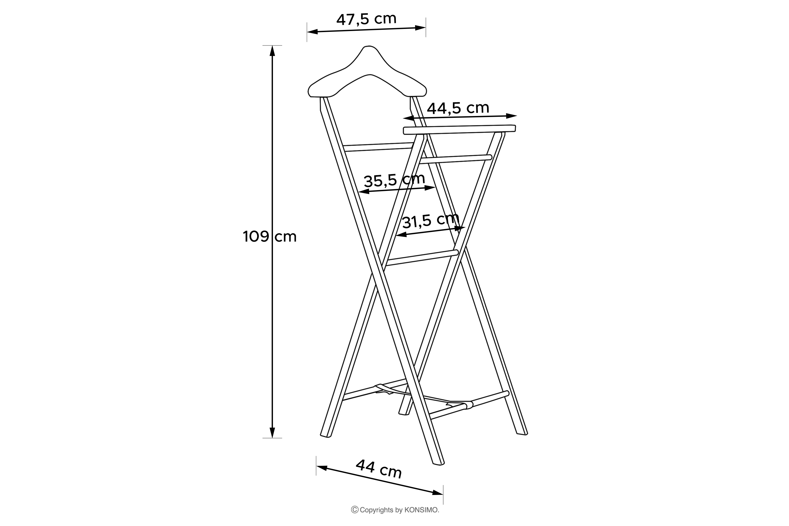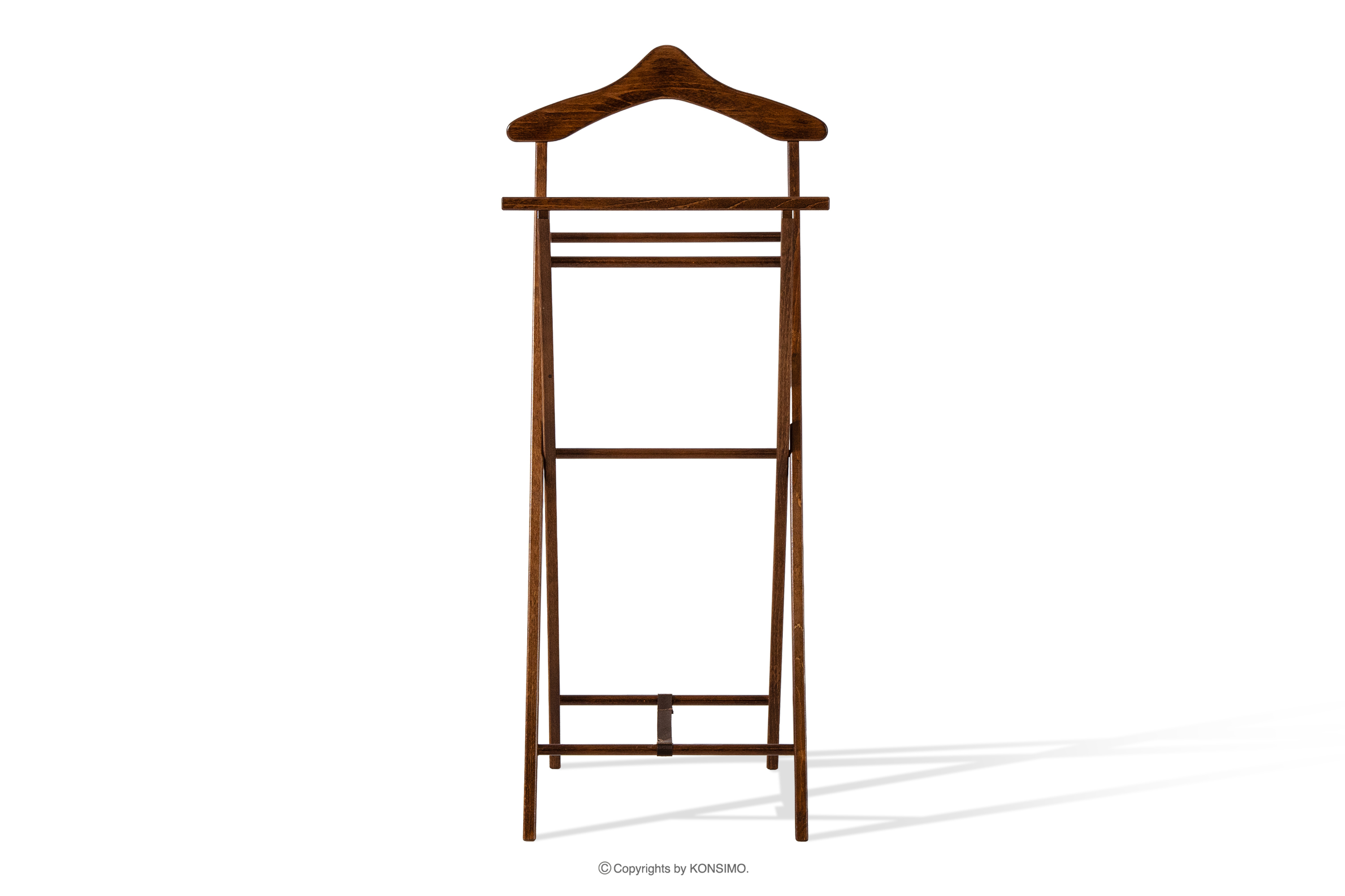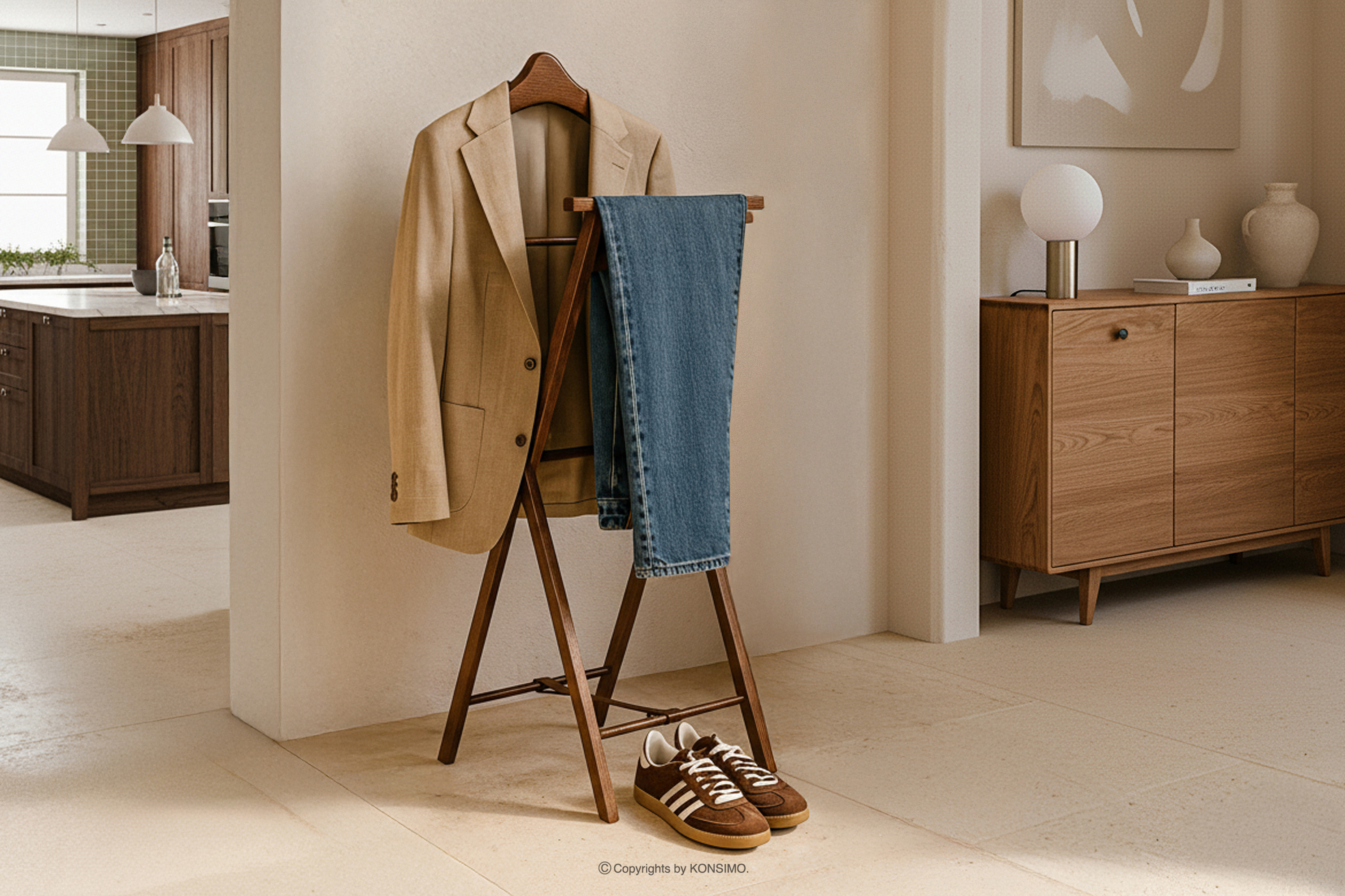 Anzugbügel aus braunem Buchenholz ist ein Produkt, das für die anspruchsvollsten Nutzer entwickelt wurde. Es eignet sich ideal für Schlafzimmer, Ankleidezimmer und elegante Flure und erfüllt nicht nur eine praktische, sondern auch eine dekorative Funktion. Der Kleiderbutler wurde aus hochwertigem Buchenholz gefertigt, das für seine Langlebigkeit, Widerstandsfähigkeit gegen mechanische Beschädigungen und sein dezentes, natürliches Aussehen geschätzt wird.