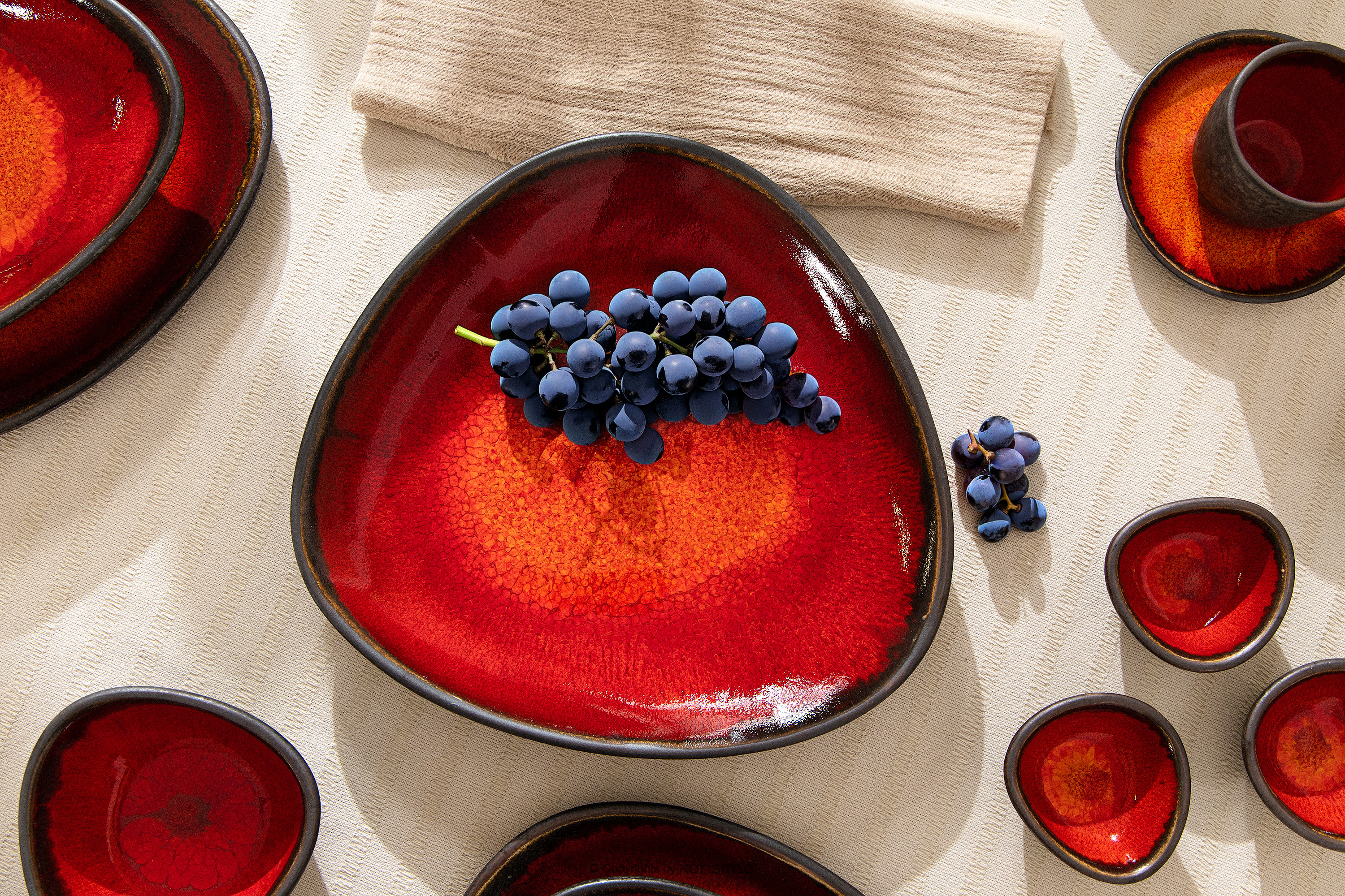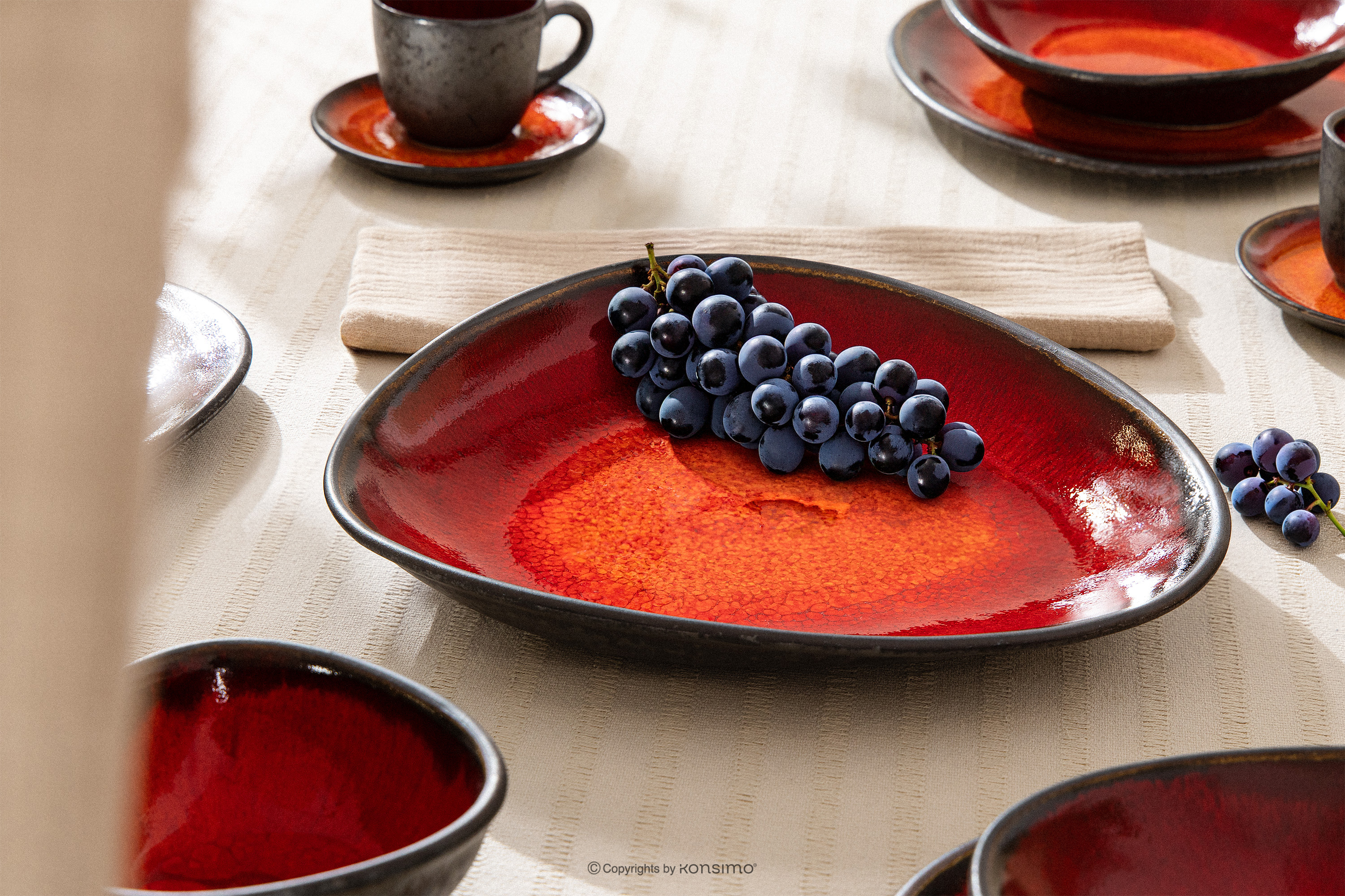 Handglasierte tiefe Servierplatte rot – die Essenz roher Schönheit und moderner Eleganz, eingefangen in der Form von Gebrauchskeramik. PRIMA wurde für diejenigen geschaffen, die Authentizität und außergewöhnliches Design schätzen, und ist eine Hommage an den Loft-Stil, bei dem Raum, Licht und natürliche Materialien im Vordergrund stehen. Das dominierende helle, gebrochene Beige ist die Farbe der Erde, des Sandes und des Natursteins.