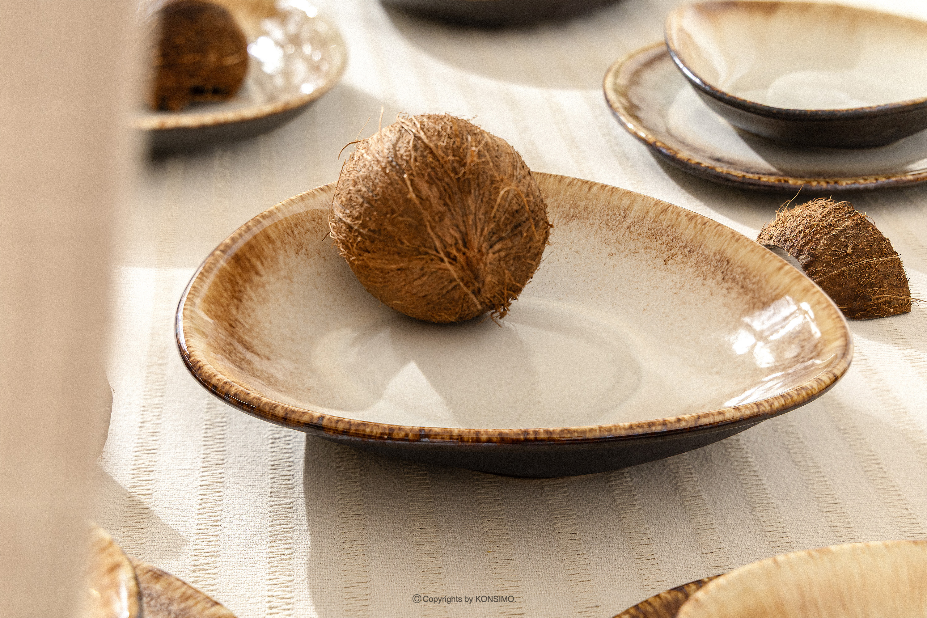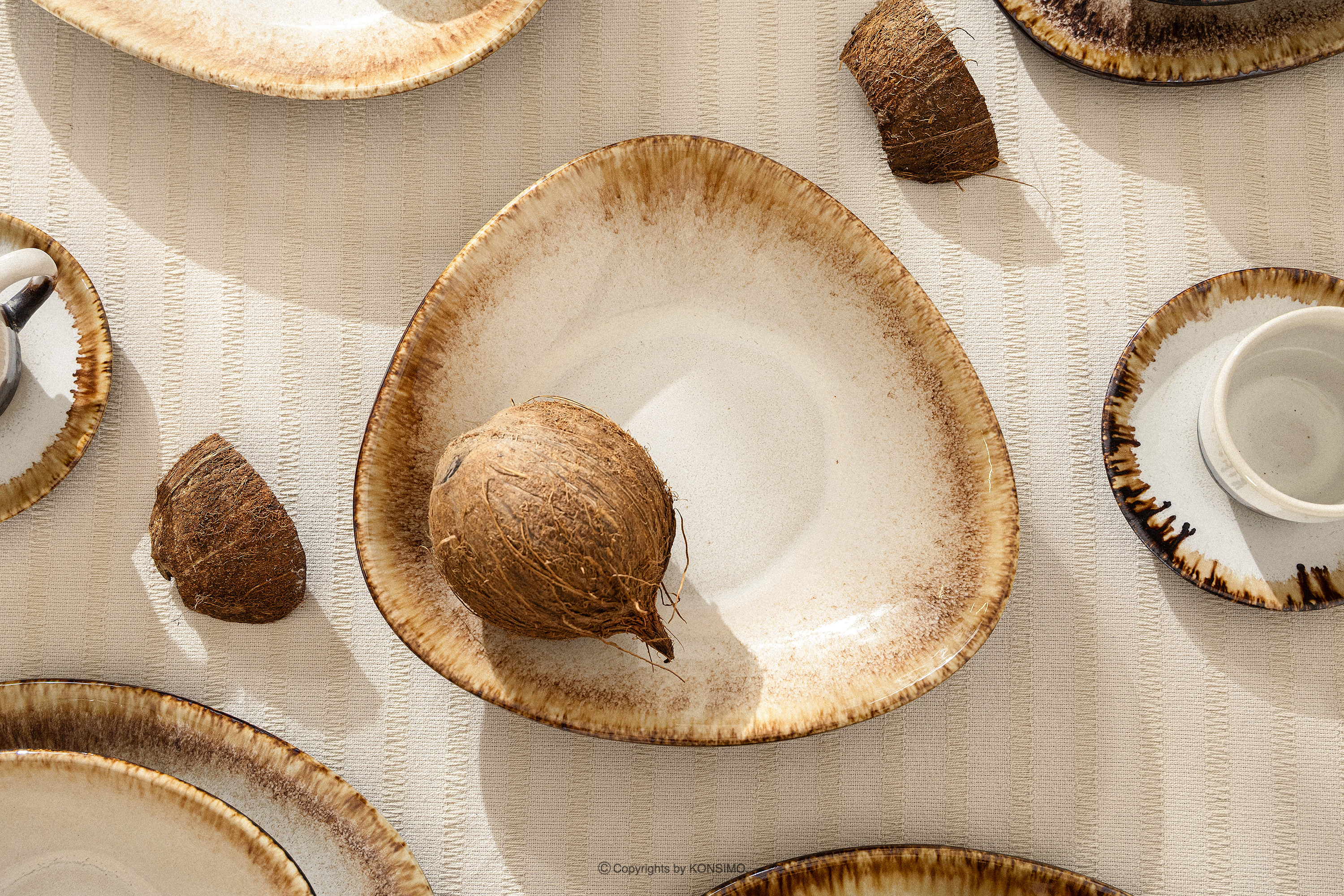 Handglasierte tiefe Servierplatte hellbeige – die Essenz roher Schönheit und moderner Eleganz, eingefangen in der Form von Gebrauchskeramik. PRIMA wurde für diejenigen geschaffen, die Authentizität und außergewöhnliches Design schätzen, und ist eine Hommage an den Loft-Stil, bei dem Raum, Licht und natürliche Materialien im Vordergrund stehen. Das dominierende helle, gebrochene Beige ist die Farbe der Erde, des Sandes und des Natursteins.