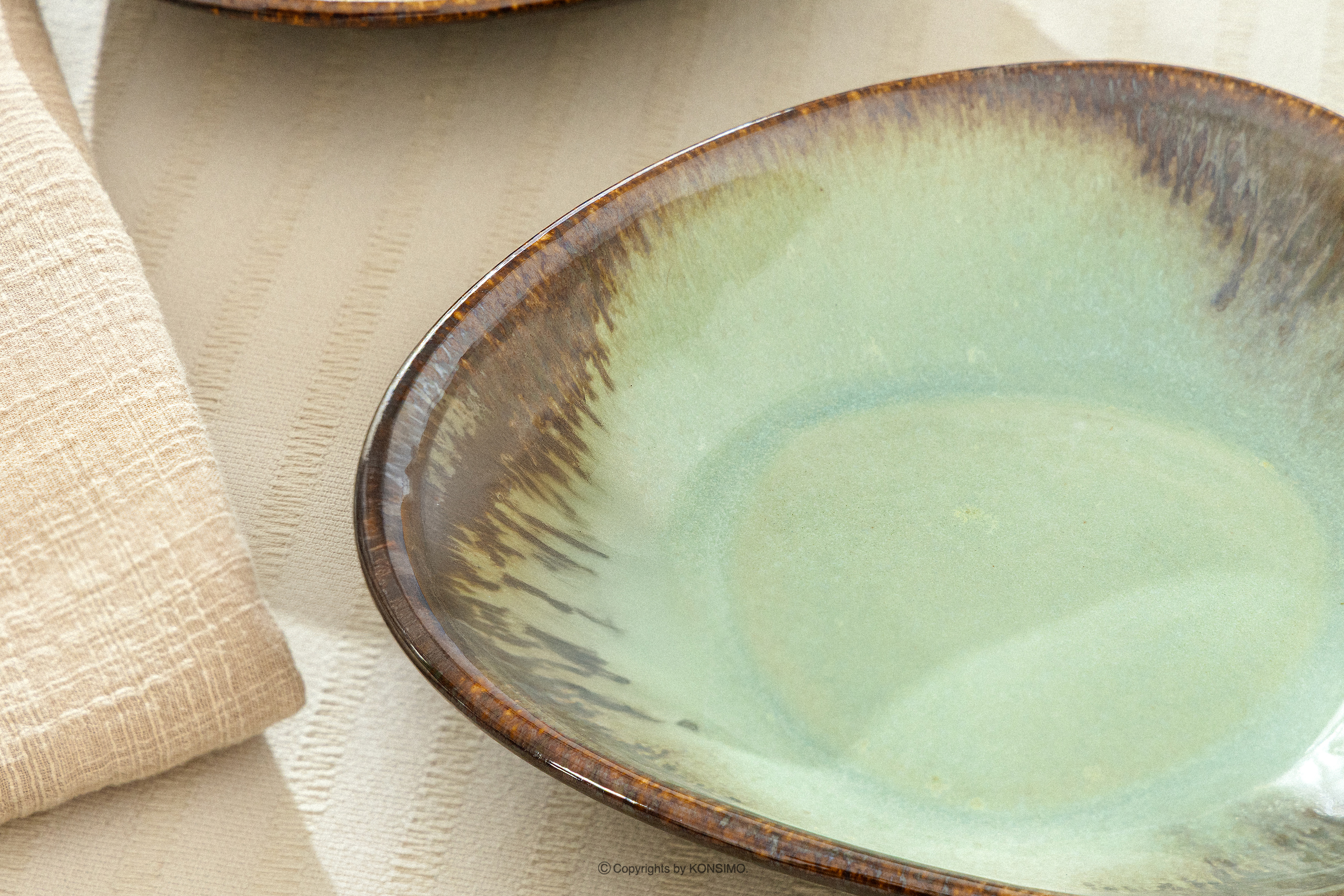 Handglasierte tiefe Servierplatte salbeifarben – die Essenz roher Schönheit und moderner Eleganz, eingefangen in der Form von Gebrauchskeramik. PRIMA wurde für diejenigen geschaffen, die Authentizität und außergewöhnliches Design schätzen, und ist eine Hommage an den Loft-Stil, bei dem Raum, Licht und natürliche Materialien im Vordergrund stehen. Das dominierende helle, gebrochene Beige ist die Farbe der Erde, des Sandes und des Natursteins.