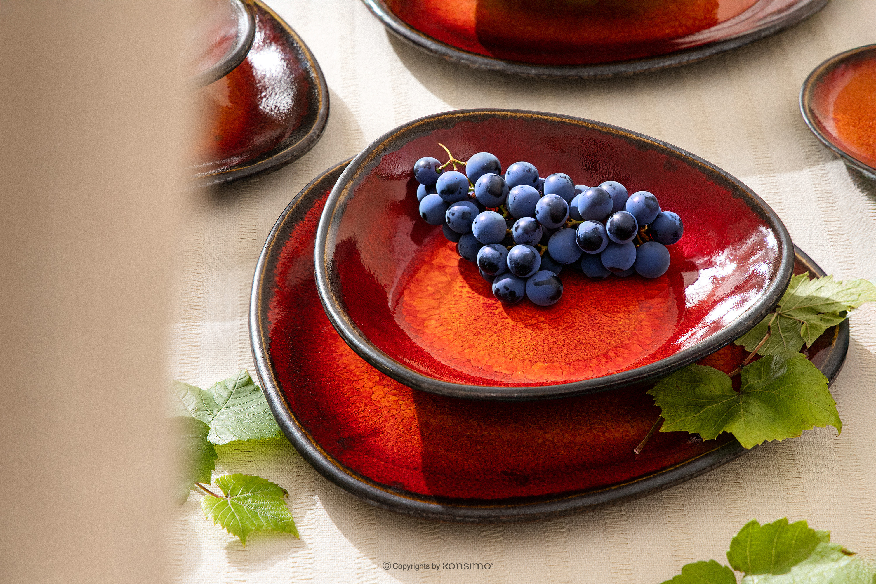 Handglasiertes Geschirrset für 2 Personen (6 tlg.) rot – die Essenz roher Schönheit und moderner Eleganz, eingefangen in der Form von Gebrauchskeramik. PRIMA wurde für diejenigen geschaffen, die Authentizität und außergewöhnliches Design schätzen, und ist eine Hommage an den Loft-Stil, bei dem Raum, Licht und natürliche Materialien im Vordergrund stehen. Das dominierende helle, gebrochene Beige ist die Farbe der Erde, des Sandes und des Natursteins.