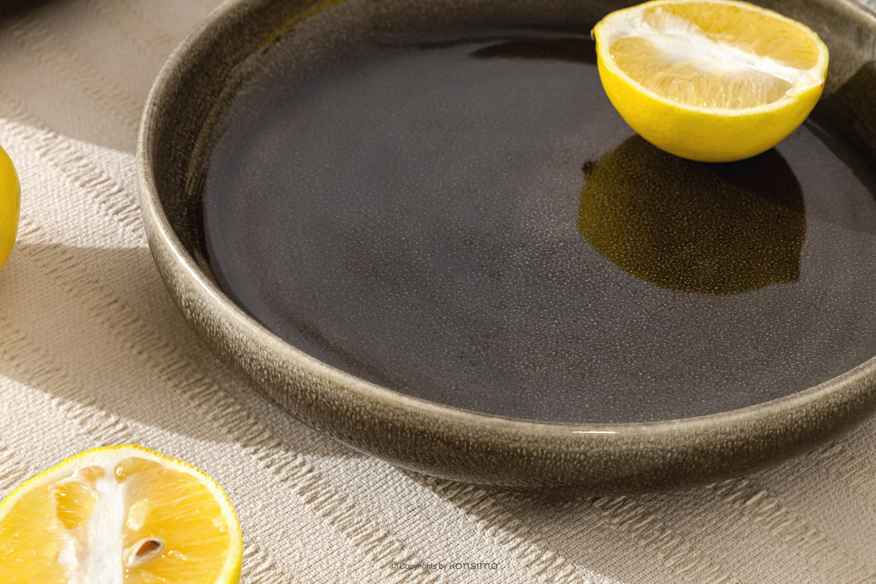 Tiefer Teller aus Keramik im rustikalen Stil, braun/grau/beige wurden mit Blick auf Langlebigkeit, Komfort und dauerhafte Schönheit entworfen. Jedes Element entsteht in einem Prozess, der traditionelles Handwerk mit modernen Verarbeitungstechniken verbindet, wodurch das Geschirr eine hohe Widerstandsfähigkeit im täglichen Gebrauch aufweist. Die Keramik ist robust und eignet sich daher sowohl für den eleganten Tisch als auch für die täglichen Familienmahlzeiten.