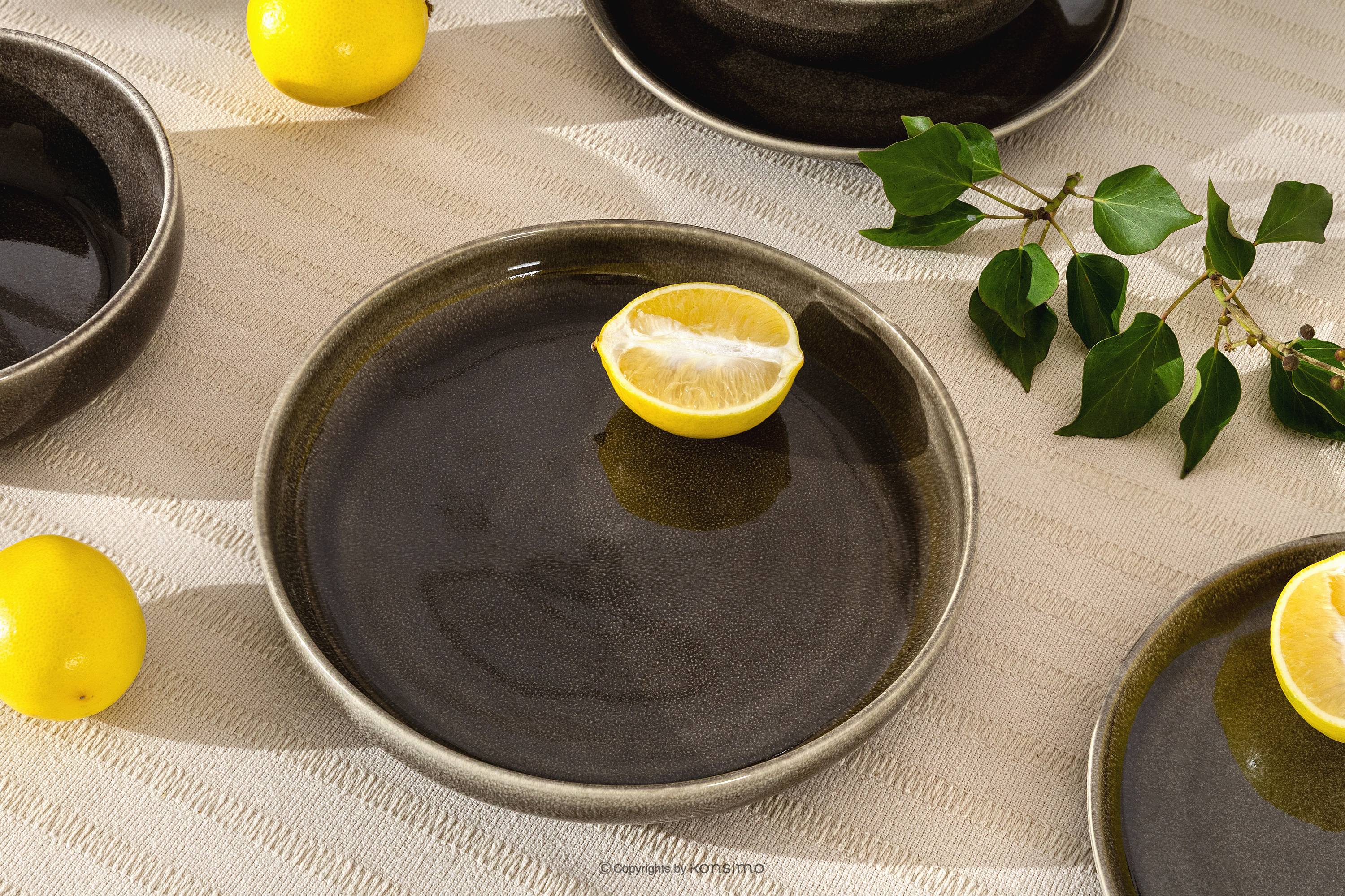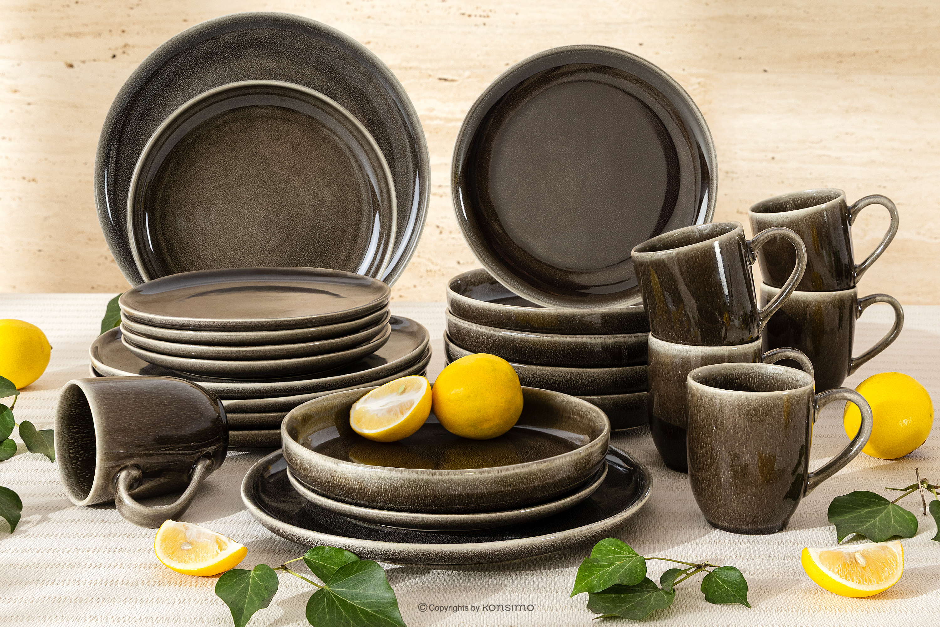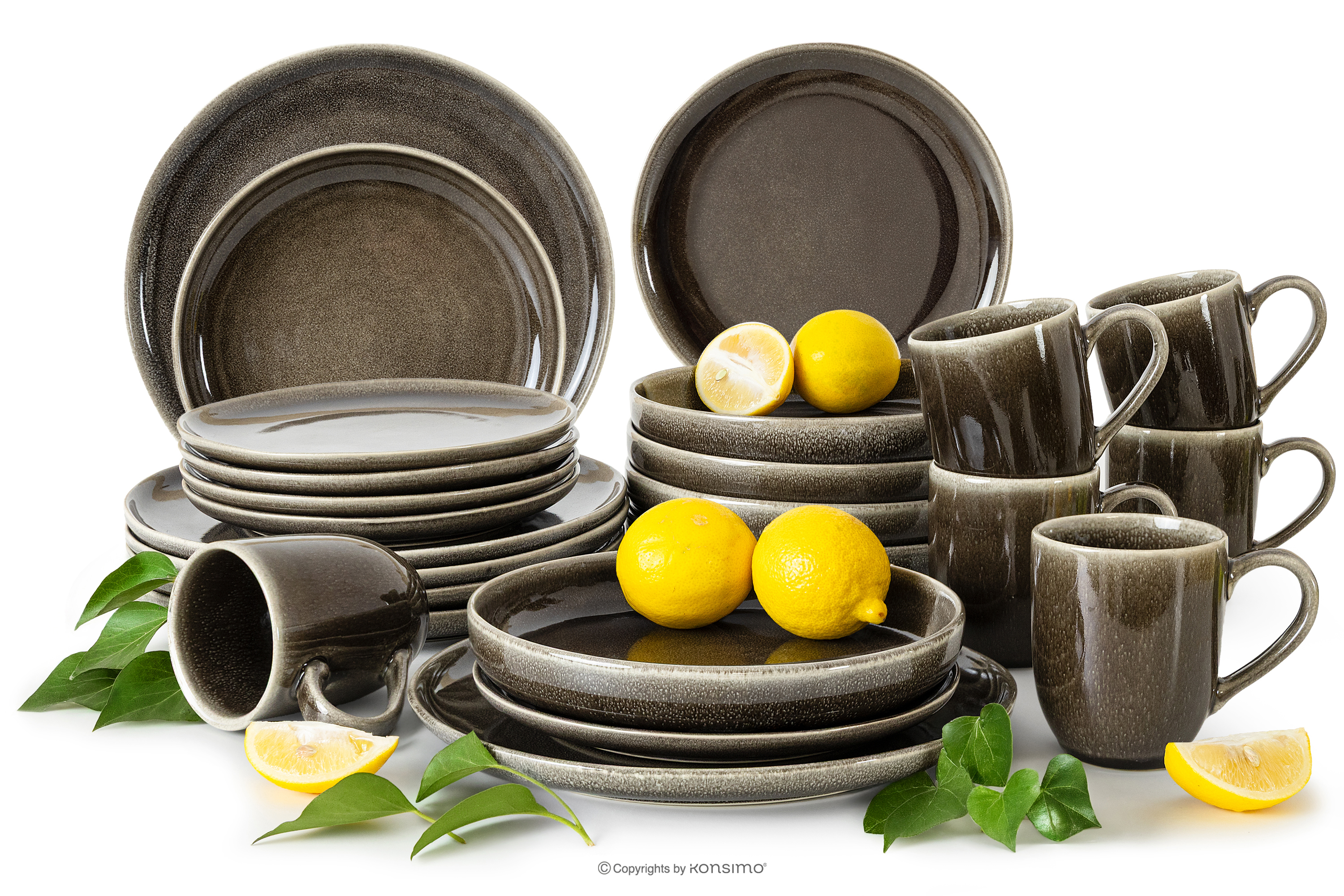 Geschirrset für 6 Personen (24 tlg) aus Keramik im rustikalen Stil, braun/grau/beige wurden mit Blick auf Langlebigkeit, Komfort und dauerhafte Schönheit entworfen. Jedes Element entsteht in einem Prozess, der traditionelles Handwerk mit modernen Verarbeitungstechniken verbindet, wodurch das Geschirr eine hohe Widerstandsfähigkeit im täglichen Gebrauch aufweist. Die Keramik ist robust und eignet sich daher sowohl für den eleganten Tisch als auch für die täglichen Familienmahlzeiten.