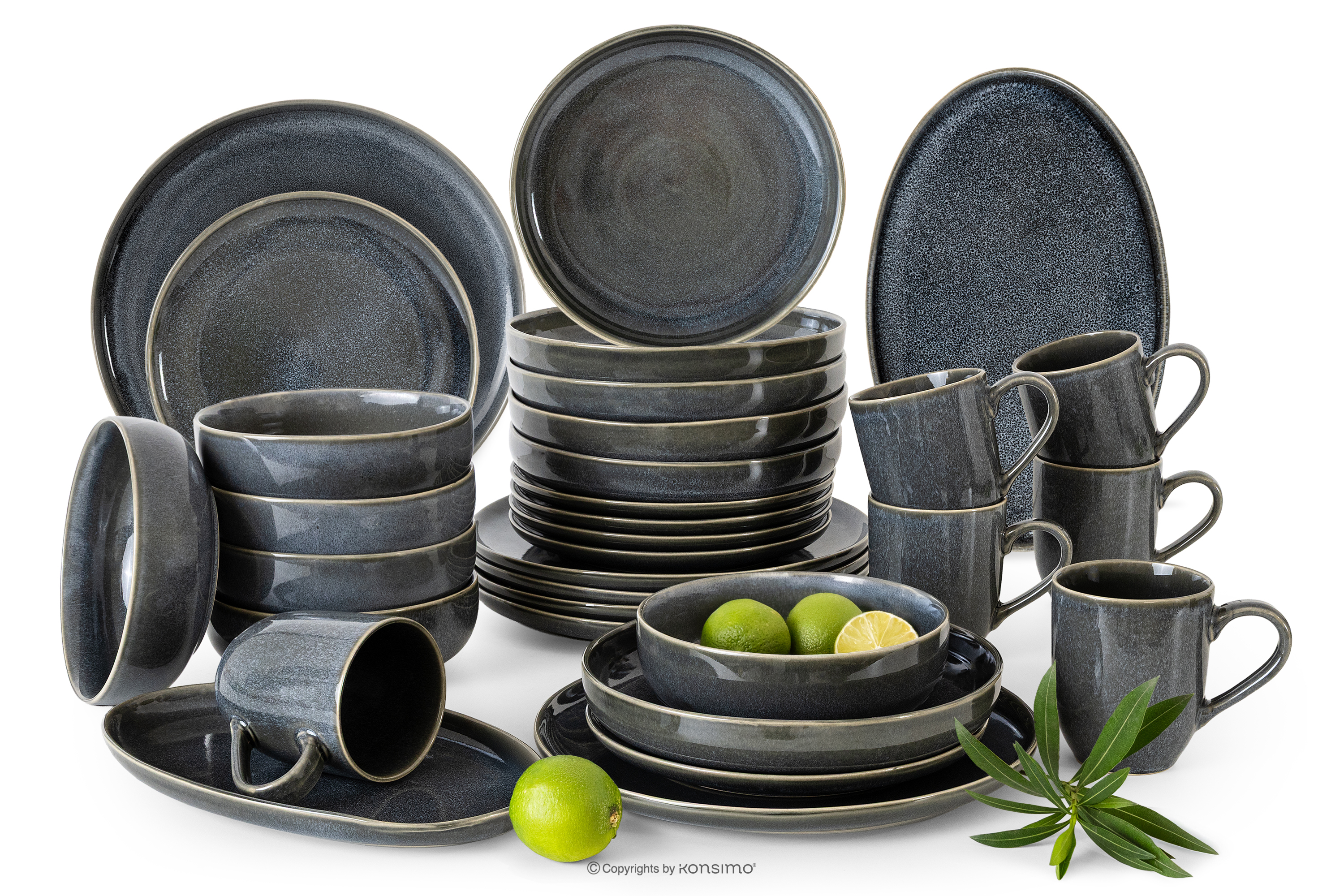 Geschirrset für 6 Personen (32 tlg) aus Keramik im rustikalen Stil, blau/grau/beige wurden mit Blick auf Langlebigkeit, Komfort und dauerhafte Schönheit entworfen. Jedes Element entsteht in einem Prozess, der traditionelles Handwerk mit modernen Verarbeitungstechniken verbindet, wodurch das Geschirr eine hohe Widerstandsfähigkeit im täglichen Gebrauch aufweist. Die Keramik ist robust und eignet sich daher sowohl für den eleganten Tisch als auch für die täglichen Familienmahlzeiten.