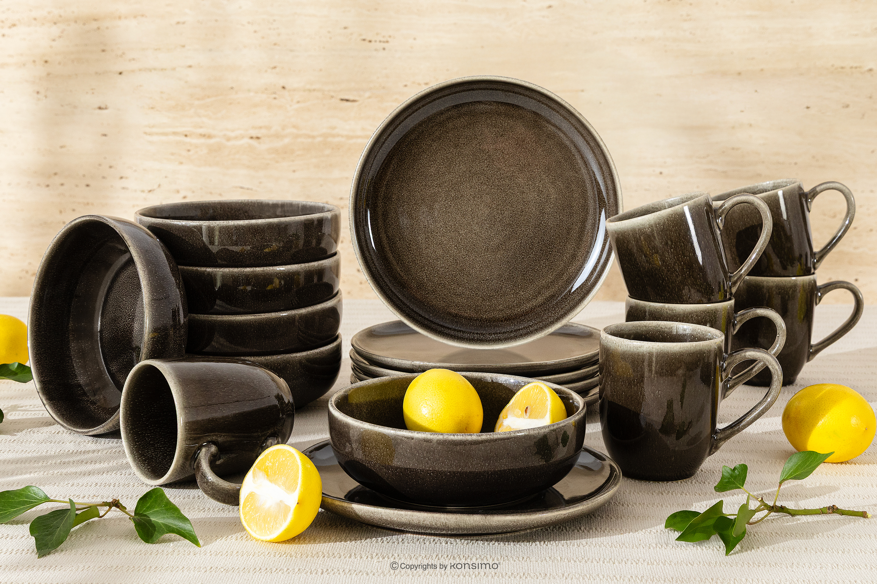 Frühstücksset für 6 Personen (18 tlg) aus Keramik im rustikalen Stil, braun/grau/beige wurden mit Blick auf Langlebigkeit, Komfort und dauerhafte Schönheit entworfen. Jedes Element entsteht in einem Prozess, der traditionelles Handwerk mit modernen Verarbeitungstechniken verbindet, wodurch das Geschirr eine hohe Widerstandsfähigkeit im täglichen Gebrauch aufweist. Die Keramik ist robust und eignet sich daher sowohl für den eleganten Tisch als auch für die täglichen Familienmahlzeiten.