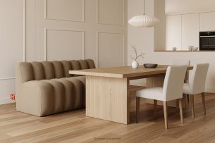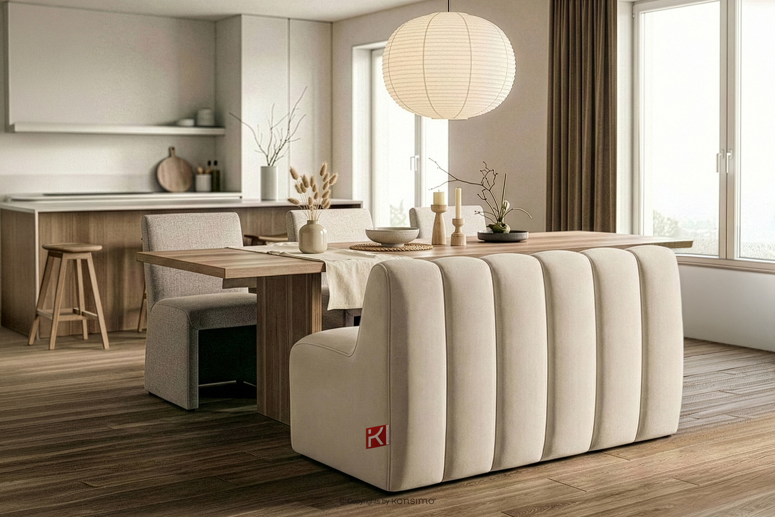 Gepolsterte Esszimmerbank 120 cm cremefarbener Velours ist die Lösung für alle, die einen goldenen Mittelweg zwischen Stil und purer Funktionalität suchen. Anstelle von traditionellen Stühlen, die oft für visuelle Unruhe sorgen, bieten wir eine kompakte, modulare Form mit weichen Kanten. Das Fehlen scharfer Ecken ist nicht nur eine Frage der Ästhetik, sondern vor allem der Sicherheit – insbesondere in engen Durchgängen, Fluren oder Häusern, in denen Kinder spielen.