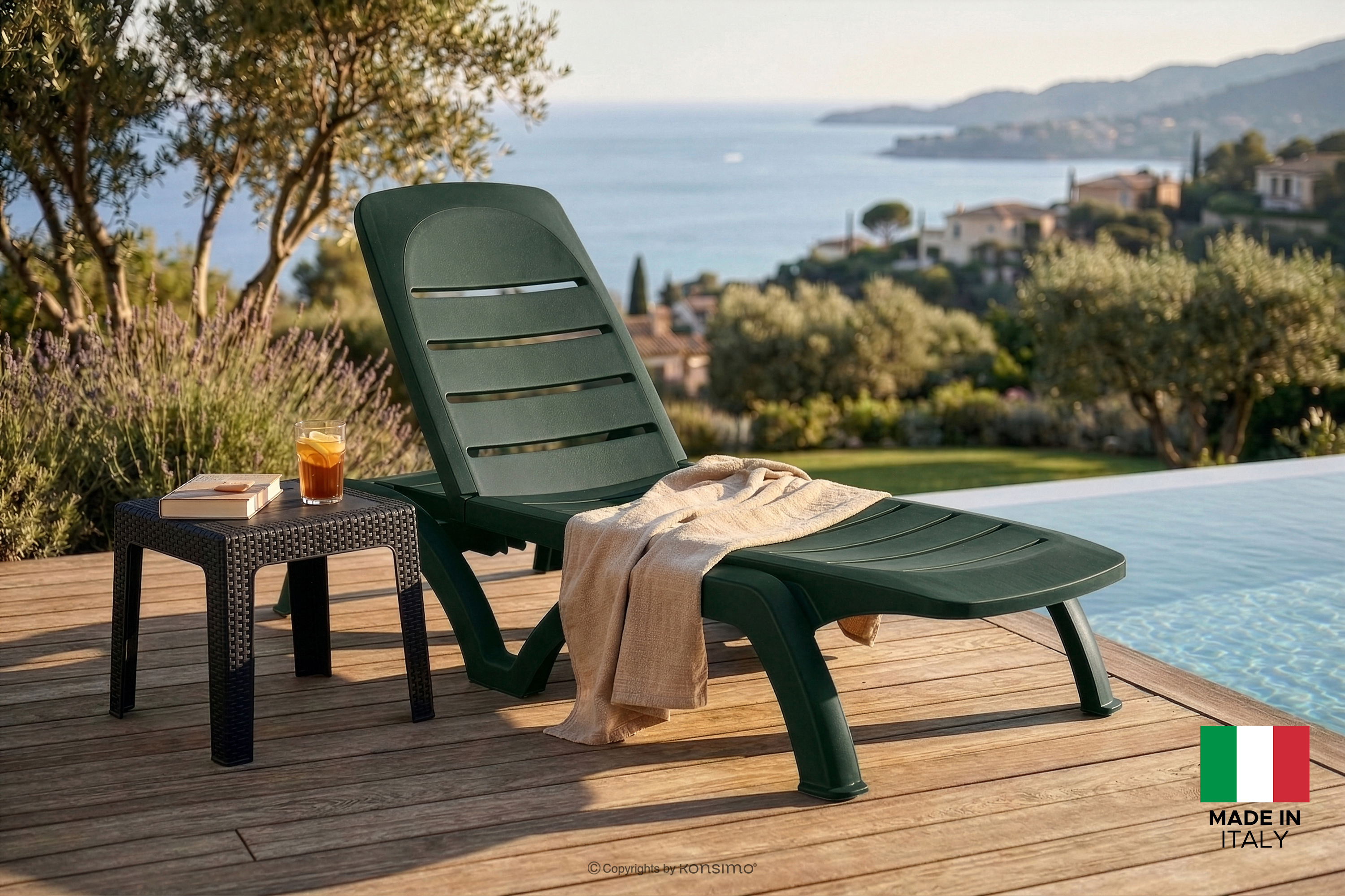 - Zusätzliche Informationen: für den Innen- und Außenbereich, hinter der Rückenlehne des Liegestuhls befindet sich ein integriertes Fach mit den Maßen 32 x 5 x 25 cm