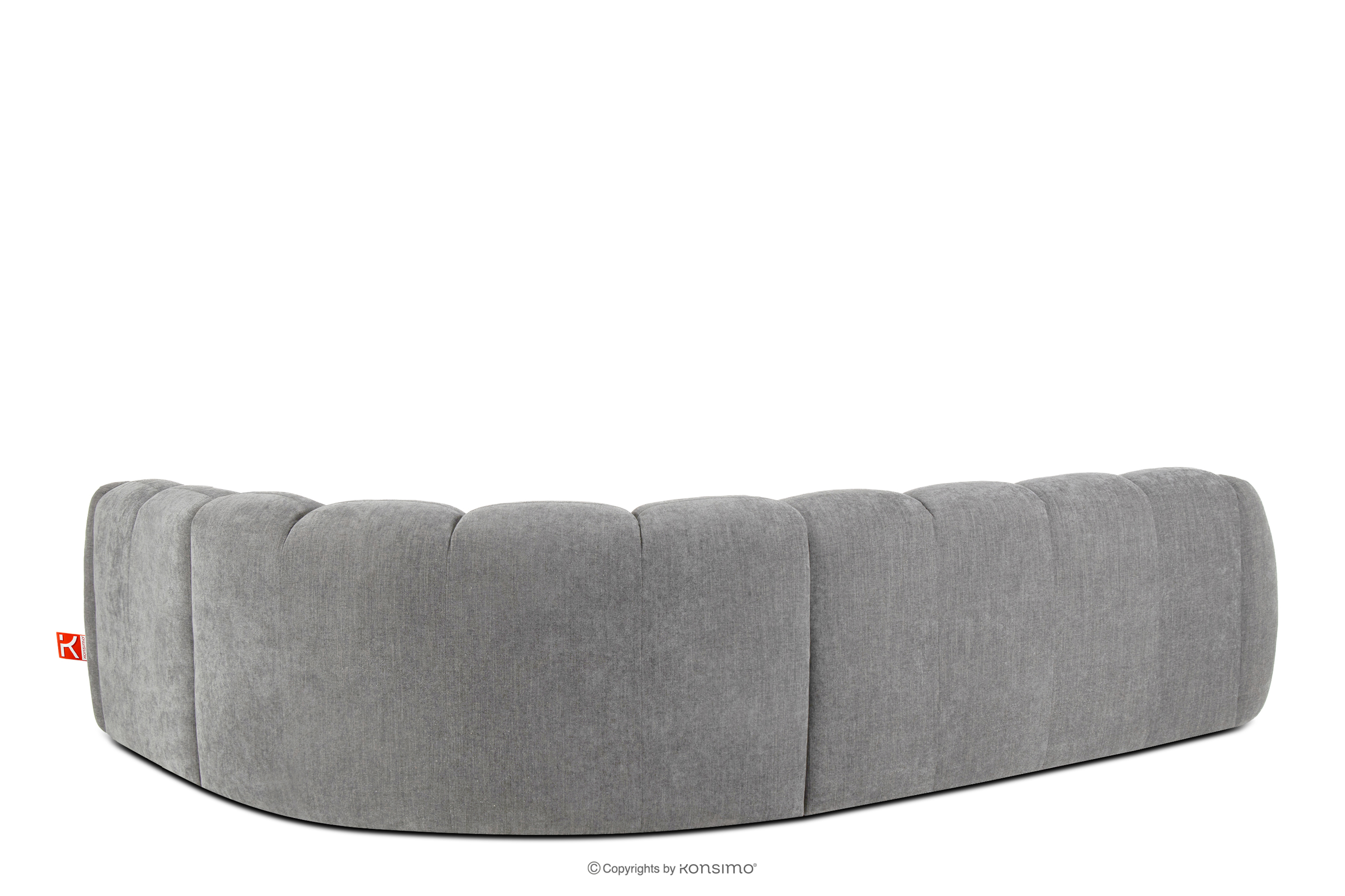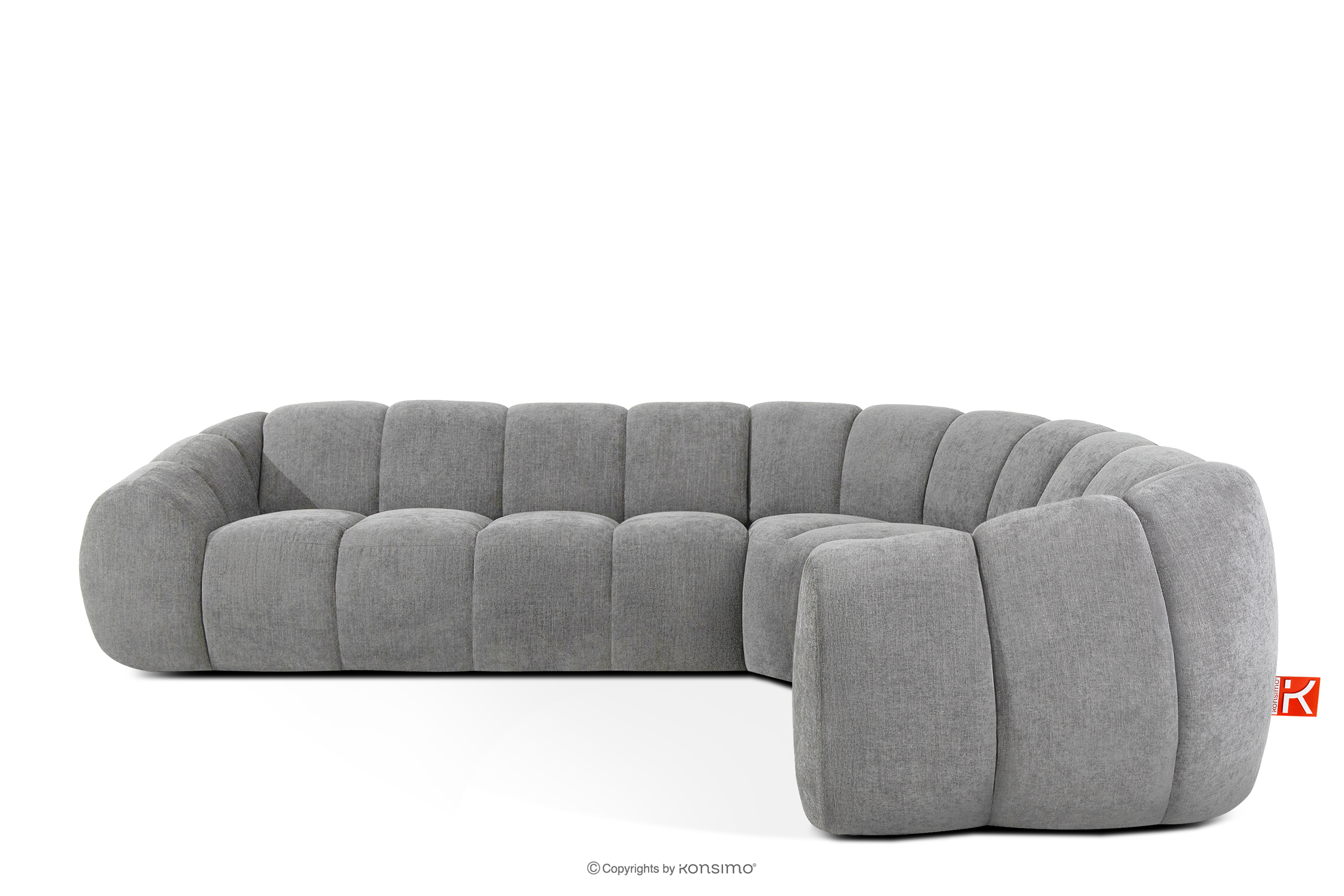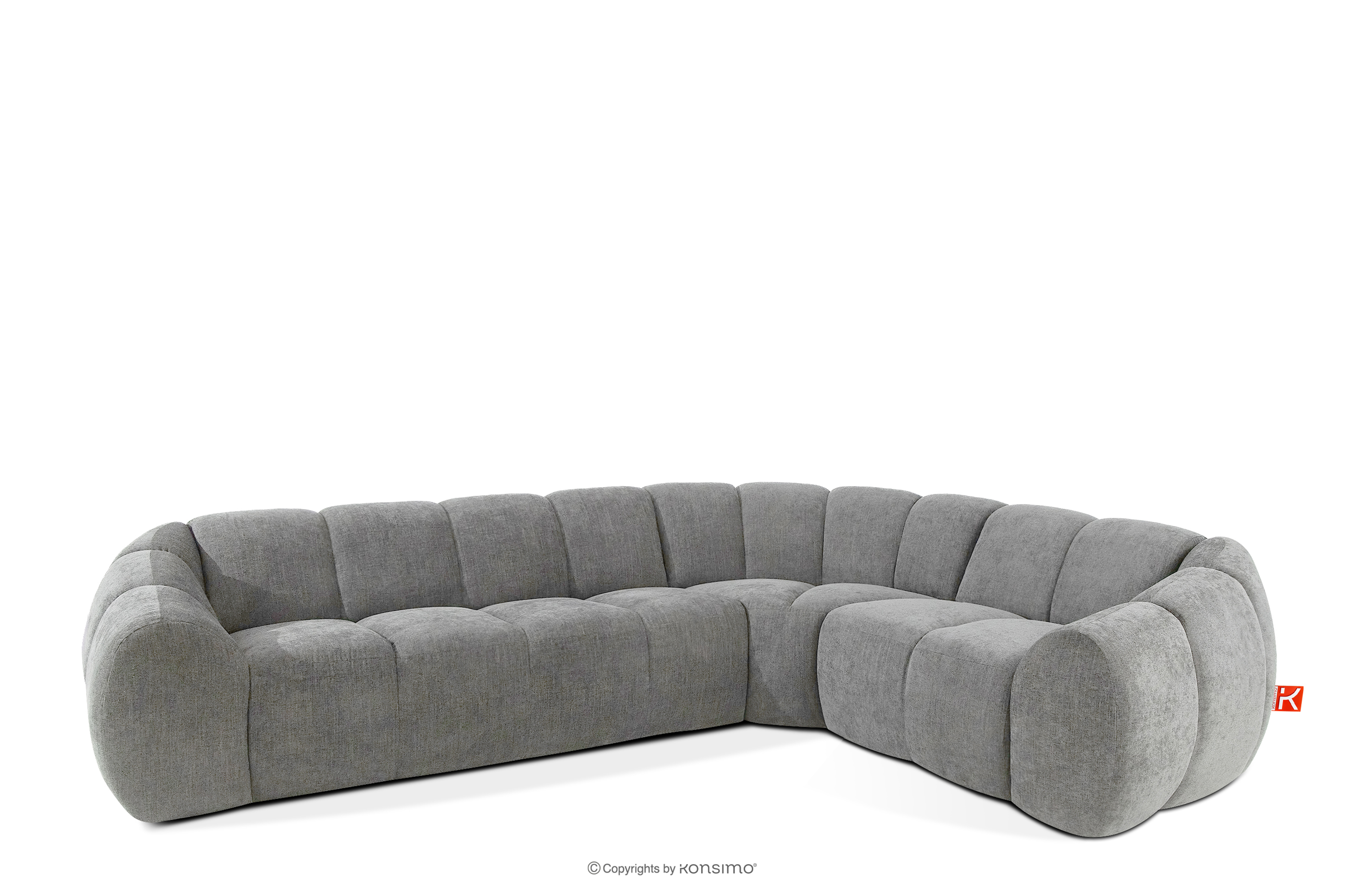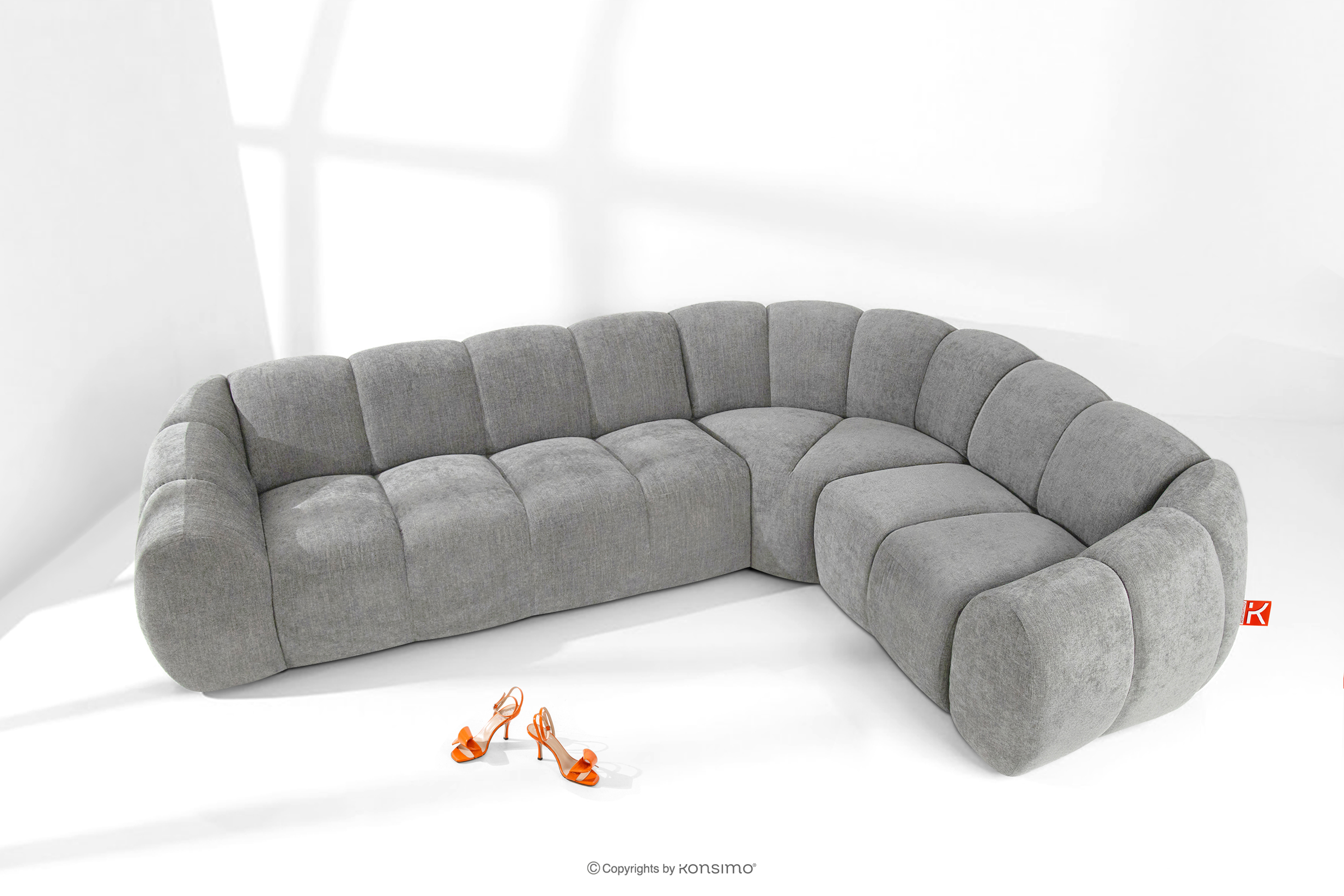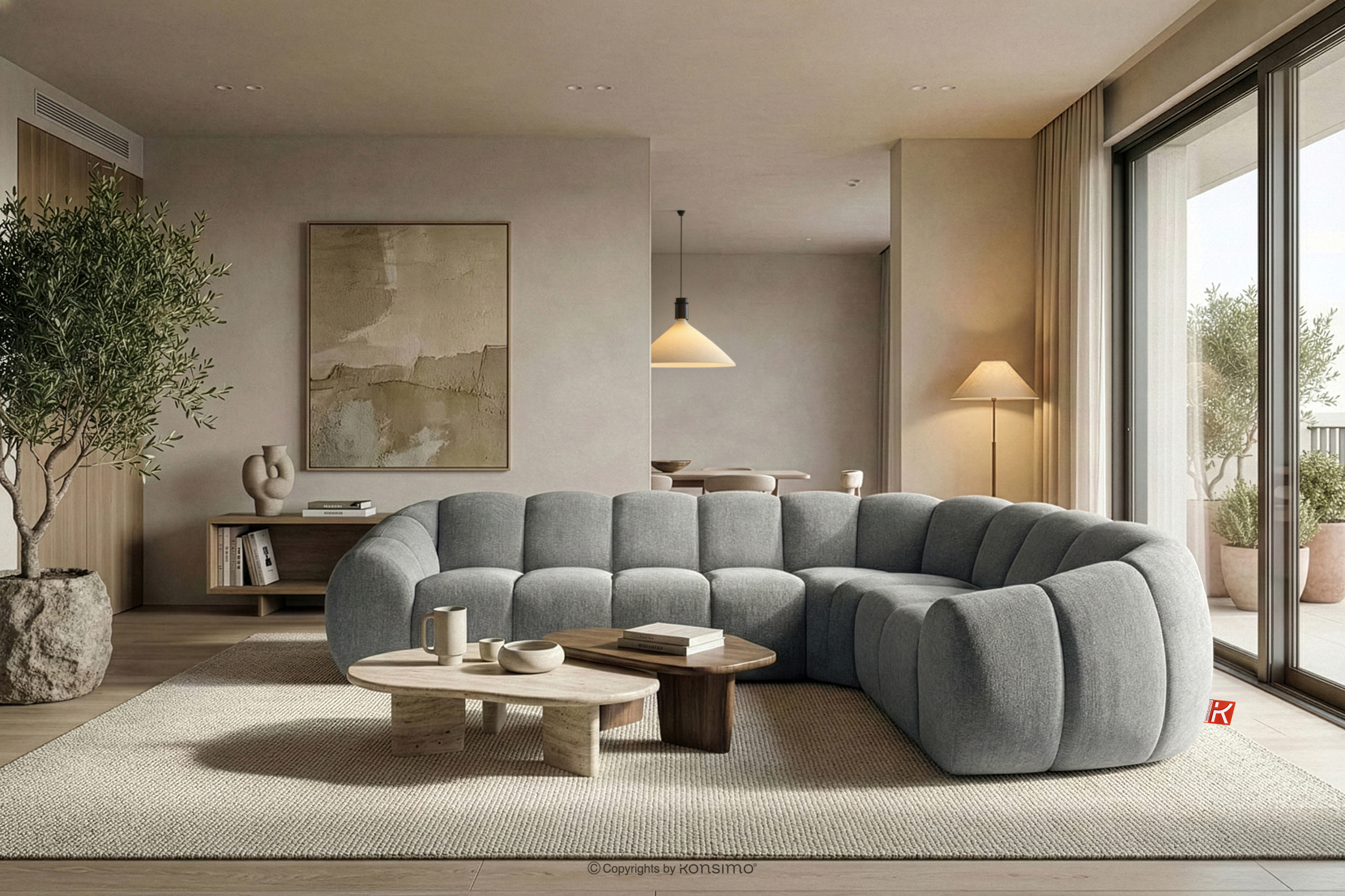 Gesteppte Eckcouch im Retro-Modern-Stil rechts hellgrau verkörpert die Essenz einer modernen Interpretation des Retro-Modern-Stils, in dem weiche, organische Formen auf die kompromisslose Funktionalität zeitgenössischen modularen Designs treffen. Jedes Element dieser Serie wurde mit dem Ziel entworfen, einen harmonischen Raum zu schaffen, der die weichen Linien und den geometrischen Rhythmus zelebriert, die für die Designikonen der 70er Jahre charakteristisch sind, jedoch in einer aufgefrischten, luxuriösen Version.
