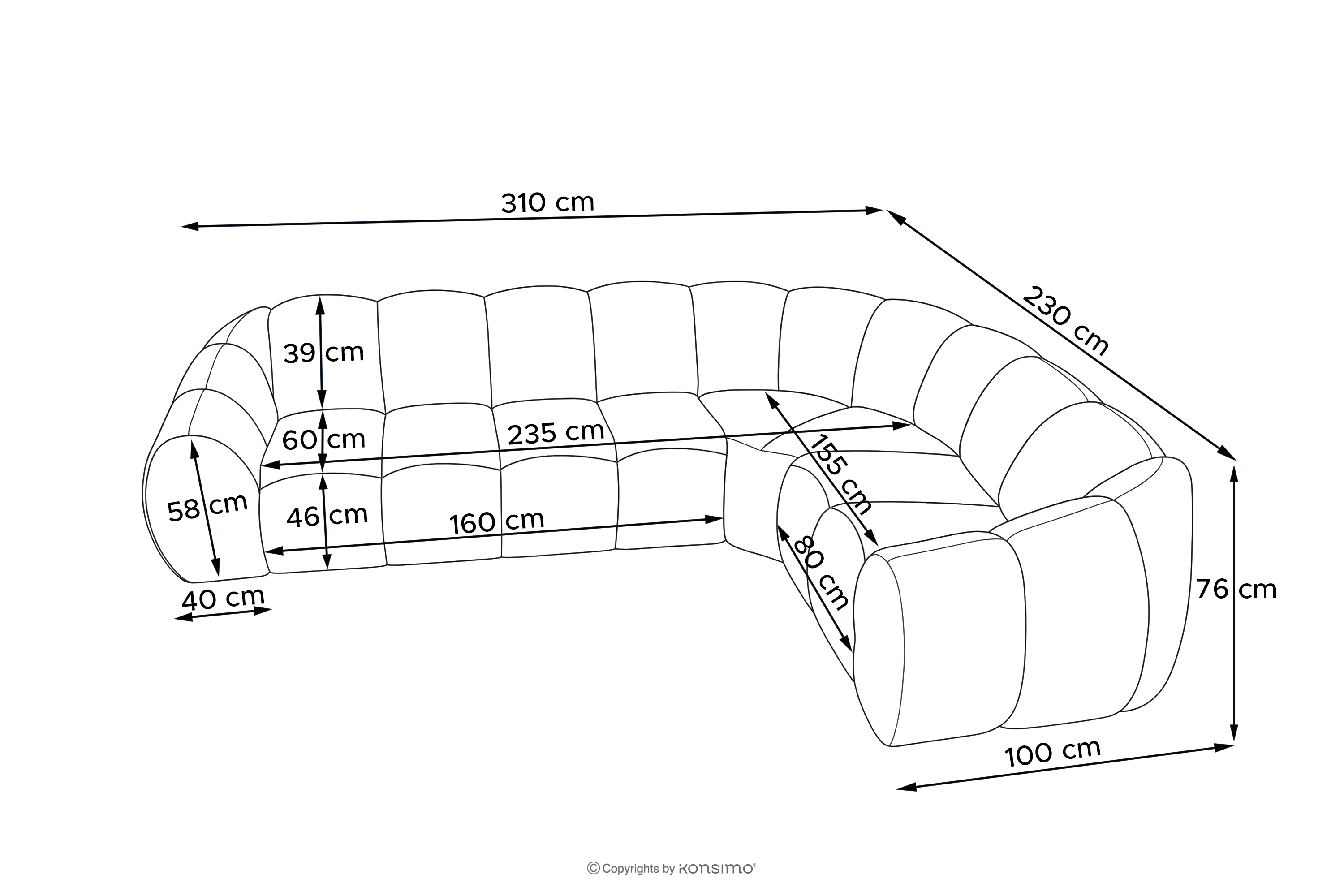 - Abmessungen der Sitzfläche (cm): 235x46x60/155