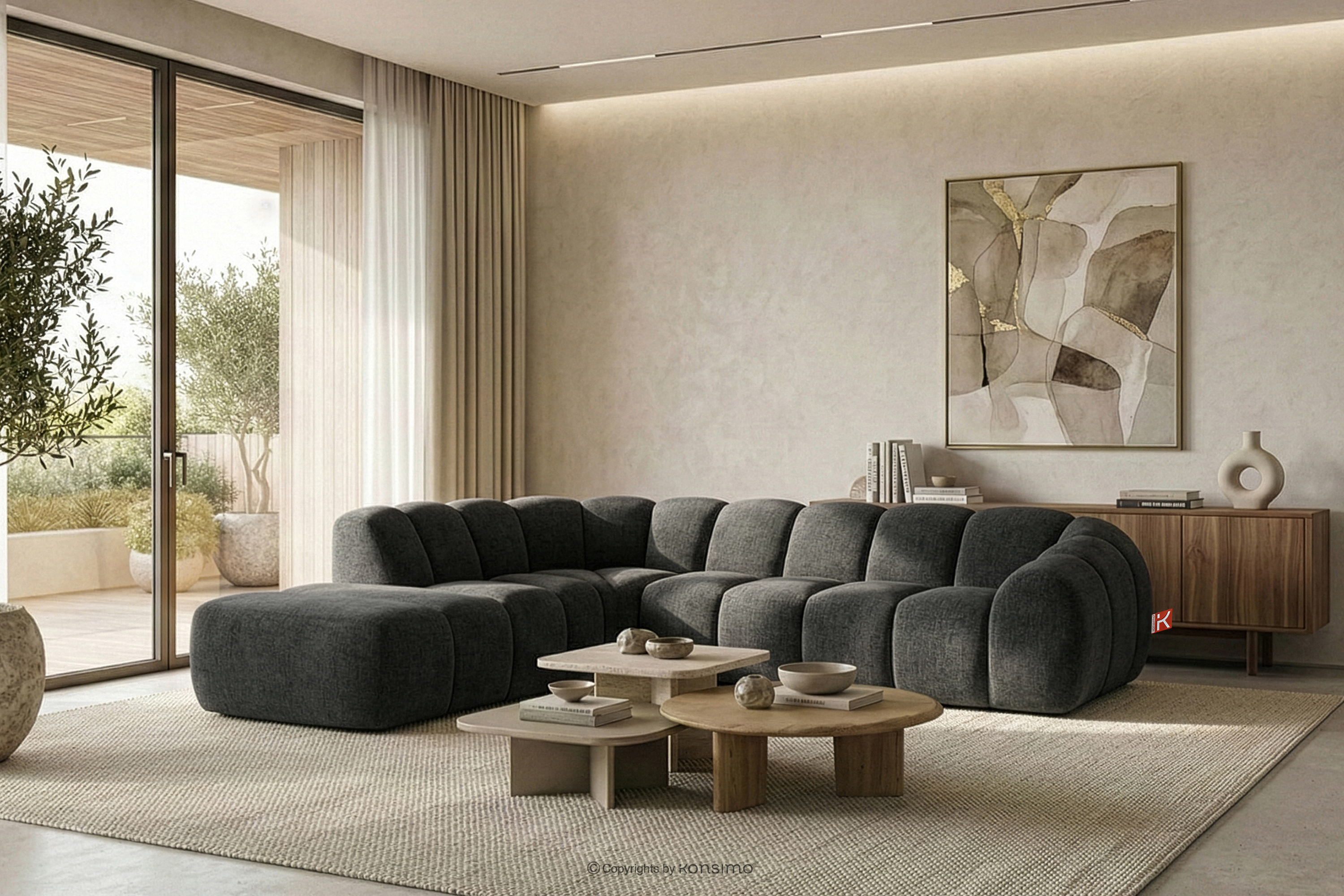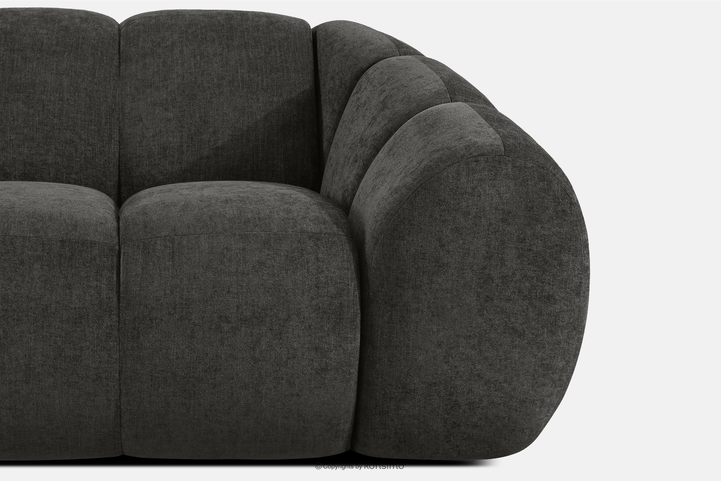 Curve-Ecksofa im Retro-Modern-Stil modular links graphit verkörpert die Essenz einer modernen Interpretation des Retro-Modern-Stils, in dem weiche, organische Formen auf die kompromisslose Funktionalität zeitgenössischen modularen Designs treffen. Jedes Element dieser Serie wurde mit dem Ziel entworfen, einen harmonischen Raum zu schaffen, der die weichen Linien und den geometrischen Rhythmus zelebriert, die für die Designikonen der 70er Jahre charakteristisch sind, jedoch in einer aufgefrischten, luxuriösen Version.