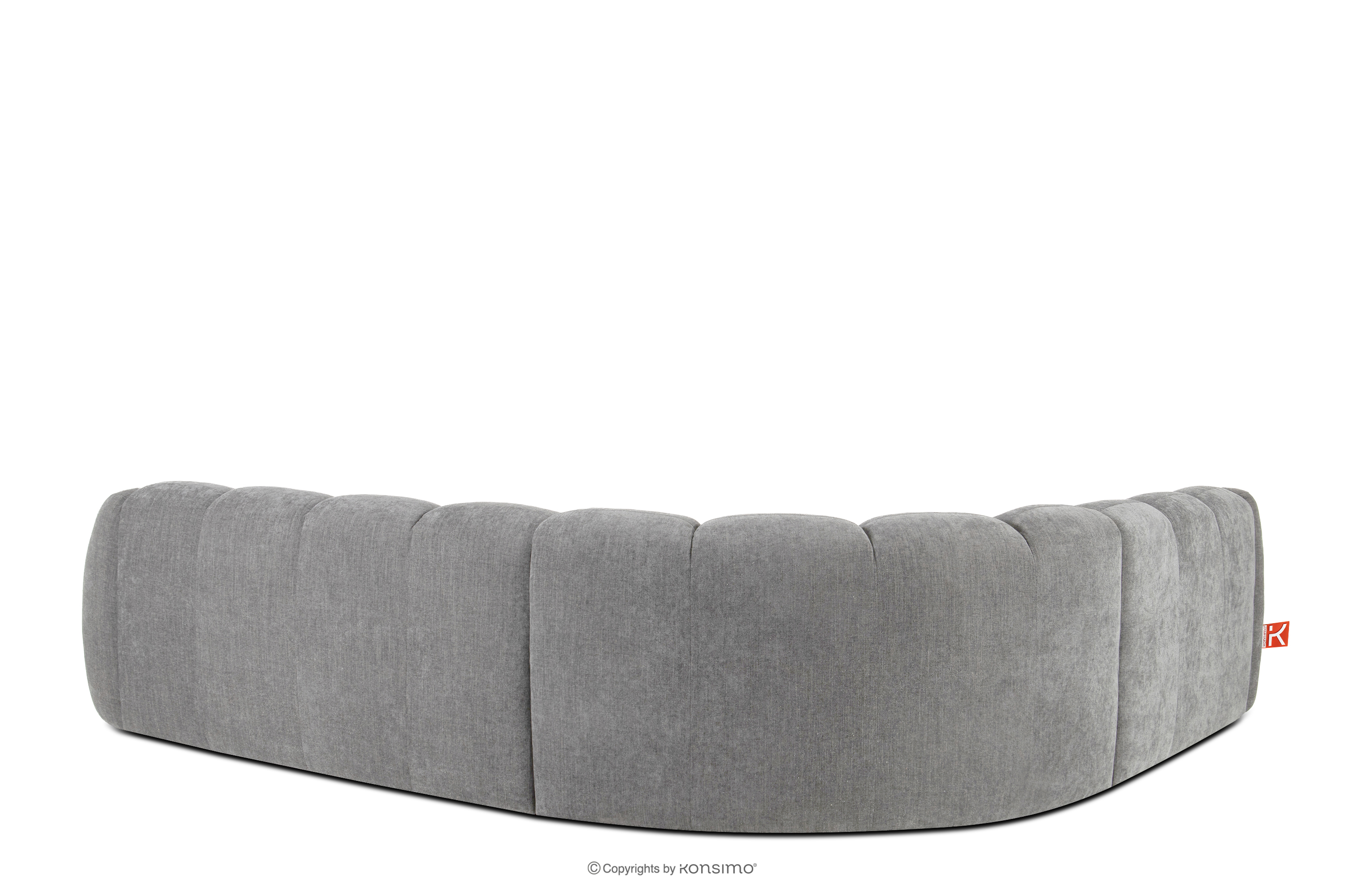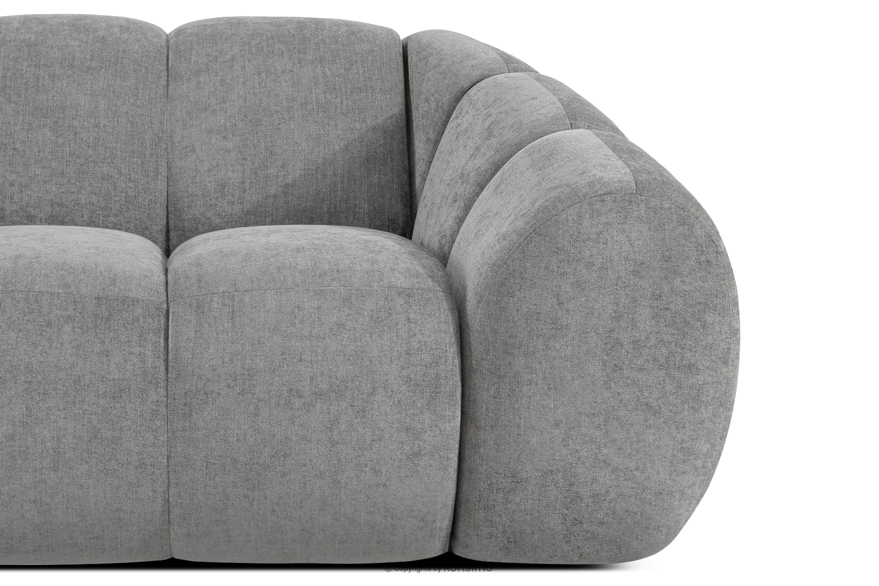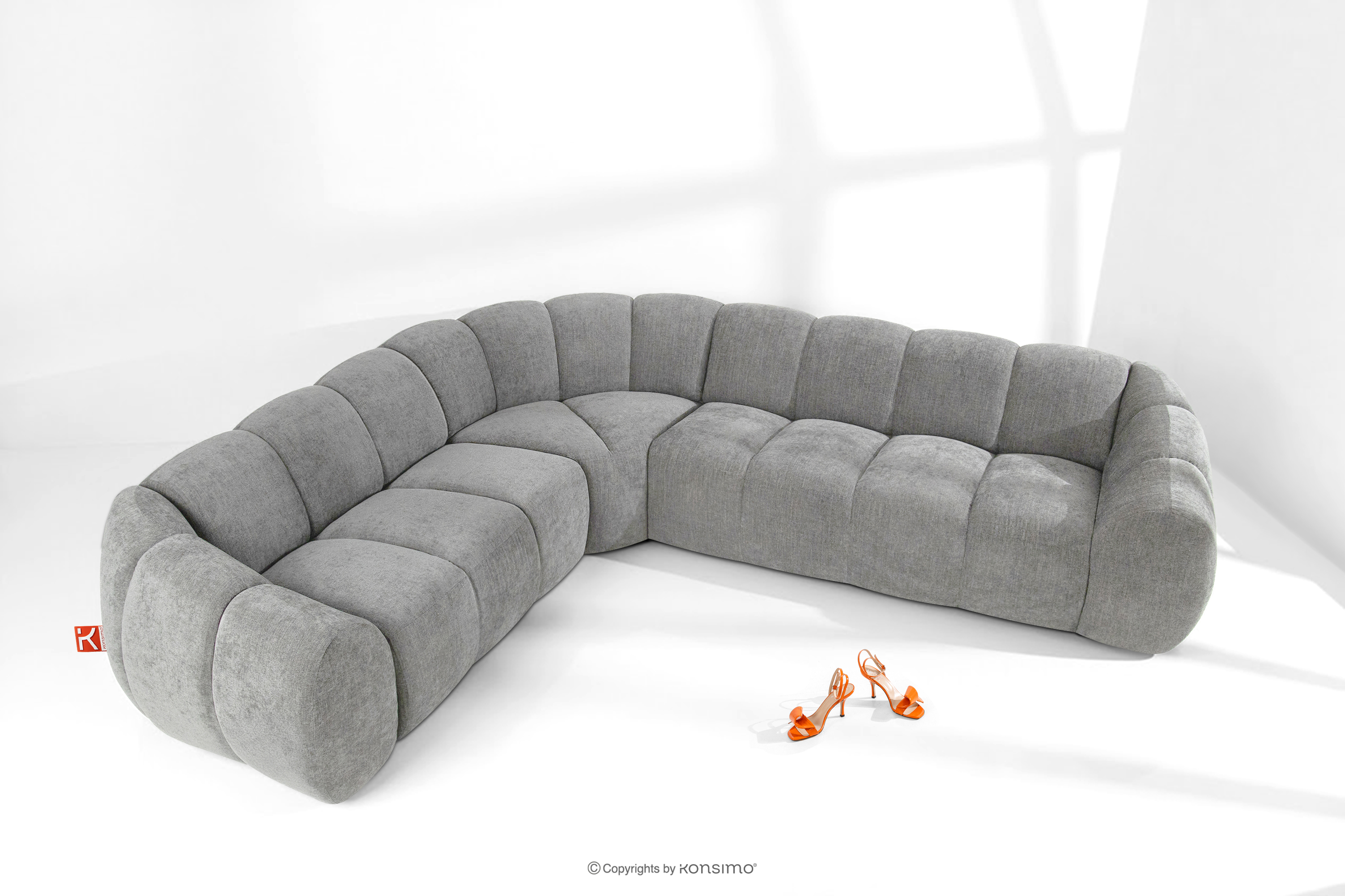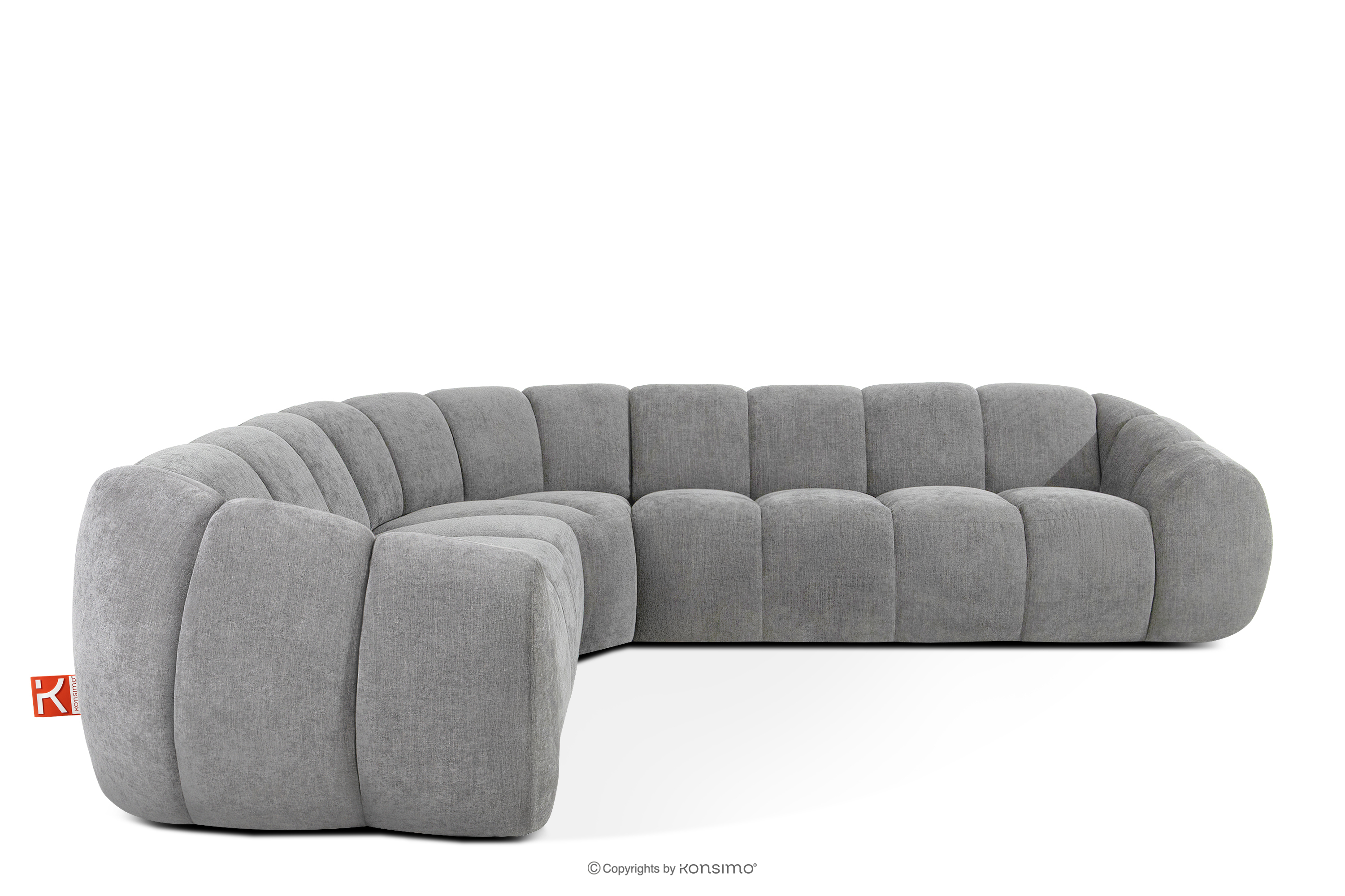 Großes gestepptes Ecksofa im Retro-Modern-Stil links hellgrau verkörpert die Essenz einer modernen Interpretation des Retro-Modern-Stils, in dem weiche, organische Formen auf die kompromisslose Funktionalität zeitgenössischen modularen Designs treffen. Jedes Element dieser Serie wurde mit dem Ziel entworfen, einen harmonischen Raum zu schaffen, der die weichen Linien und den geometrischen Rhythmus zelebriert, die für die Designikonen der 70er Jahre charakteristisch sind, jedoch in einer aufgefrischten, luxuriösen Version.