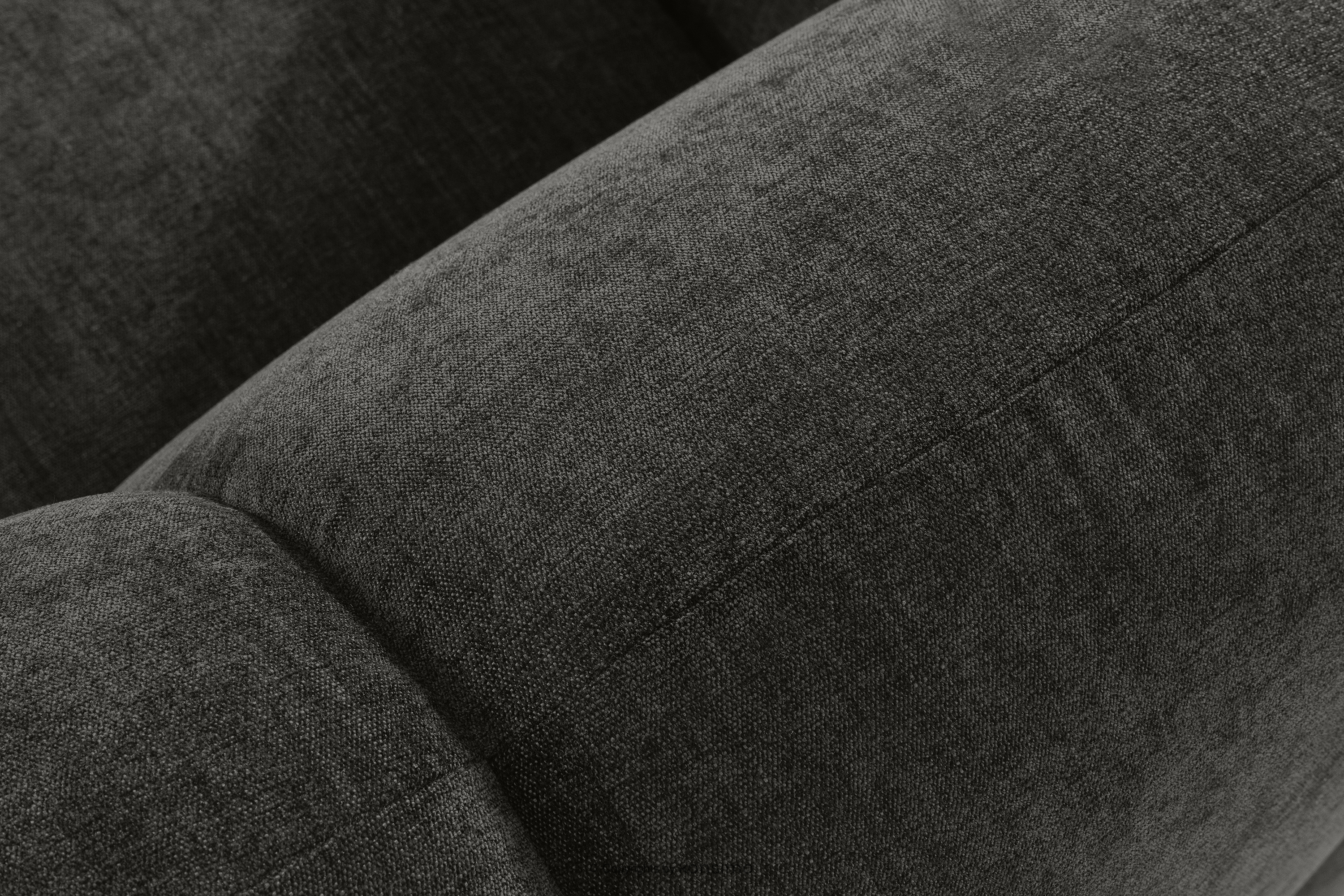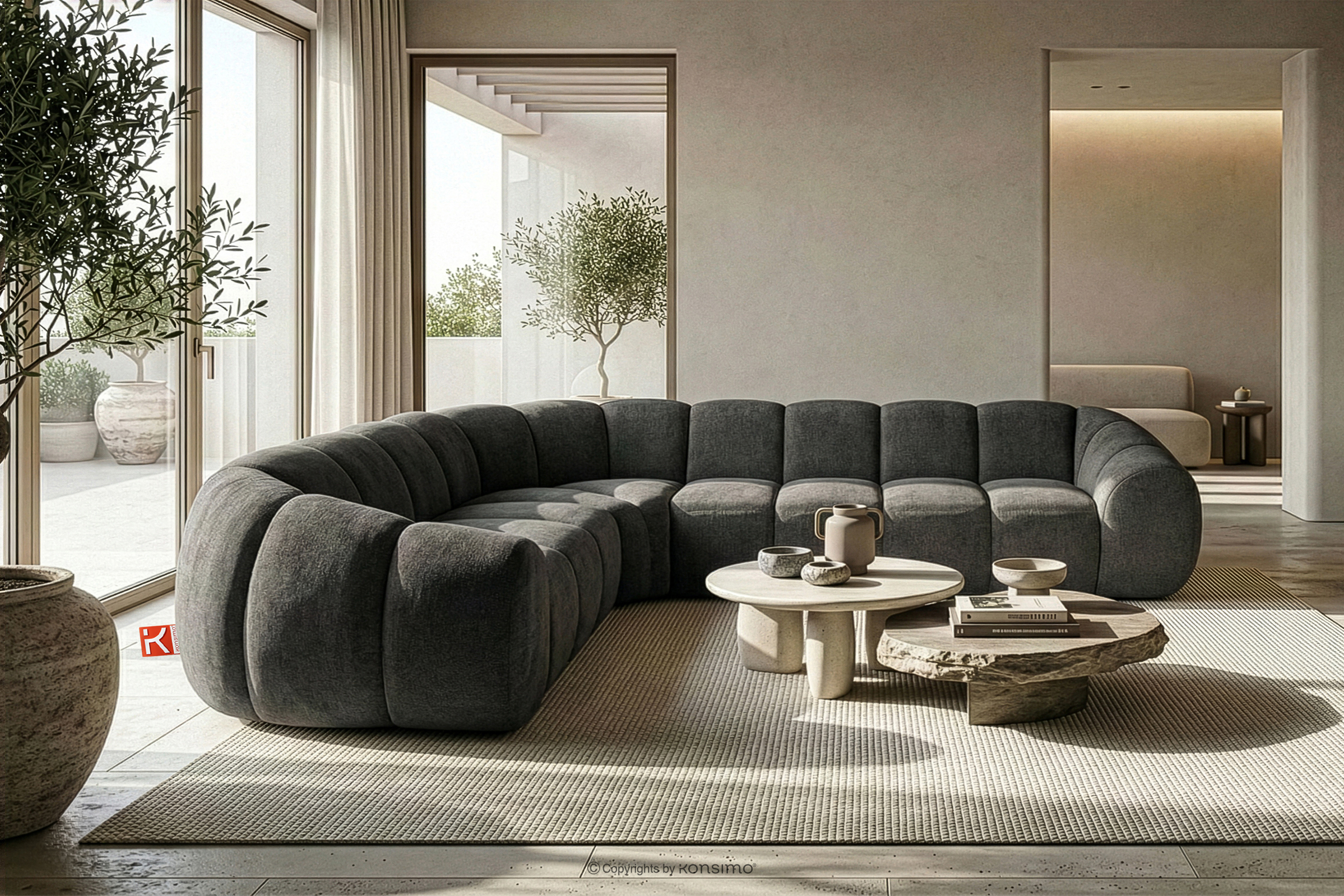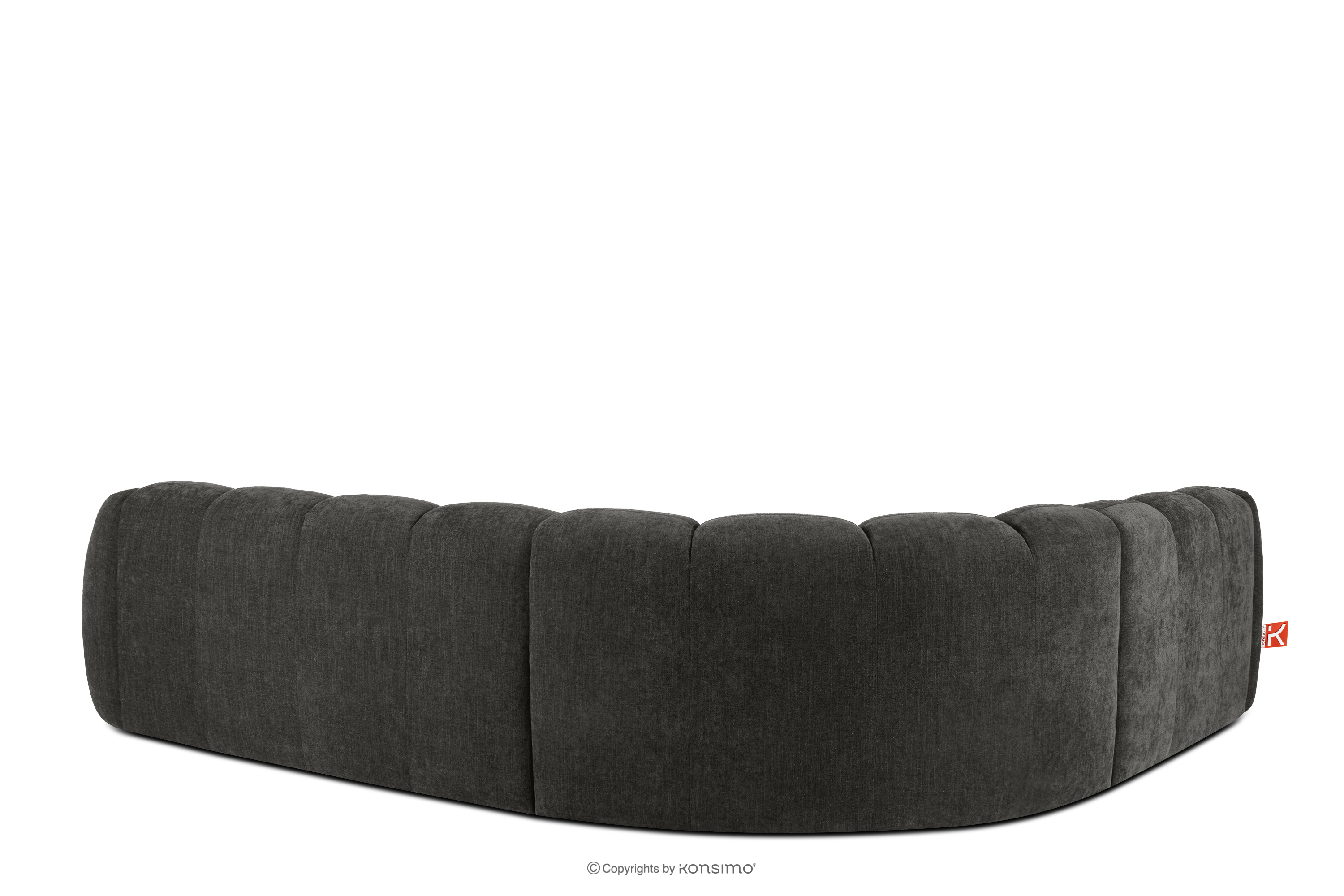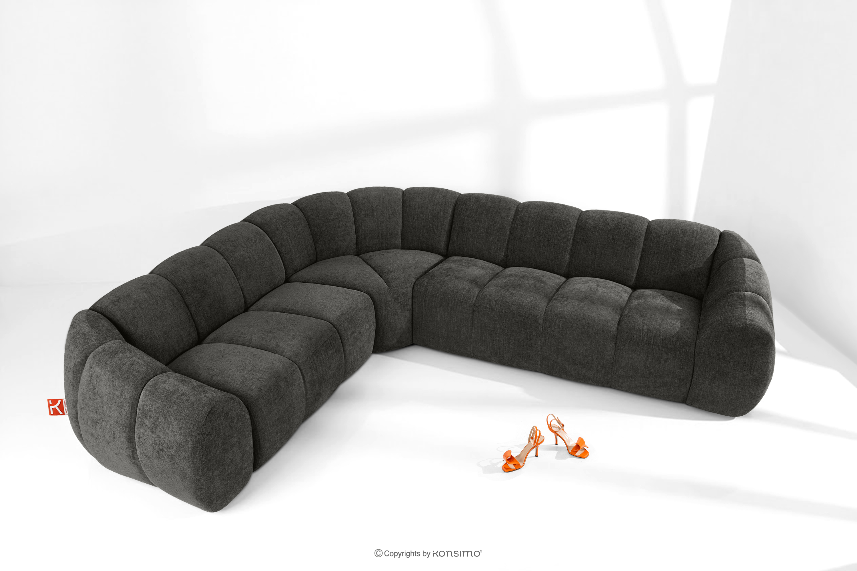Großes gestepptes Ecksofa im Retro-Modern-Stil links graphit verkörpert die Essenz einer modernen Interpretation des Retro-Modern-Stils, in dem weiche, organische Formen auf die kompromisslose Funktionalität zeitgenössischen modularen Designs treffen. Jedes Element dieser Serie wurde mit dem Ziel entworfen, einen harmonischen Raum zu schaffen, der die weichen Linien und den geometrischen Rhythmus zelebriert, die für die Designikonen der 70er Jahre charakteristisch sind, jedoch in einer aufgefrischten, luxuriösen Version.