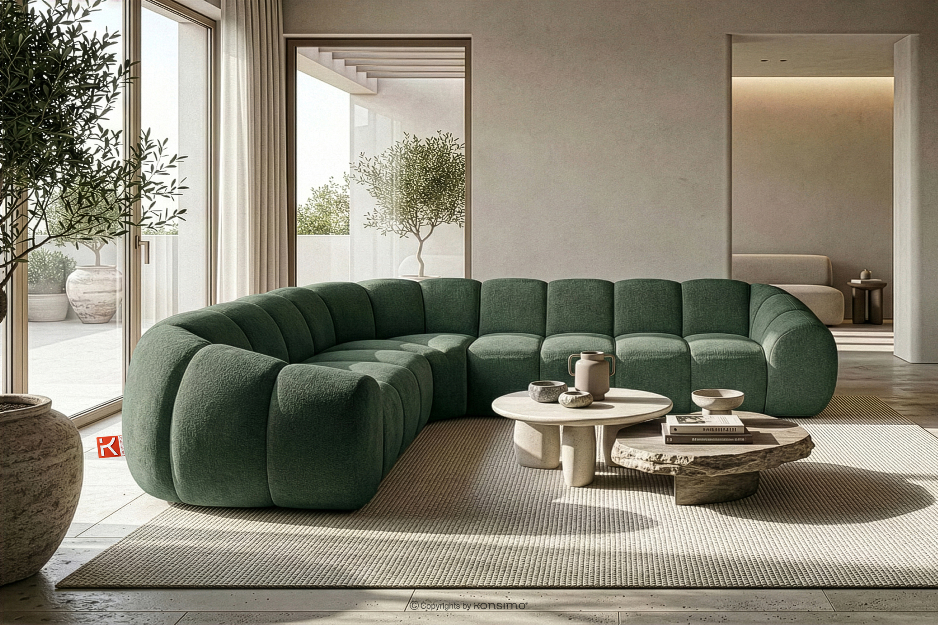 Großes gestepptes Ecksofa im Retro-Modern-Stil links dunkelgrün verkörpert die Essenz einer modernen Interpretation des Retro-Modern-Stils, in dem weiche, organische Formen auf die kompromisslose Funktionalität zeitgenössischen modularen Designs treffen. Jedes Element dieser Serie wurde mit dem Ziel entworfen, einen harmonischen Raum zu schaffen, der die weichen Linien und den geometrischen Rhythmus zelebriert, die für die Designikonen der 70er Jahre charakteristisch sind, jedoch in einer aufgefrischten, luxuriösen Version.