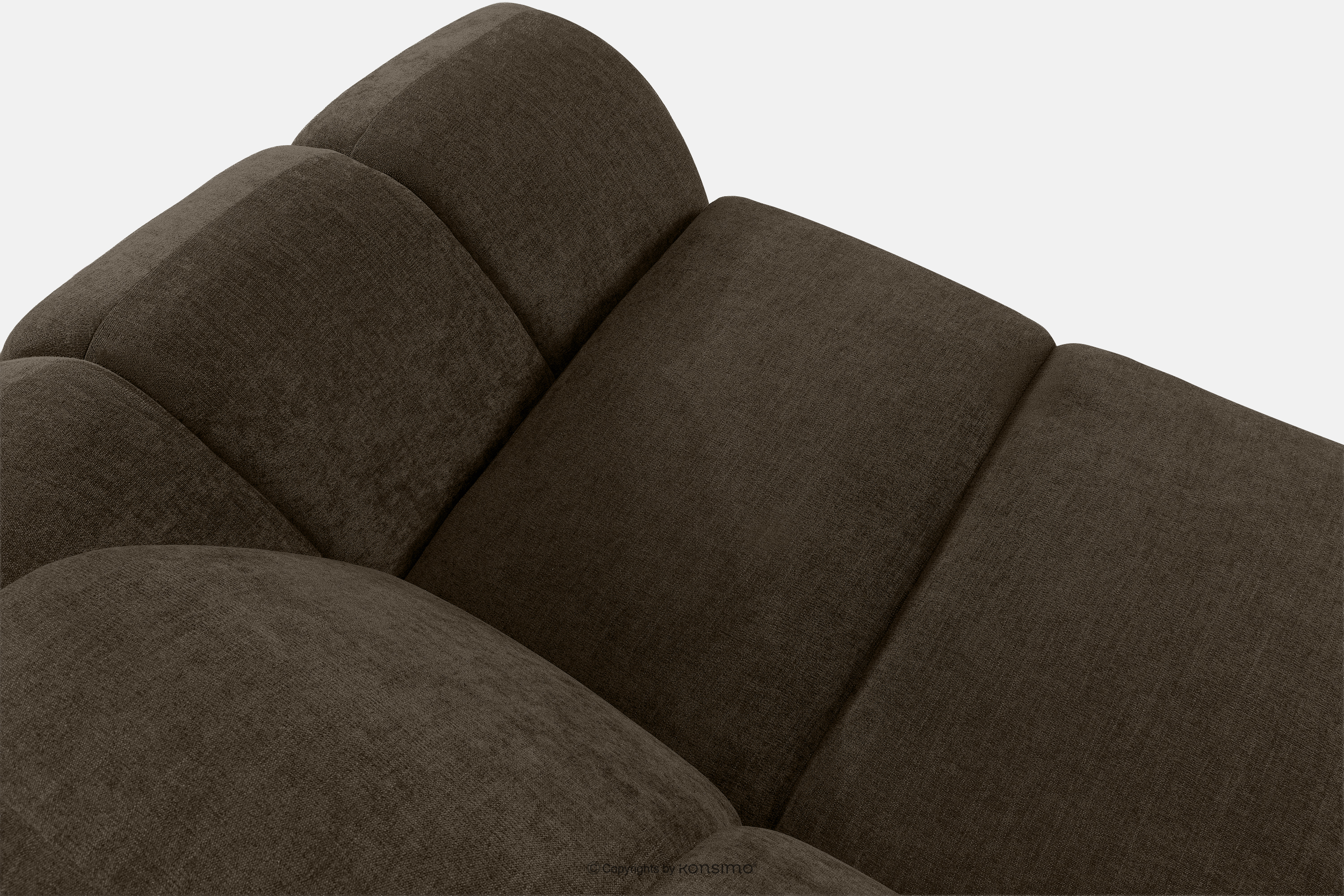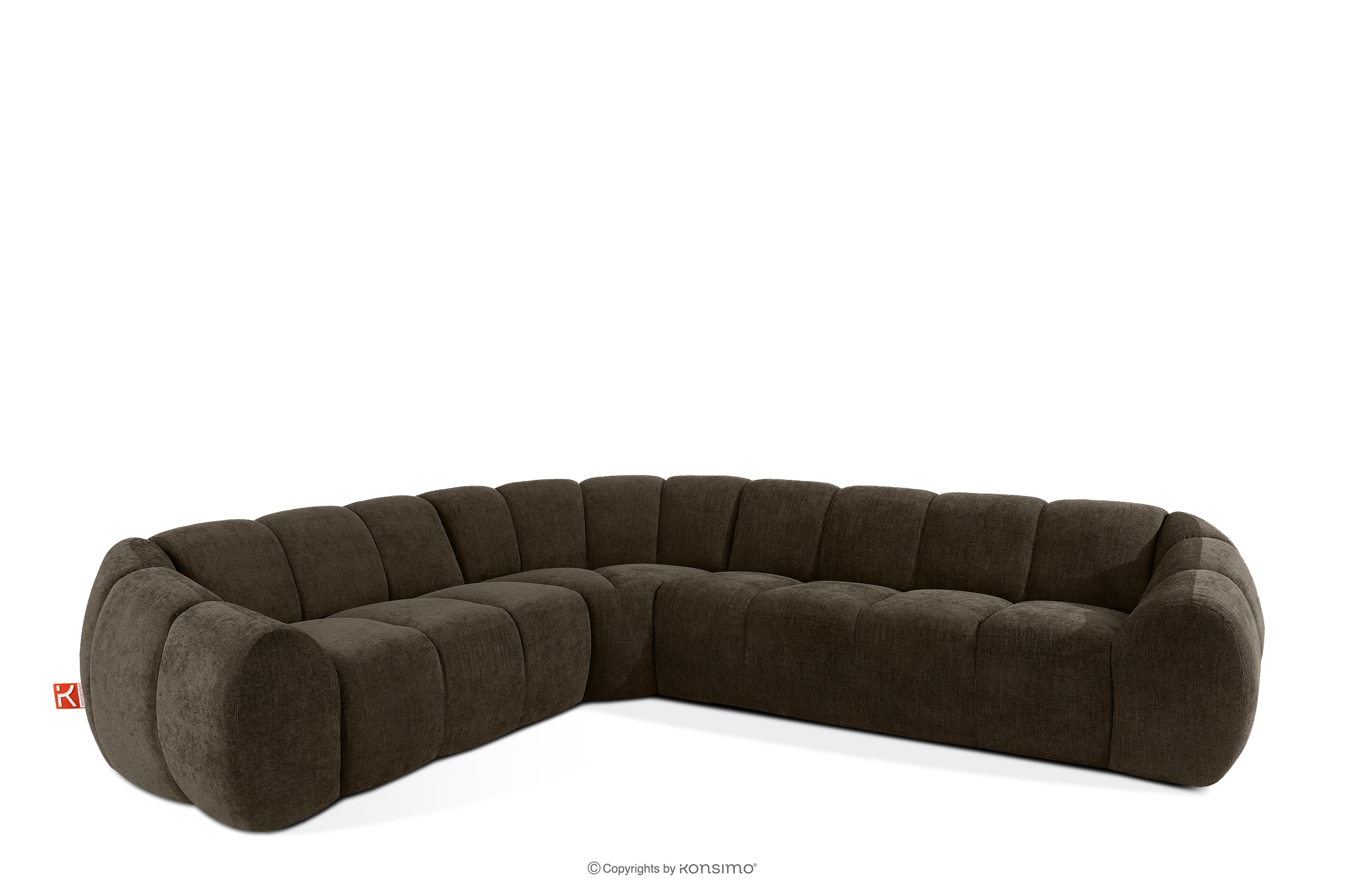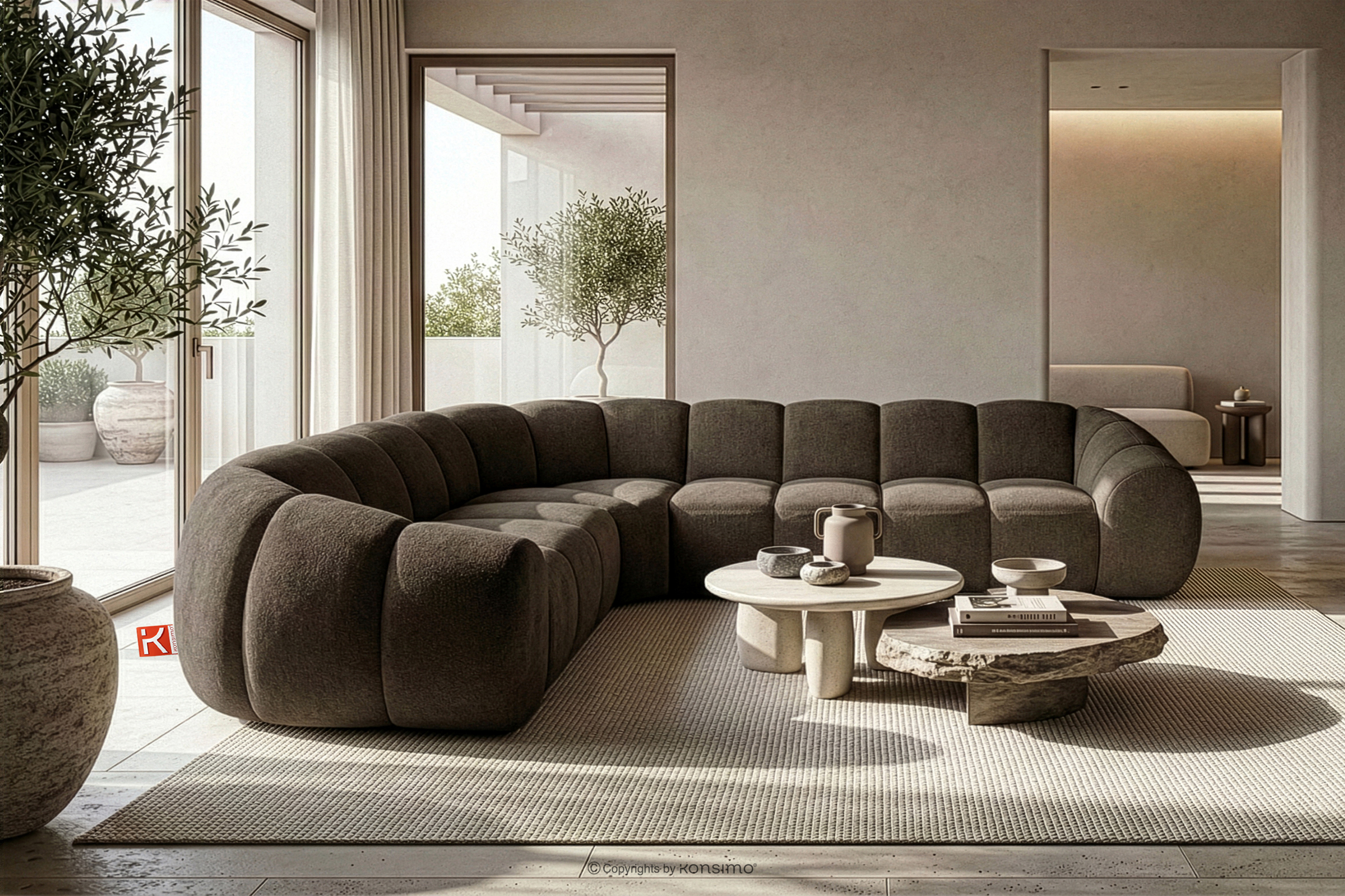 Großes gestepptes Ecksofa im Retro-Modern-Stil links braun verkörpert die Essenz einer modernen Interpretation des Retro-Modern-Stils, in dem weiche, organische Formen auf die kompromisslose Funktionalität zeitgenössischen modularen Designs treffen. Jedes Element dieser Serie wurde mit dem Ziel entworfen, einen harmonischen Raum zu schaffen, der die weichen Linien und den geometrischen Rhythmus zelebriert, die für die Designikonen der 70er Jahre charakteristisch sind, jedoch in einer aufgefrischten, luxuriösen Version.
