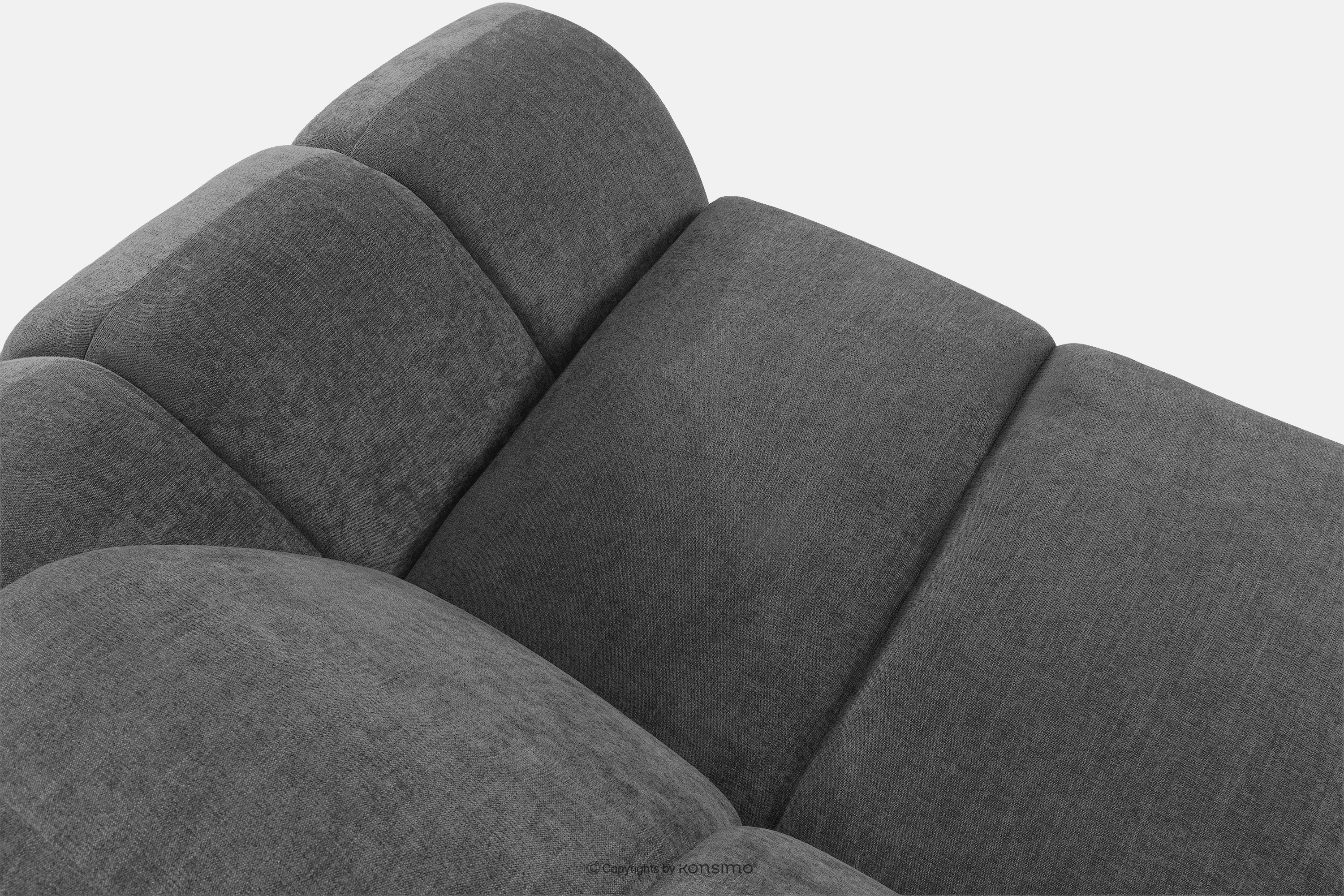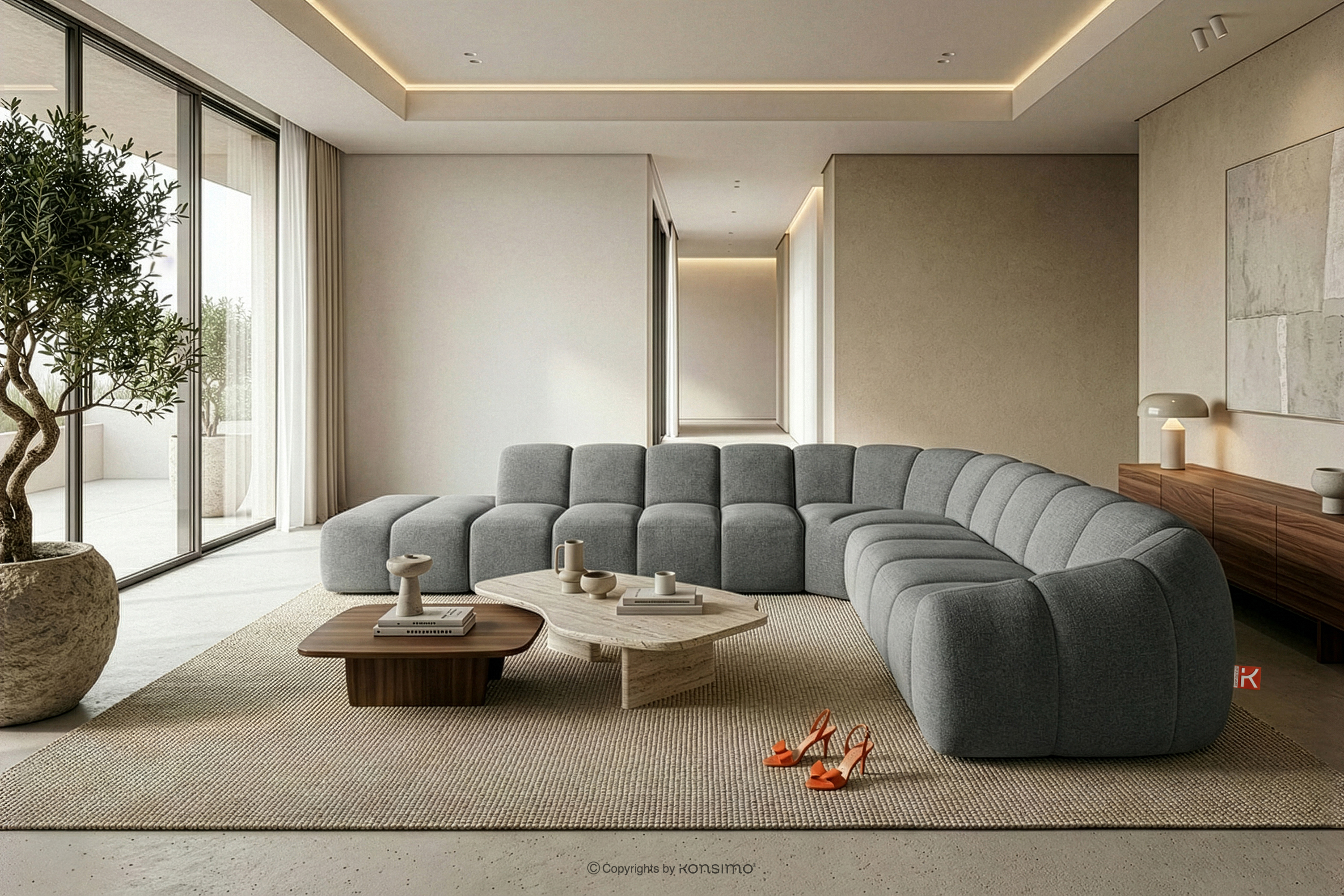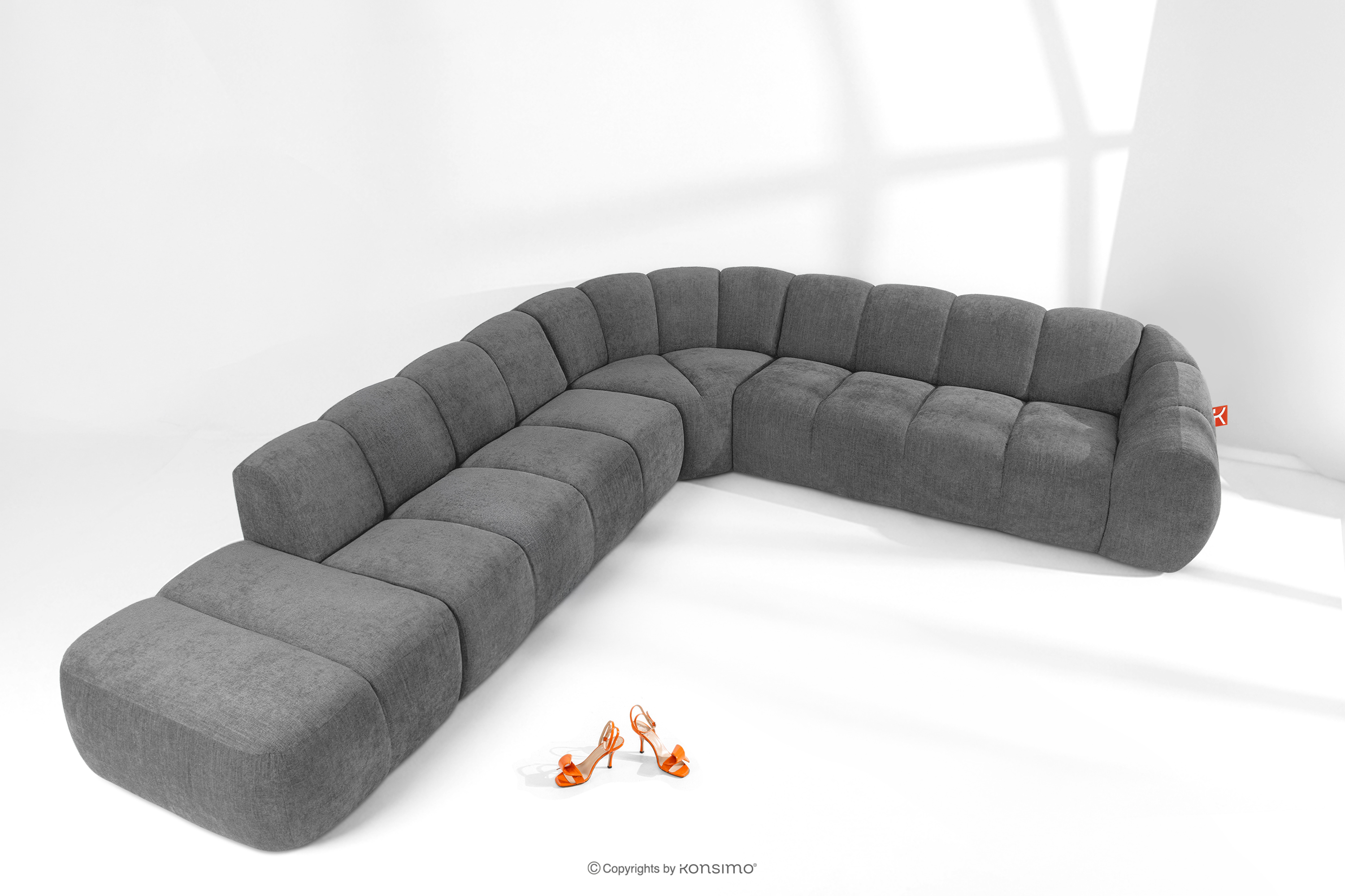 Modulares Ecksofa Curve im Retro-Modern-Stil links grau verkörpert die Essenz einer modernen Interpretation des Retro-Modern-Stils, in dem weiche, organische Formen auf die kompromisslose Funktionalität zeitgenössischen modularen Designs treffen. Jedes Element dieser Serie wurde mit dem Ziel entworfen, einen harmonischen Raum zu schaffen, der die weichen Linien und den geometrischen Rhythmus zelebriert, die für die Designikonen der 70er Jahre charakteristisch sind, jedoch in einer aufgefrischten, luxuriösen Version.